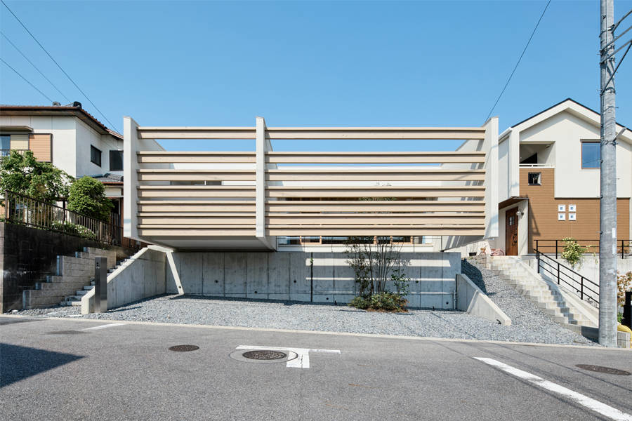 そこで今回は2筆の敷地全体に単一方向の構造耐力を100%担う壁を3枚だけ並べることとした。この壁に2人で暮らすために必要な分のボリュームを取り付けることでコンパクトな住空間をつくり、既存の擁壁を超え道路先まで伸びることによって残りの敷地までをも体感的に内部空間へ取り込むことができないかと考えた。この既存の上段と下段に分ける宅地造成によって「3枚の壁」は跳ね出して浮く形式となり、必然的にフットプリントは抑えられ基礎面積が減ることで限られた予算内でうまく敷地全体を利用できるようになる。