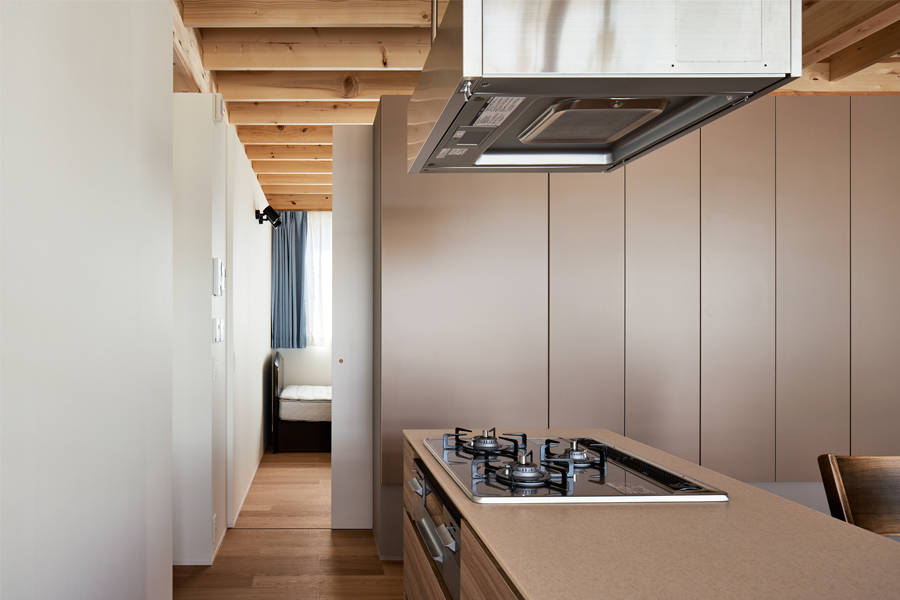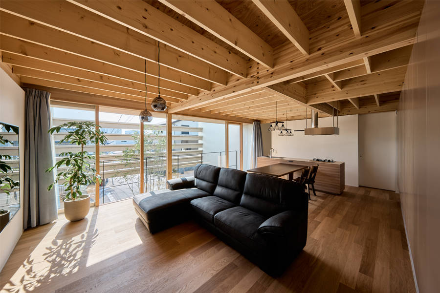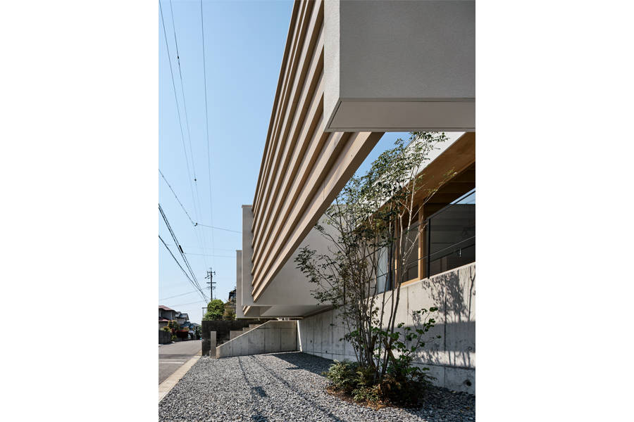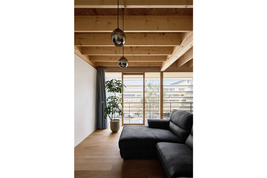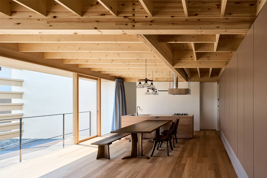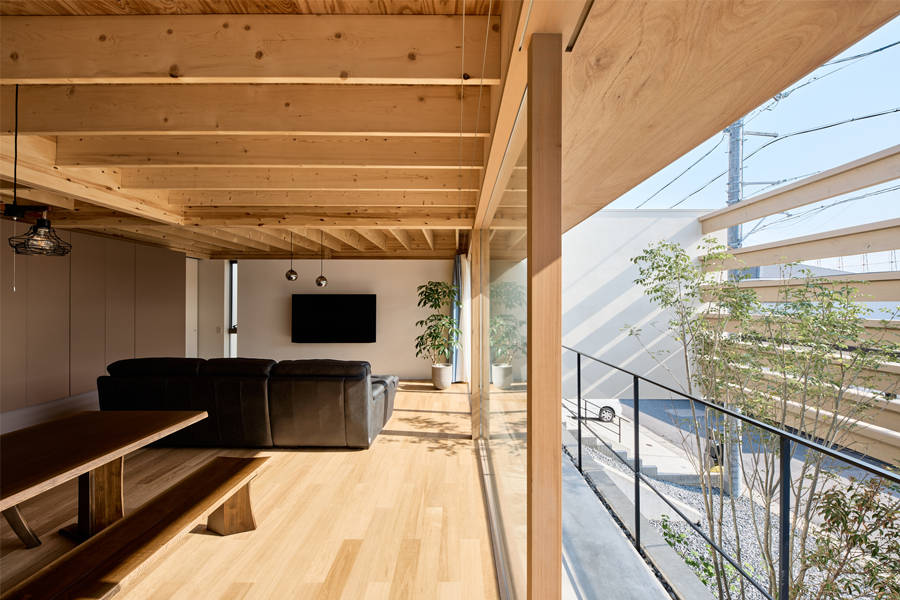 道路側ファサードで木部材をT型に合成した「T-joint-beam」によって3枚の壁を繋ぐことで単一材では弱軸となる横からの風圧にも抵抗する計画とし、木部材の合成はGIR(グルード・イン・ロッド)接合とすることで金物の露出をせず小断面の梁だけで7.28mを掛け渡すことが可能となった。この「T-joint-beam」を掛ける間隔に少し変化を与えることで道路からの視線を遮りながら遠くまでの景色を望むことができる。その立つ位置や視線の高さによって街や景色の見え方が微妙に変化し、物理的な壁でなく感覚的な距離によって街との繋がりを意識する家となった。