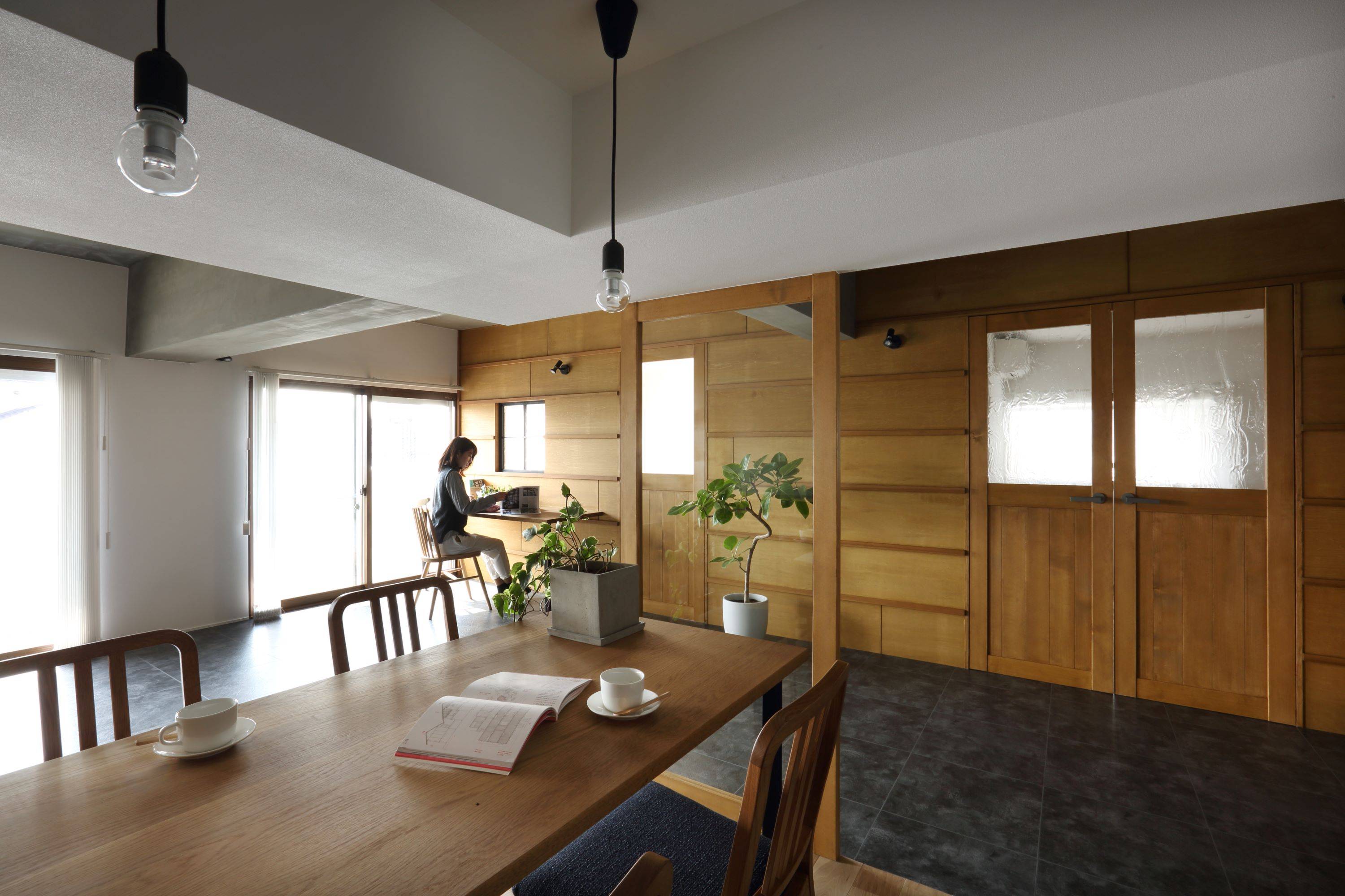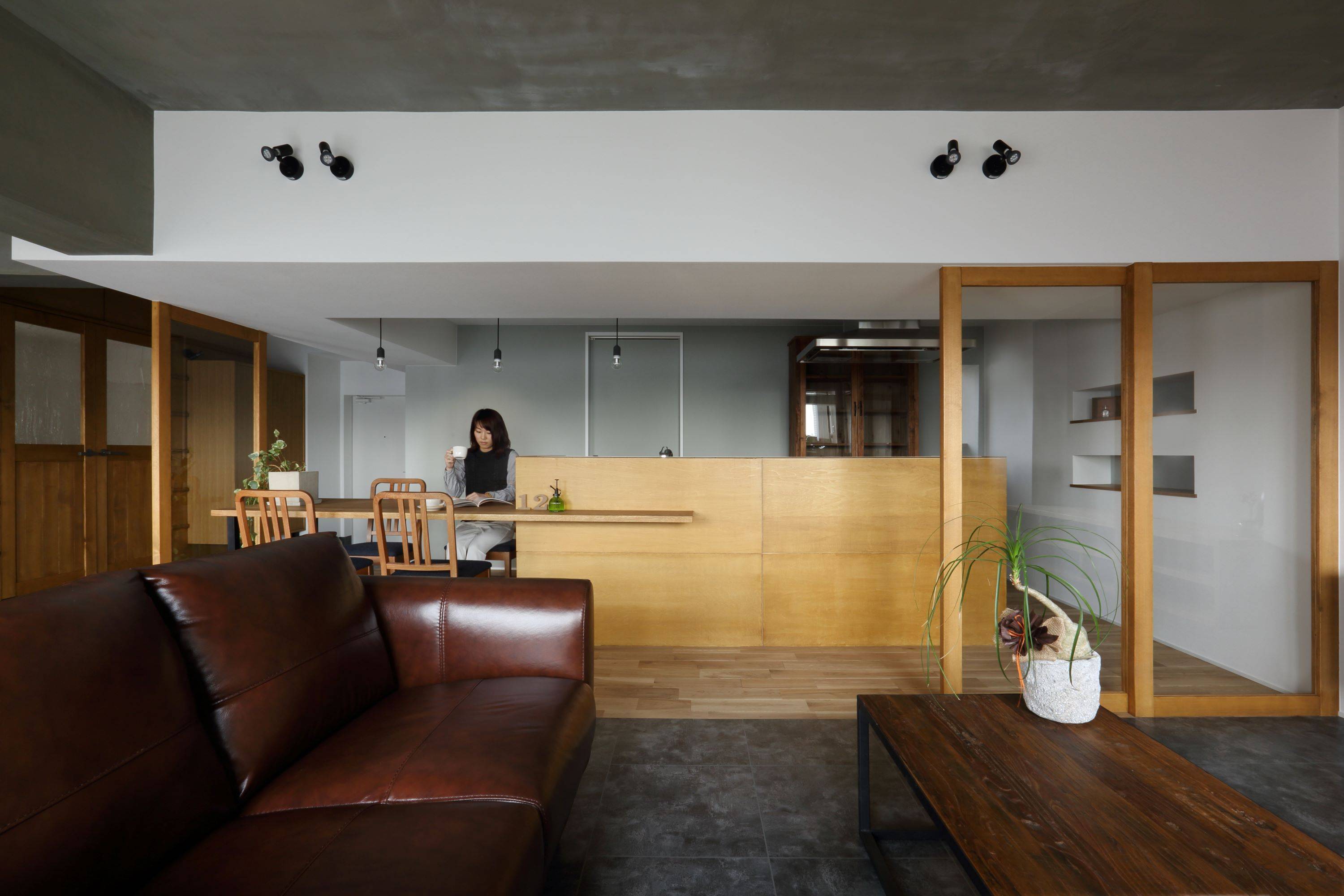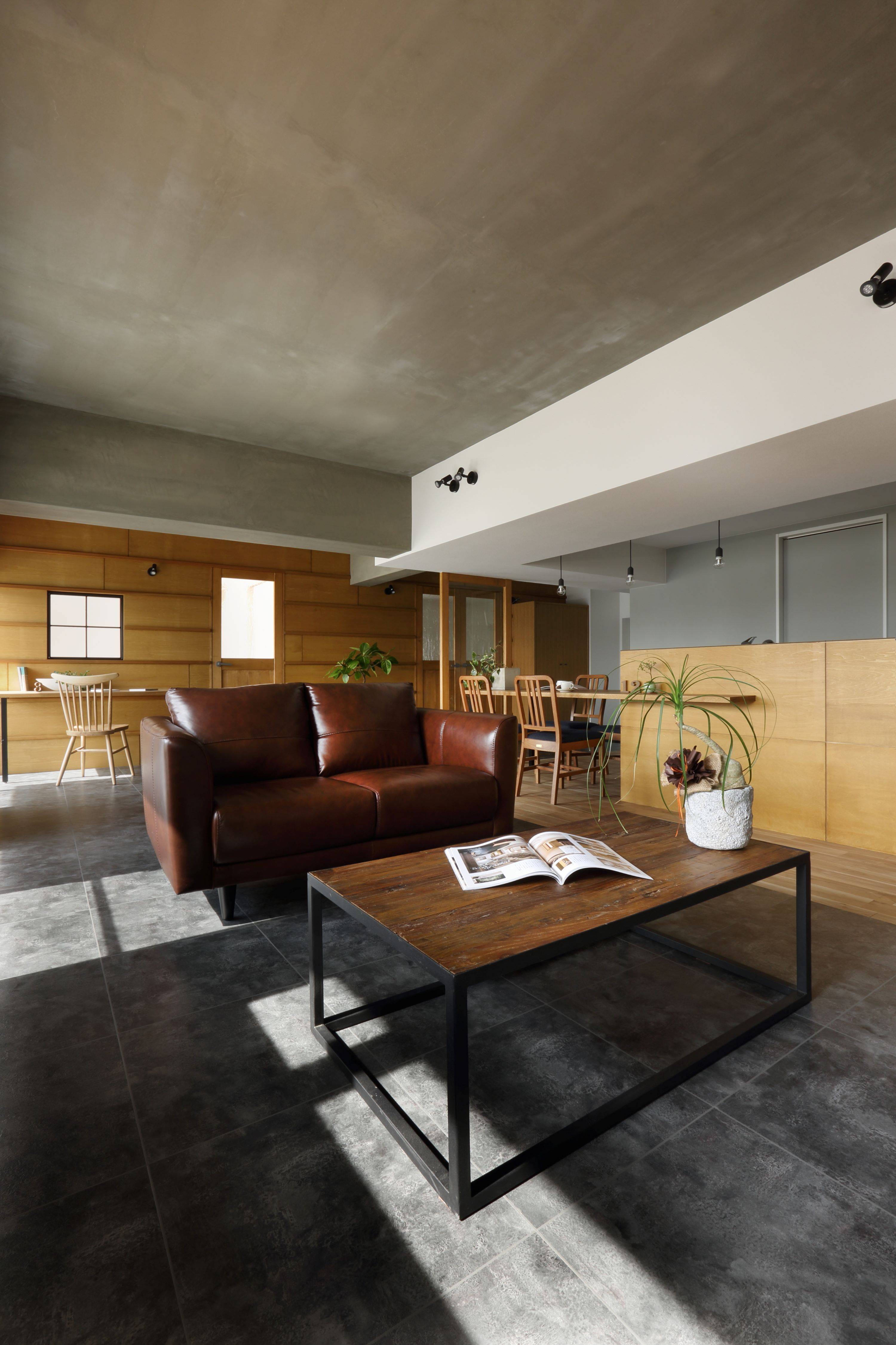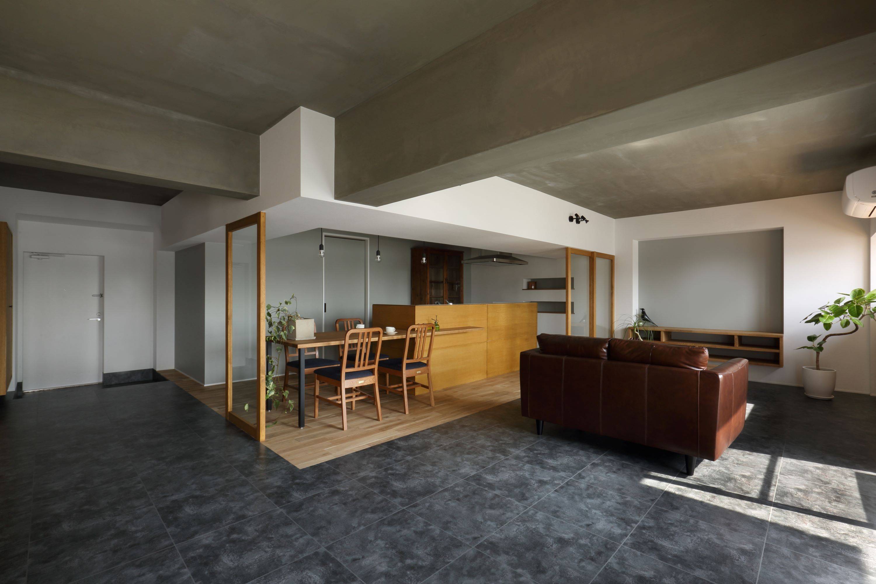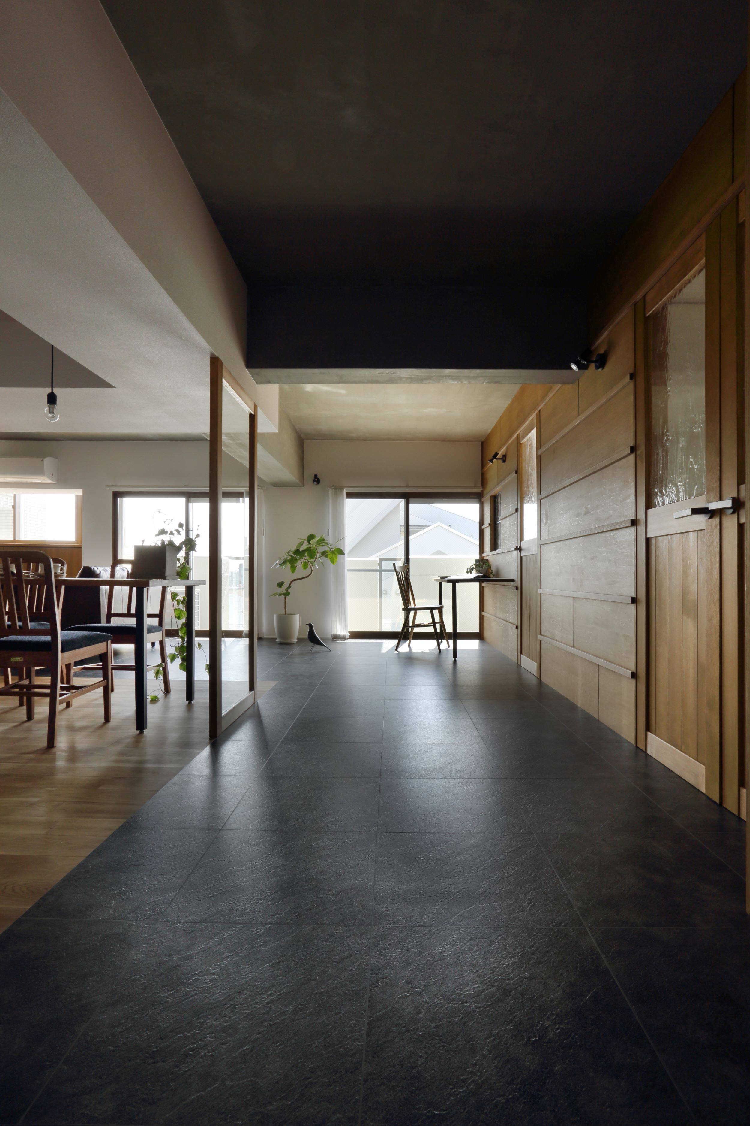 そこで、密閉されたマンションの中でリビング空間を外部的要素にデザインすることにより「テラスのような、坪庭のような、室内のような、室外のような空間」をつくりました。