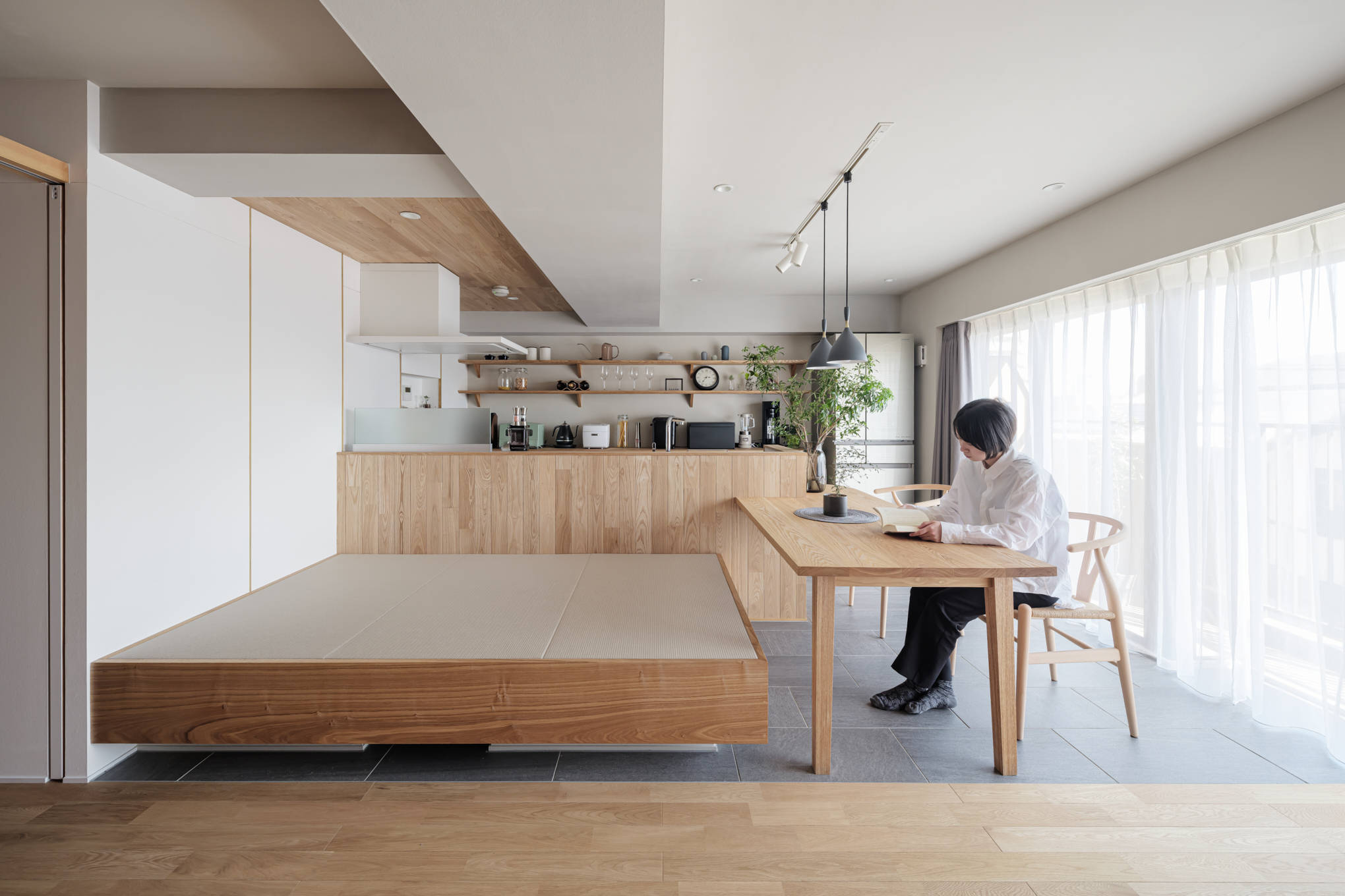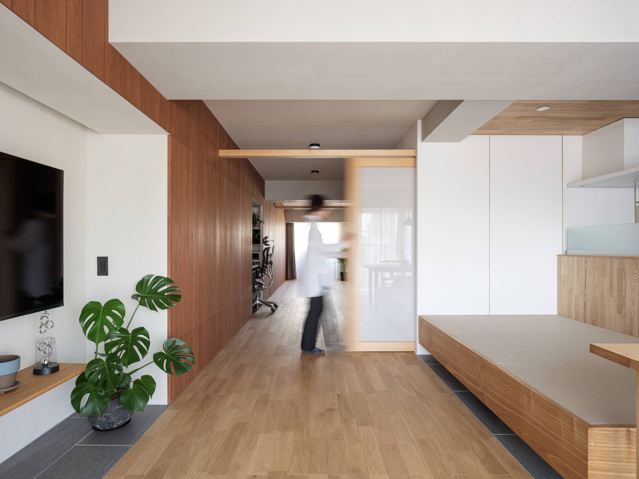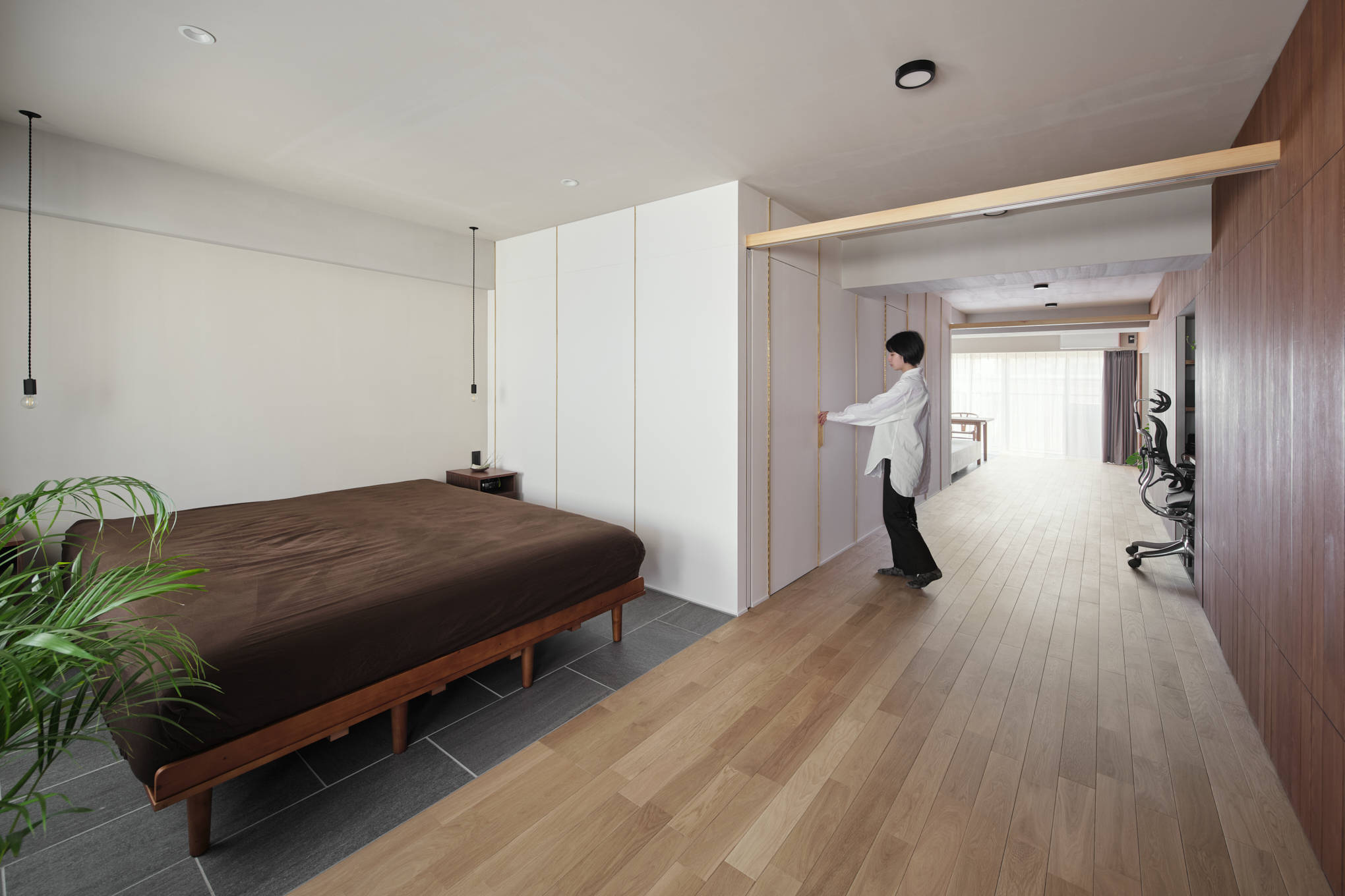 日本のマンションでは、一般的に明るい南側にリビングを配置し、暗い北側には個室を置くことが多くある。しかし、この配置によって光や風の取り入れに部屋間での格差が生じていると感じた。そのことから京長屋の通り庭をヒントに南北に貫通した「通り部屋」という環境を作り出す空間を挿入した。通り部屋は、元々配置されていた南北の掃出し窓をストレートに貫通するように配置し、南側から北側まで風や光が直接通り抜けるようになっている。これにより、居室全体に光や風が行き渡り、より快適な環境が実現された。この環境を整える意識を住まいの中でより強く実感してもらうために、「通り部屋」の床を進行方向に目地を持ったフローリング、それ以外の床をタイル張りとしている。また、通り部屋は柔軟性が高く、二本の引き込み建具によってリビングや寝室の大きさを自在に変更できるため、時々の生活スタイルやニーズに合わせて空間をカスタマイズすることが可能である。住みやすさとは部屋の数や大きさなどの数字で決まるのではなく、体感して初めてわかる部屋の質で決まると信じて考えた住宅である。