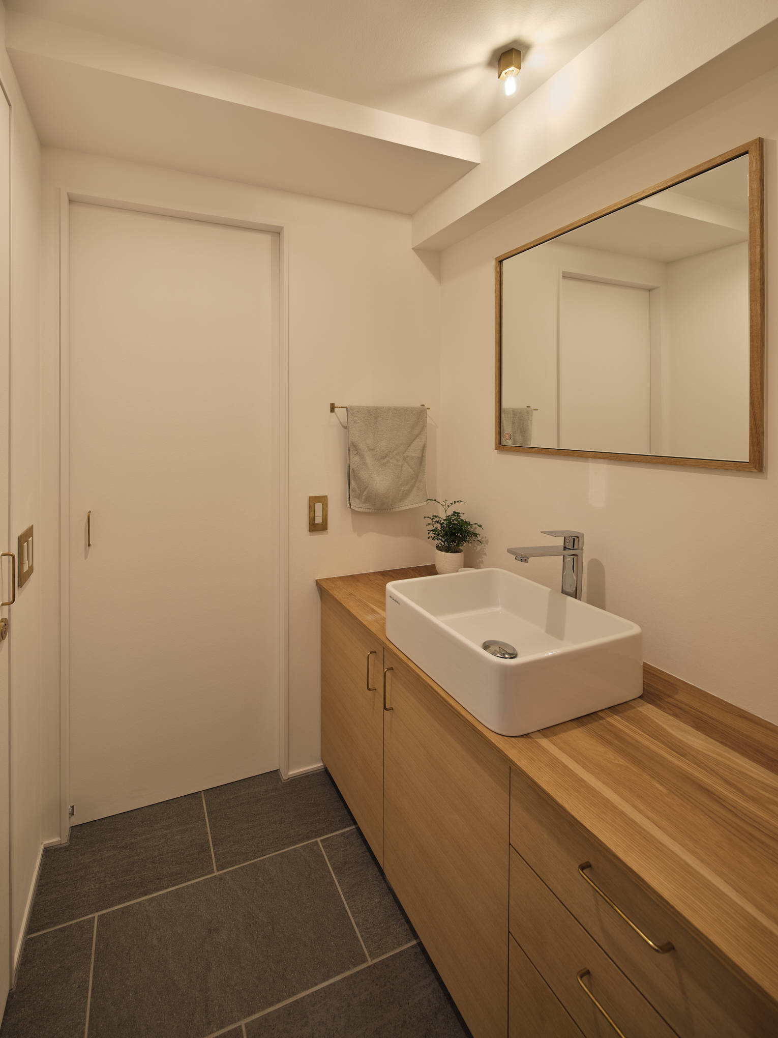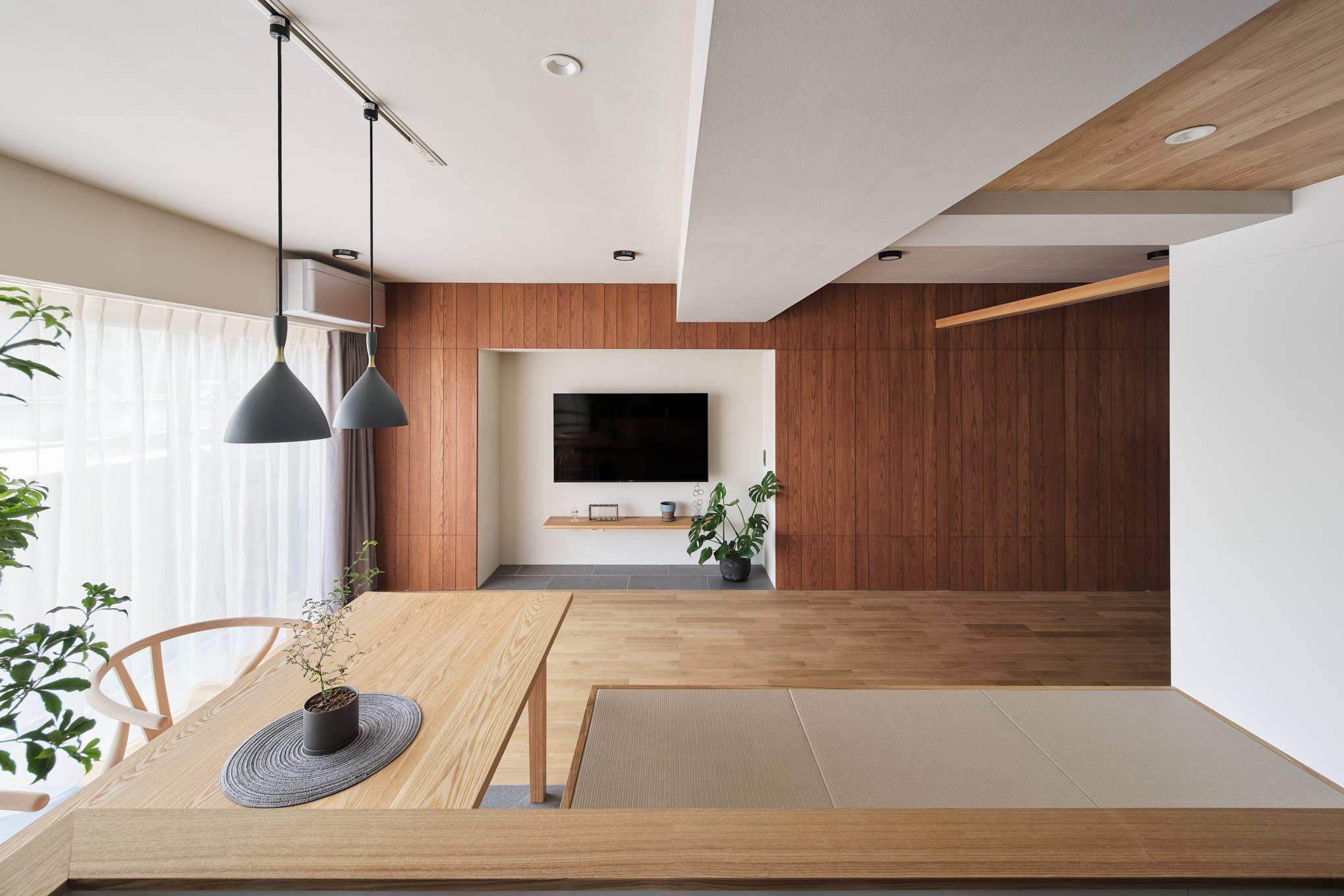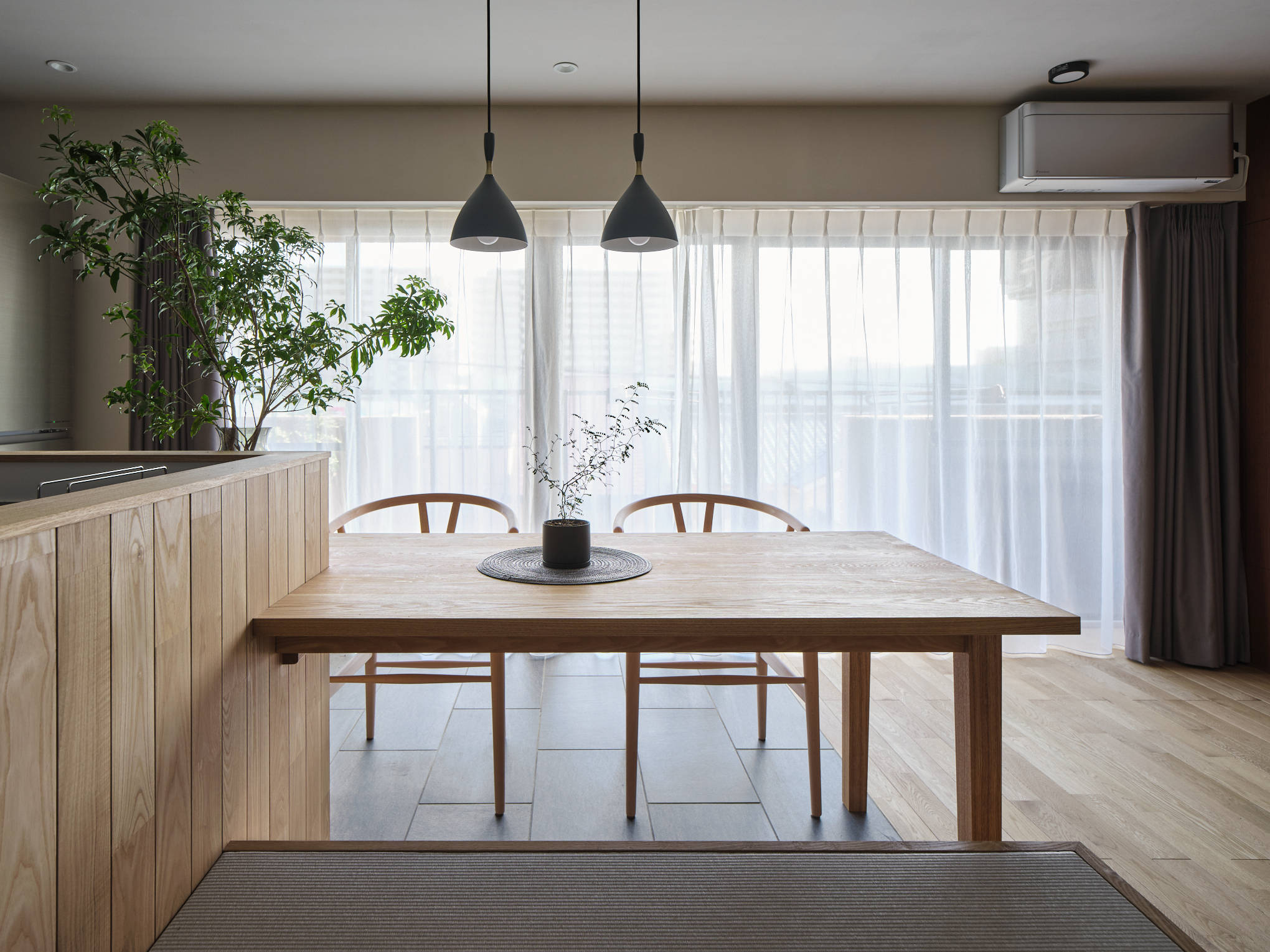 日本のマンションでは、一般的に明るい南側にリビングを配置し、暗い北側には個室を置くことが多くある。しかし、この配置によって光や風の取り入れに部屋間での格差が生じていると感じた。そのことから京長屋の通り庭をヒントに南北に貫通した「通り部屋」という環境を作り出す空間を挿入した。通り部屋は、元々配置されていた南北の掃出し窓をストレートに貫通するように配置し、南側から北側まで風や光が直接通り抜けるようになっている。これにより、居室全体に光や風が行き渡り、より快適な環境が実現された。この環境を整える意識を住まいの中でより強く実感してもらうために、「通り部屋」の床を進行方向に目地を持ったフローリング、それ以外の床をタイル張りとしている。また、通り部屋は柔軟性が高く、二本の引き込み建具によってリビングや寝室の大きさを自在に変更できるため、時々の生活スタイルやニーズに合わせて空間をカスタマイズすることが可能である。住みやすさとは部屋の数や大きさなどの数字で決まるのではなく、体感して初めてわかる部屋の質で決まると信じて考えた住宅である。