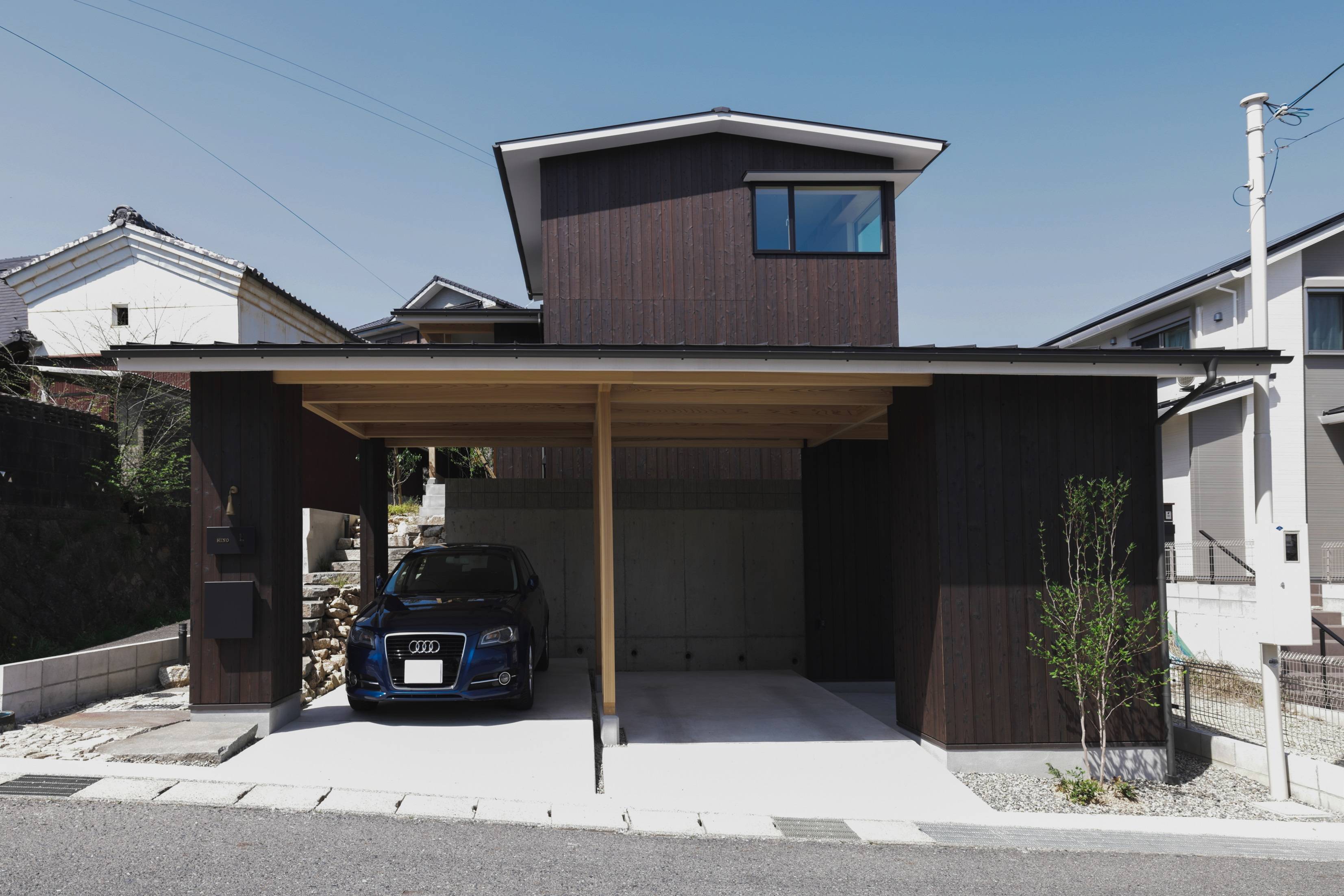 道路との高低差があるため、周囲に対して圧迫感のでない建物計画をする必要がありました。そのため道路レベルにガレージを設け、建物と一体化した意匠と屋根形状にすることにより、なるべく自然とまじわるように設計しました。