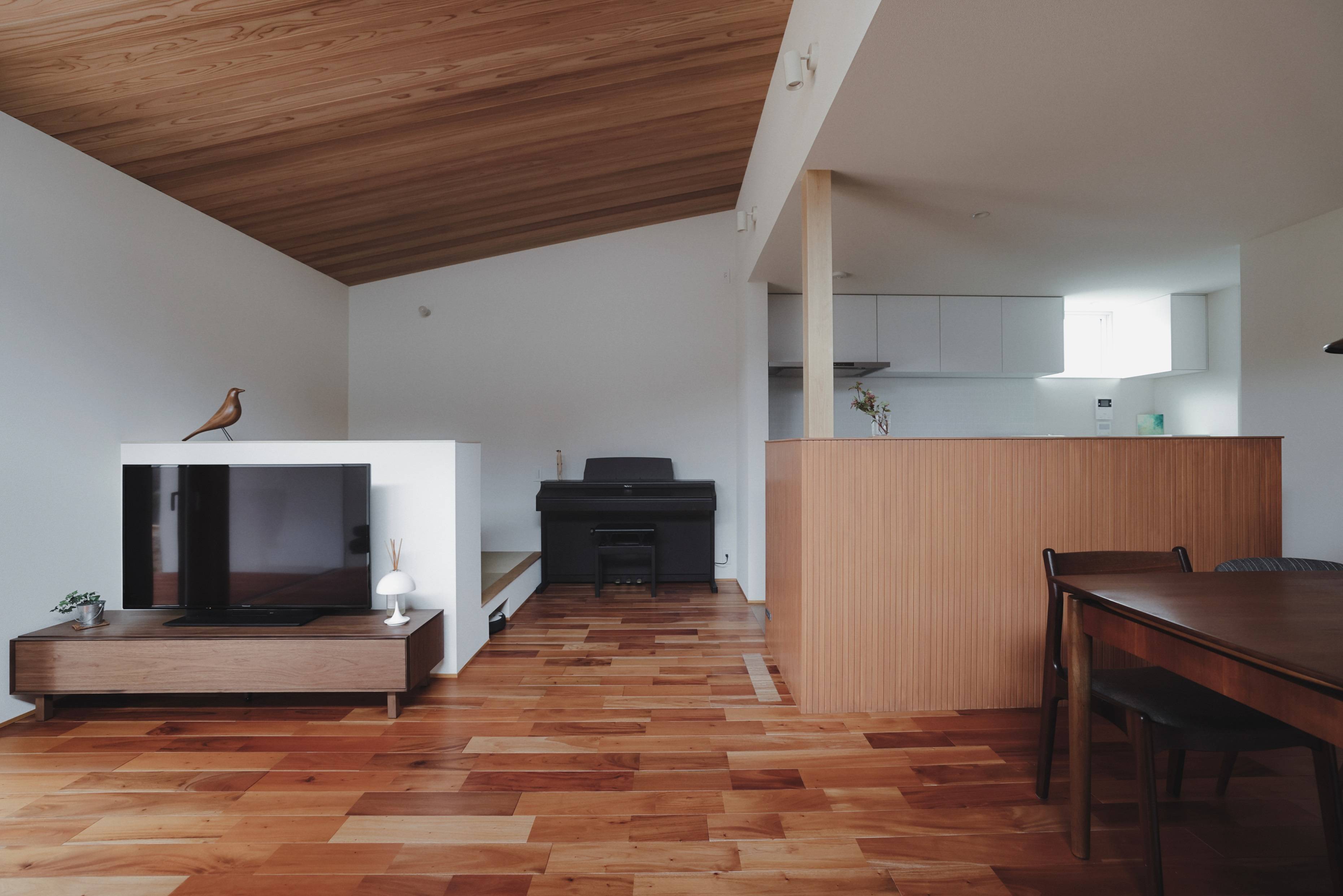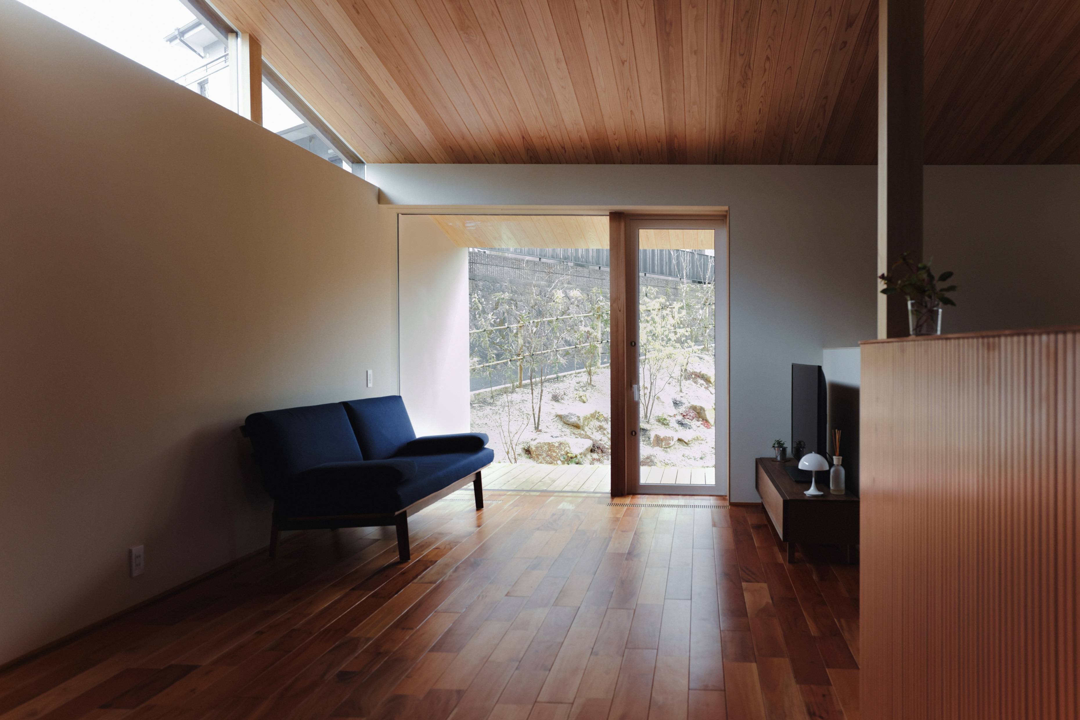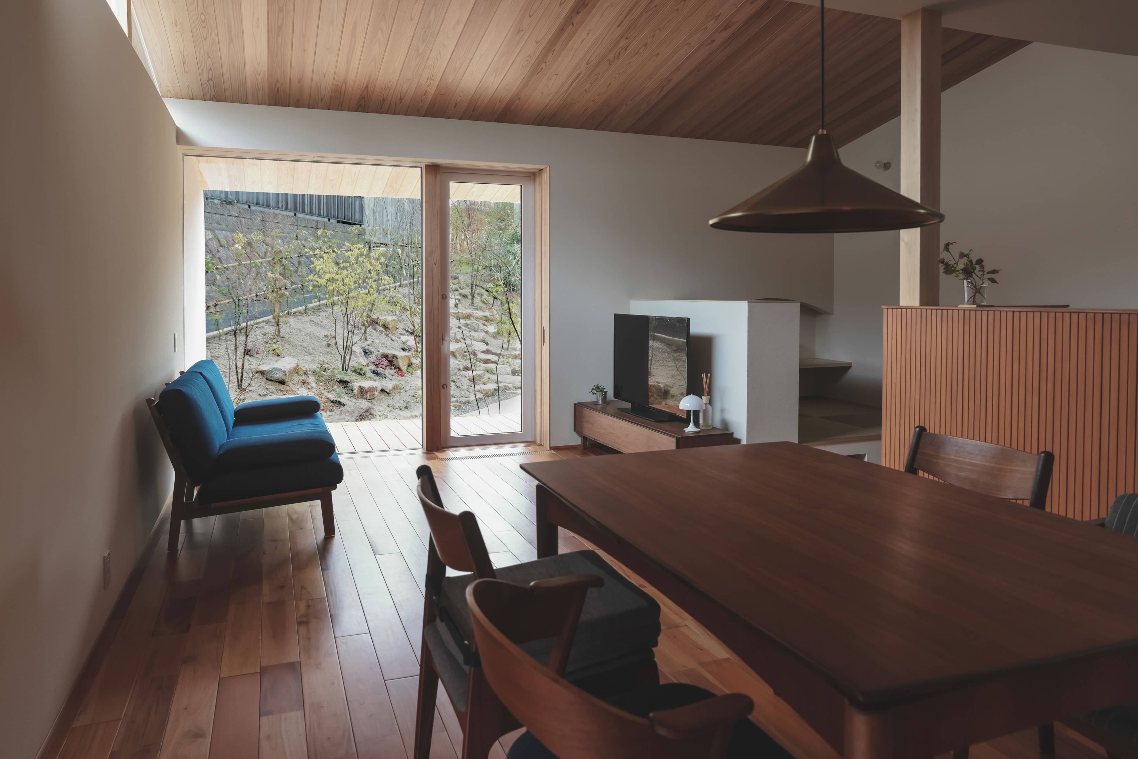 道路面にはあまり開口を設けず、内部に入ると共に裏庭への開いた空間へと繋がるダイニング・リビングスペースを設けています。