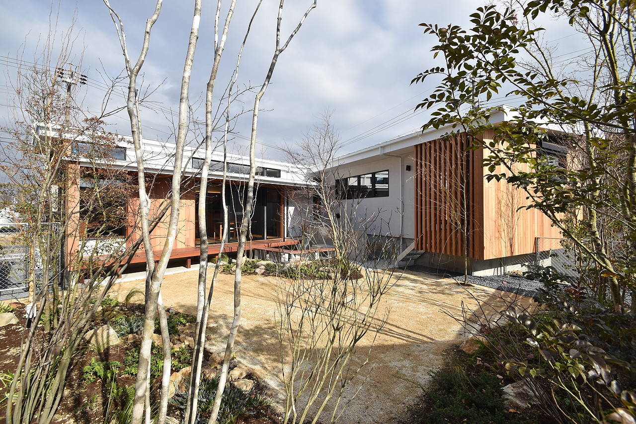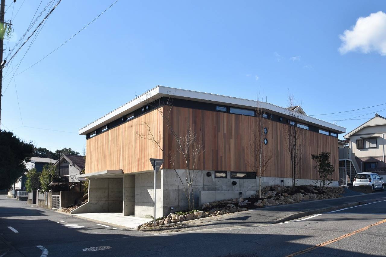 2つの道路に最大2mの高低差で接する敷地へ建築した住宅。できる限り外部空間を確保することと高低差の大きい道路側に駐車場を設けることを望まれながら、敷地は道路に法面で接し、さらに宅地造成規制を受けていたため、平らな土地を作るためにはコストのかかる土留め擁壁が必要と予想されました。そこで建物に土留め擁壁の機能を持たせ、擁壁に費用をかけないように提案させて頂きました。建物を土留めにするには土にかかる部分をコンクリート造とする必要がありコストがかかりますが、擁壁を作るより合理的で敷地を活かせると判断しました。地上部分は木造としています。その発想から道路に面してL型に建物を配置し、高低差を解消するため一部を地下にしています。地下は低い道路に必要とされていた駐車場の上に建物を載せれば屋根代わりになるという兼ねる発想でもあります。これらの考えからこの住宅は平面的にも立面的にも地形に沿うようにカタチが出来上がって行きました。