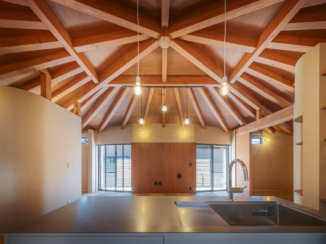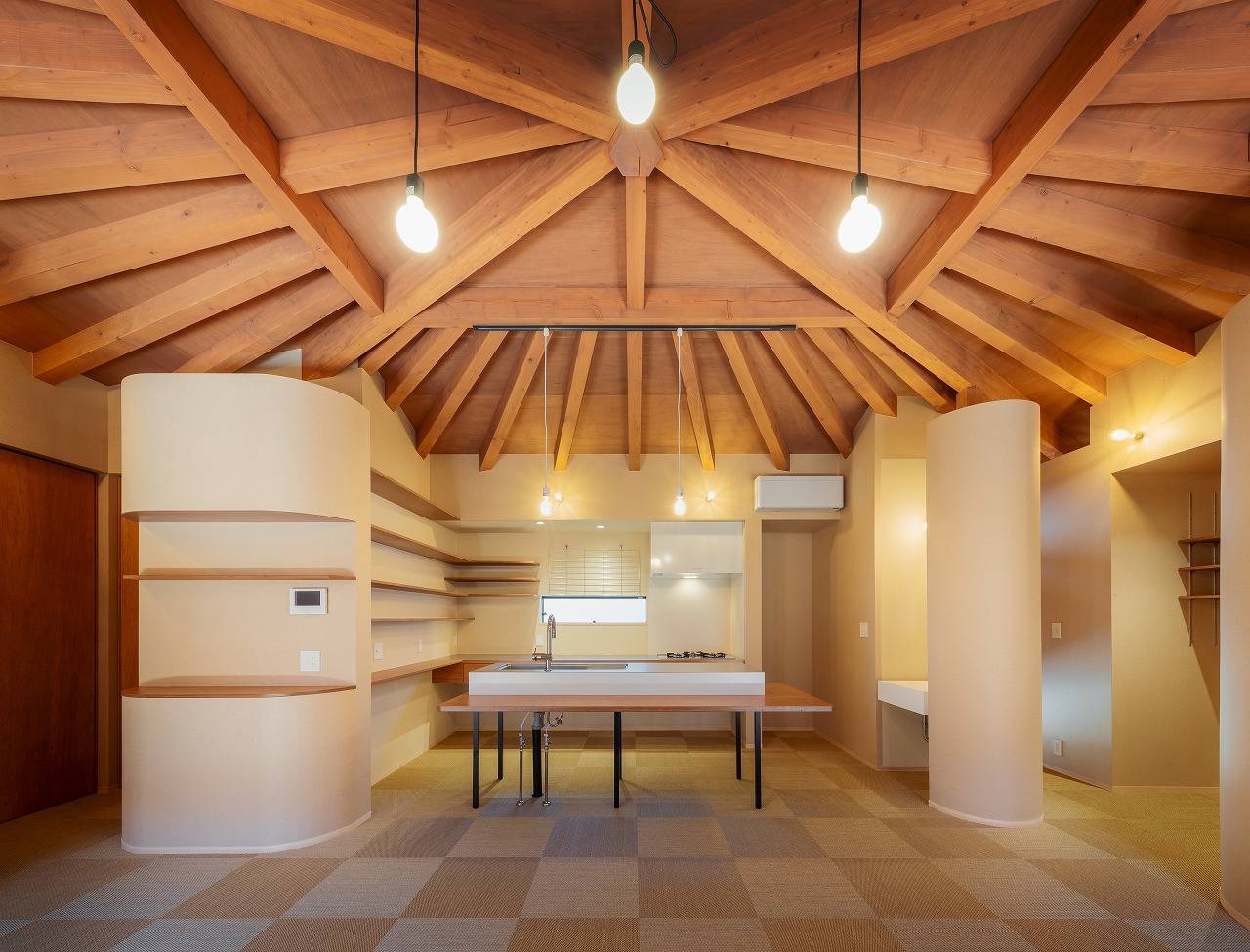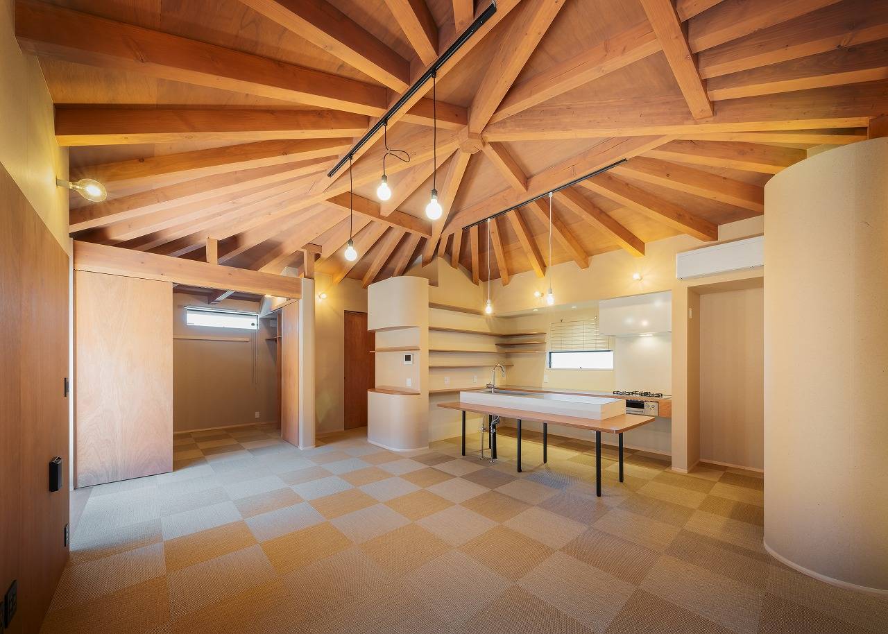 内部空間は中央が頂点となる天井をどこからでも感じとってもらいたいと壁は天井まで上げず、視線を遮りながら空間をつなぎ、中央にあるLDKに柱を落とさずに広い空間を作ろうと「かぶら束」を使い無柱空間を実現しました。またそこに向かう構造材を扇状に配置したことがより中央に向かう意識を強くし、「一室の家」の思いを強くしてくれました。