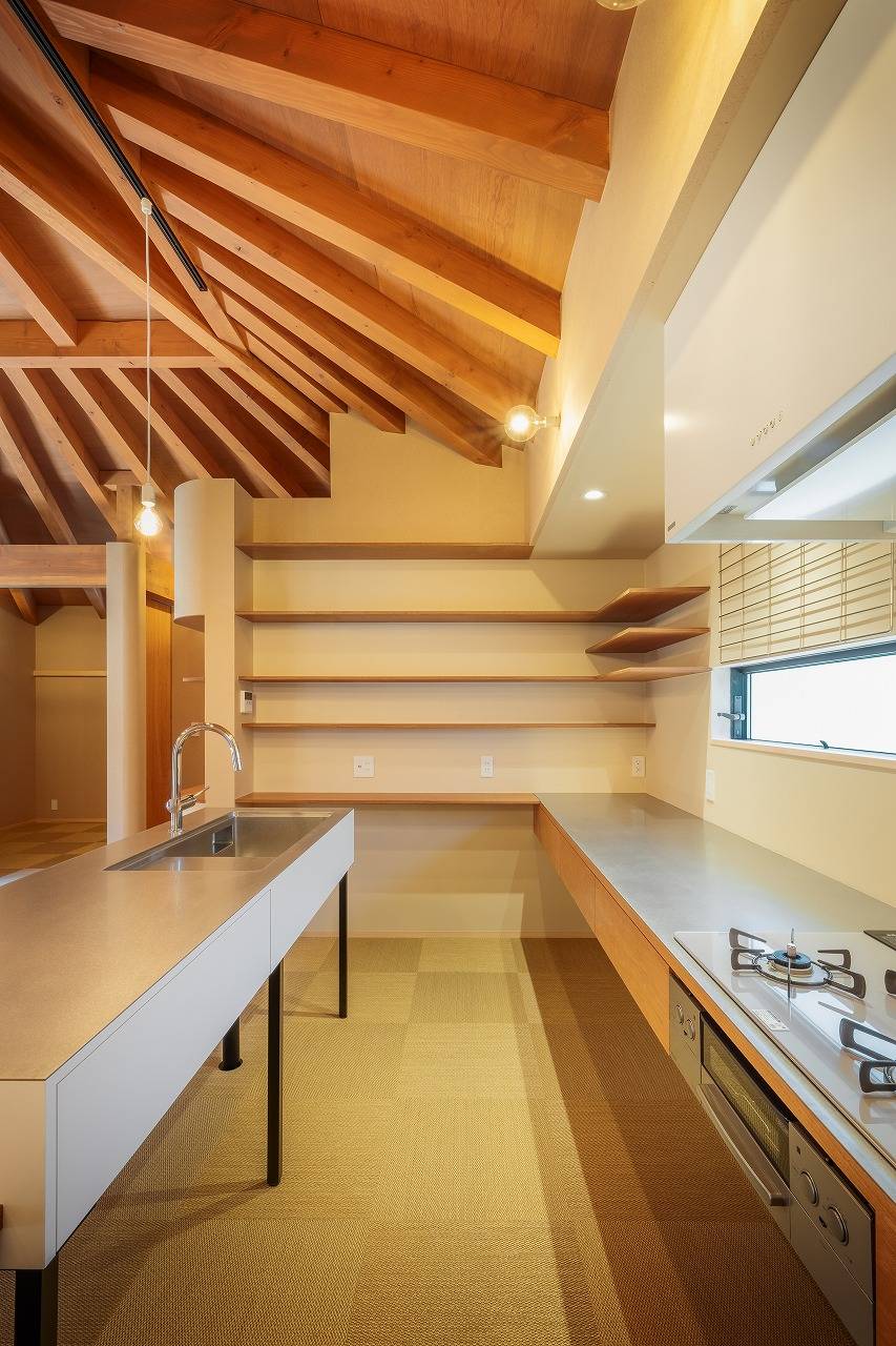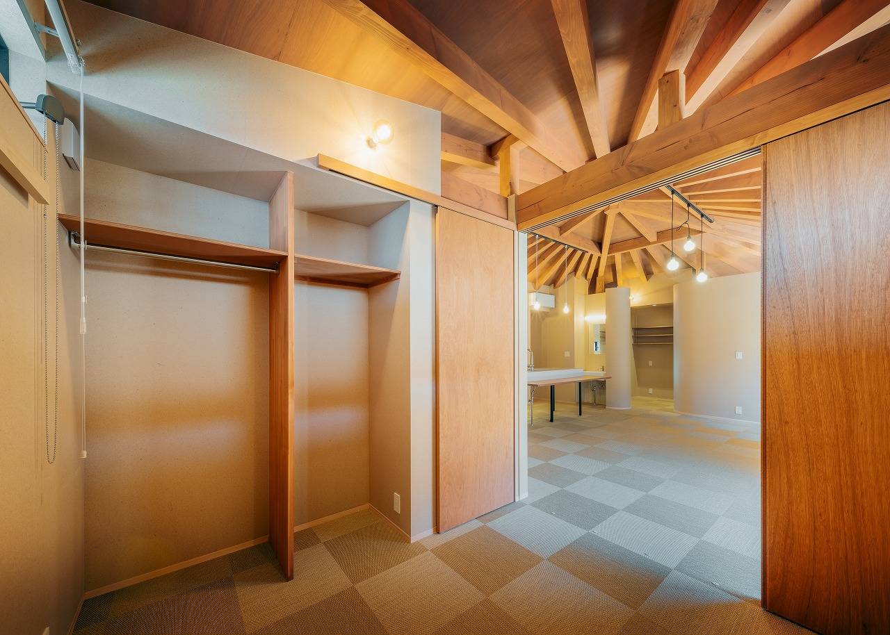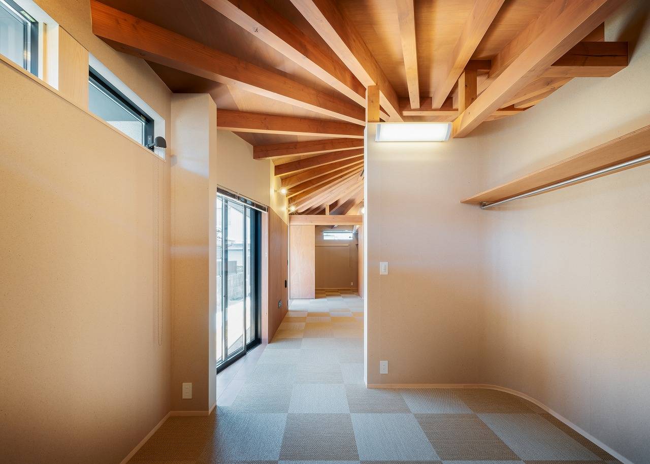 内部空間は中央が頂点となる天井をどこからでも感じとってもらいたいと壁は天井まで上げず、視線を遮りながら空間をつなぎ、中央にあるLDKに柱を落とさずに広い空間を作ろうと「かぶら束」を使い無柱空間を実現しました。またそこに向かう構造材を扇状に配置したことがより中央に向かう意識を強くし、「一室の家」の思いを強くしてくれました。