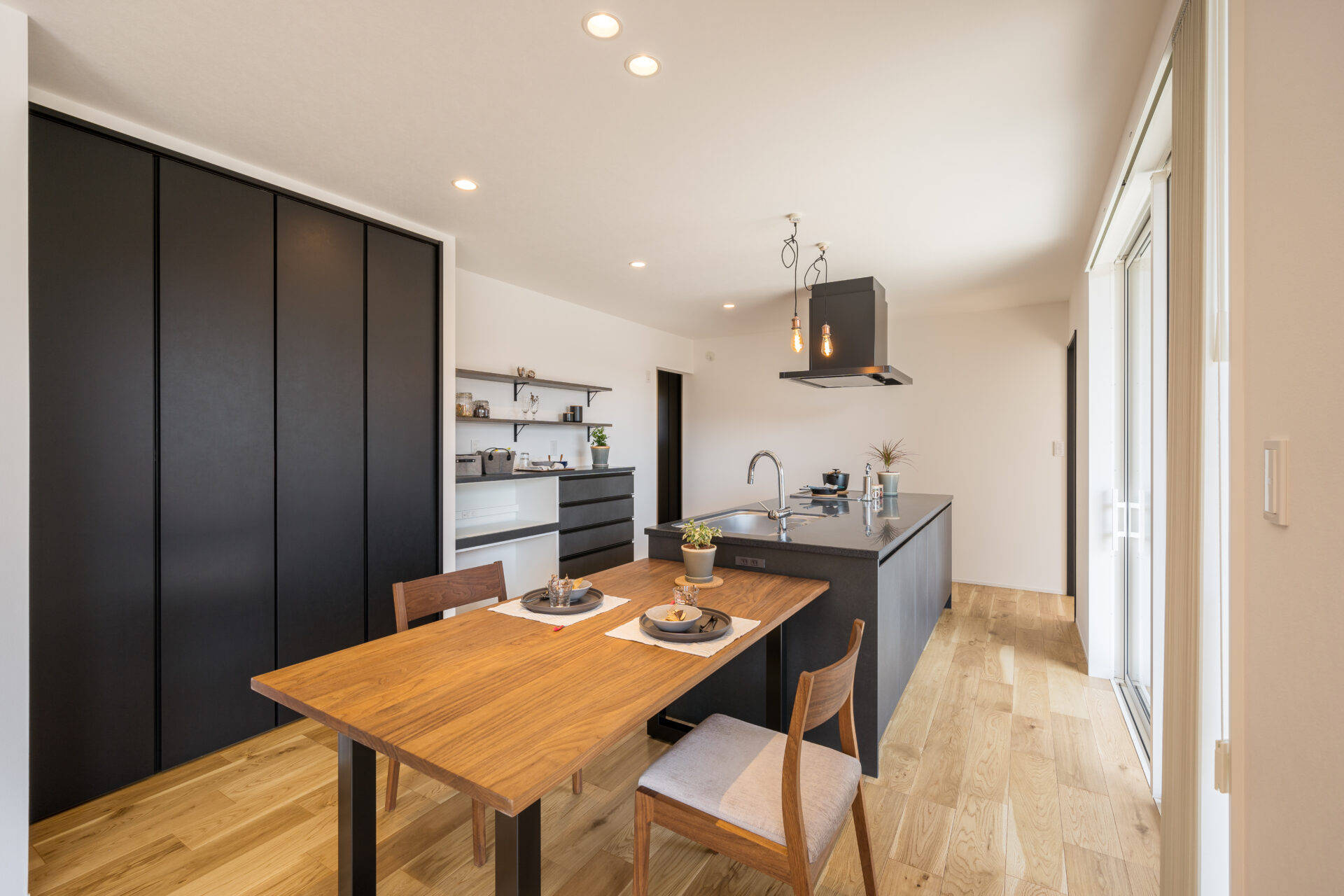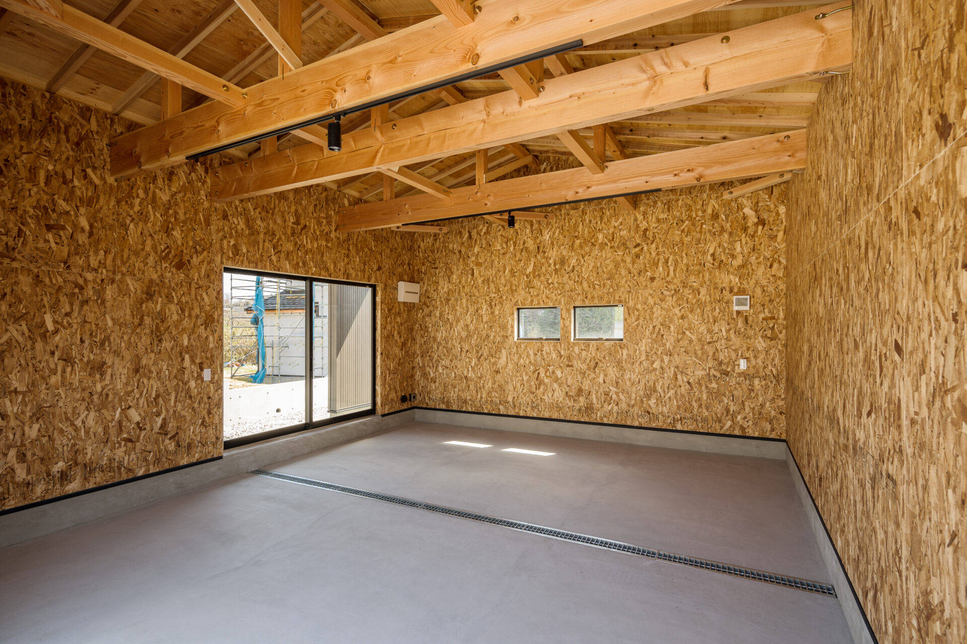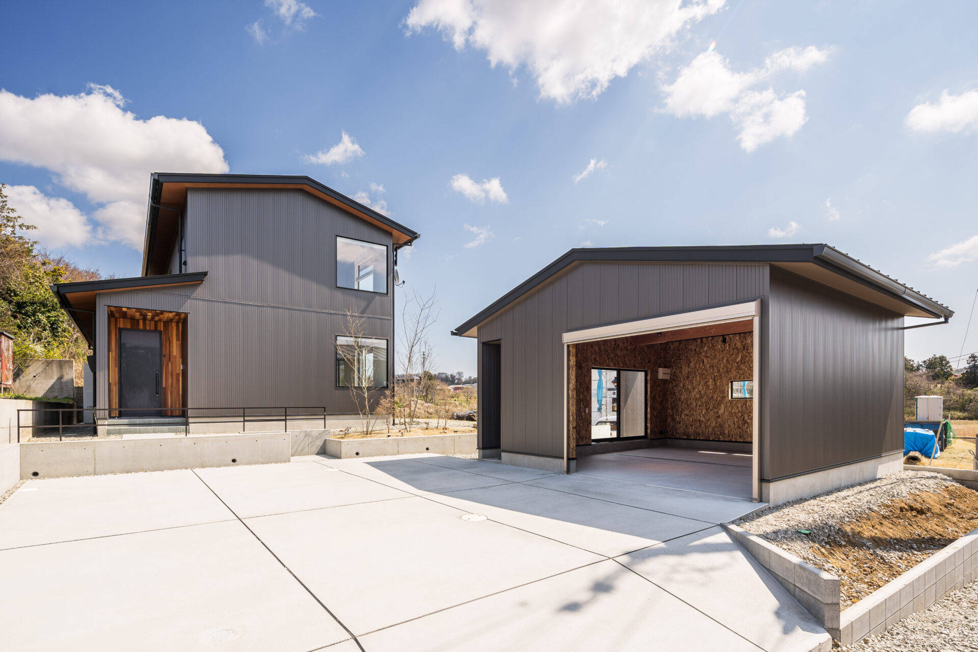 地方の広々とした敷地を最大限ゆったりと活用する為、母屋とガレージを別棟で計画し、それぞれを繋げる庭となるような一体的な設計としました。母屋とガレージの繋がりに配慮して、LDKからもガレージが見通せるような開口計画としています。