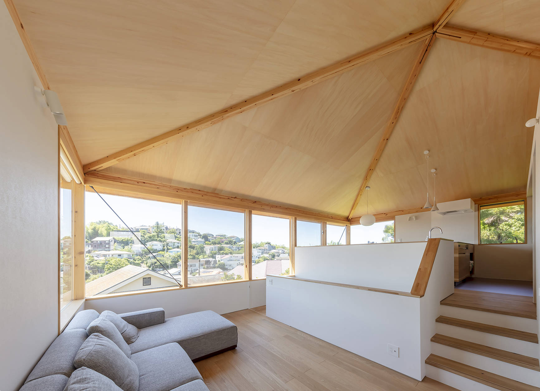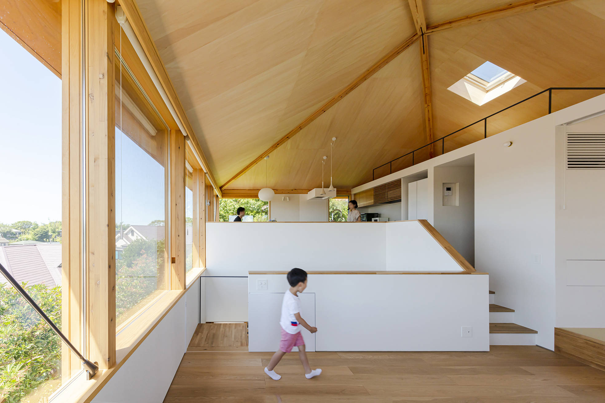 その動きに沿うように2階全体を支持する変形型の方形屋根を架け、1階から続く大らかなワンルームを構成しました。
