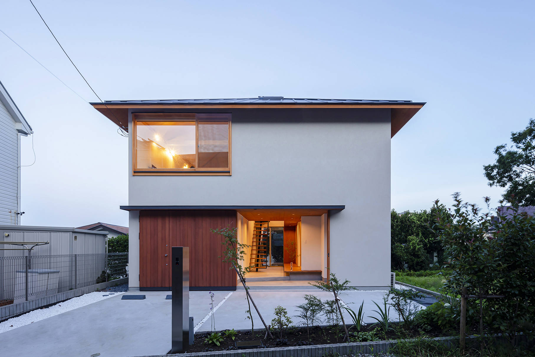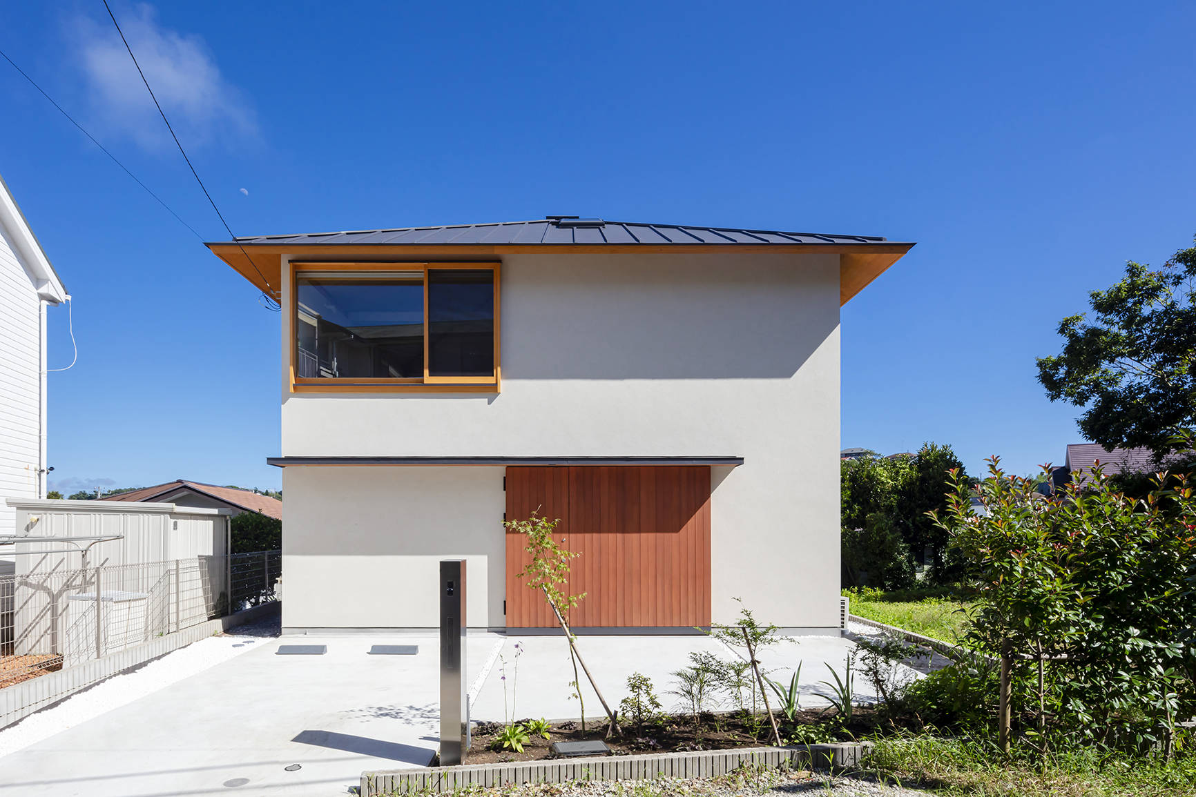 道路に面する北側は近隣にも開かれたパブリックな前庭、既存の樹木が残る南側は家族のためのプライベートな庭として位置付けました。この2つの庭をつなぐように屋内中央に土間を通し、ここに200mmレベルを上げた内縁を設えることで、見知った来客を迎えられるかつての民家の縁側のようなセミパブリックな性質を持たせています。