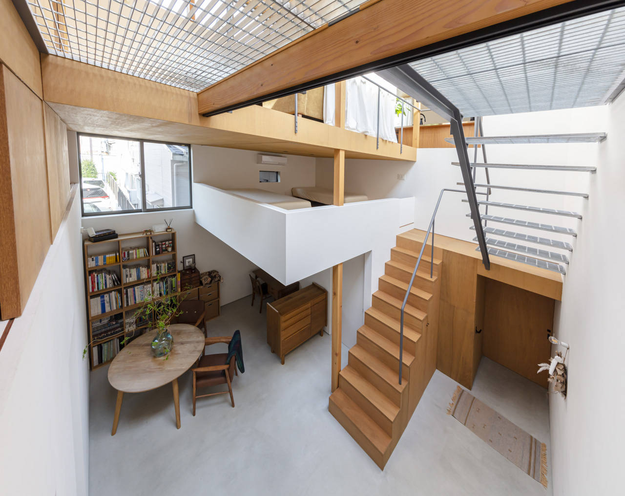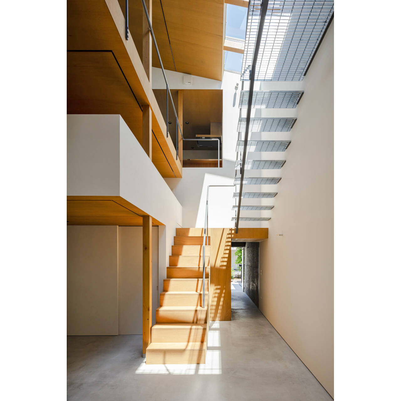 この敷地もそれら3階建て住宅と同様、細分化された敷地ではありましたが、幸いにも前述した比較的土地の広い2階建て住宅に囲まれており、周囲が建て込みながらも隣家の駐車場や庭、軒先の上など部分的に光や視線が抜ける余白を見出すことができました。
