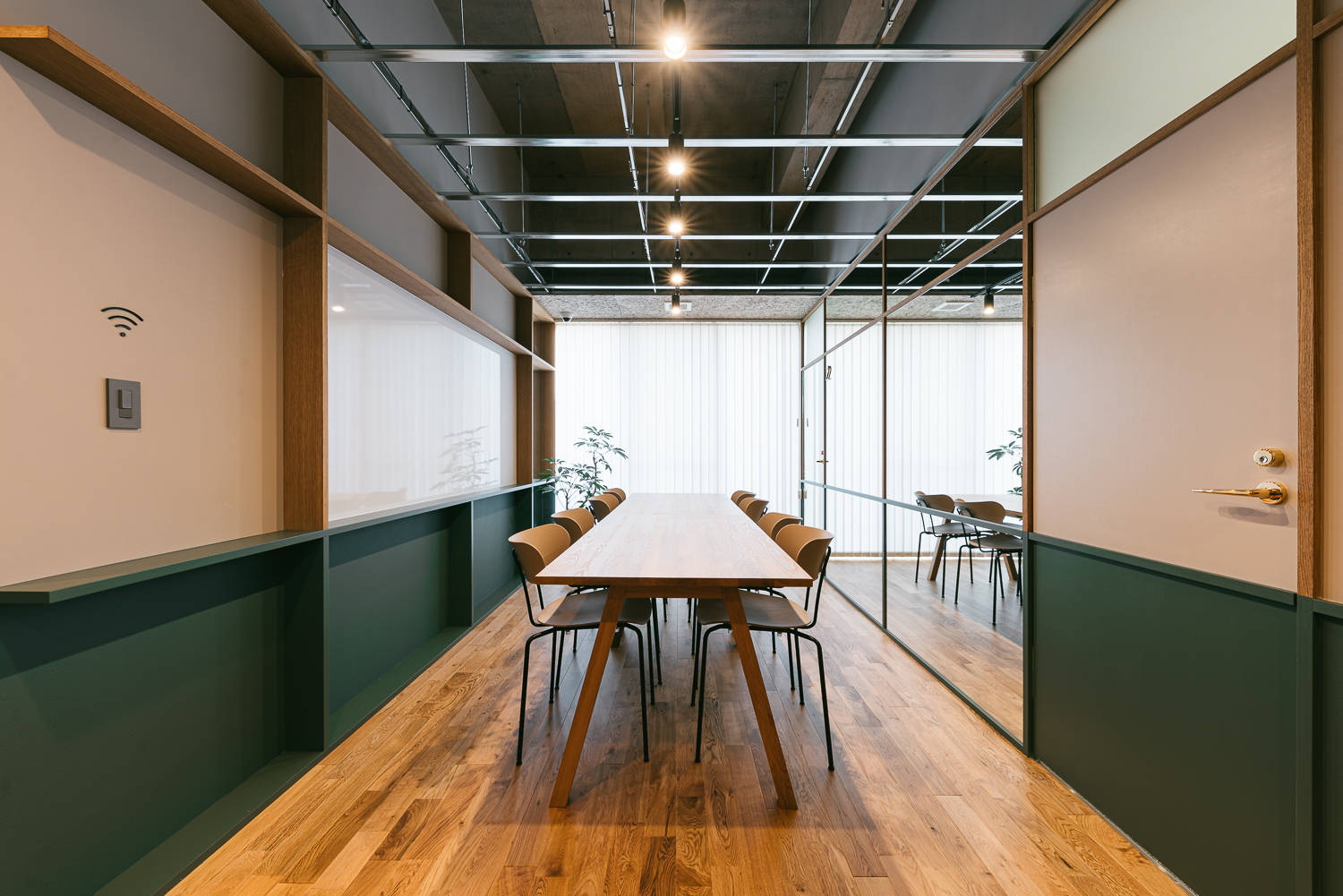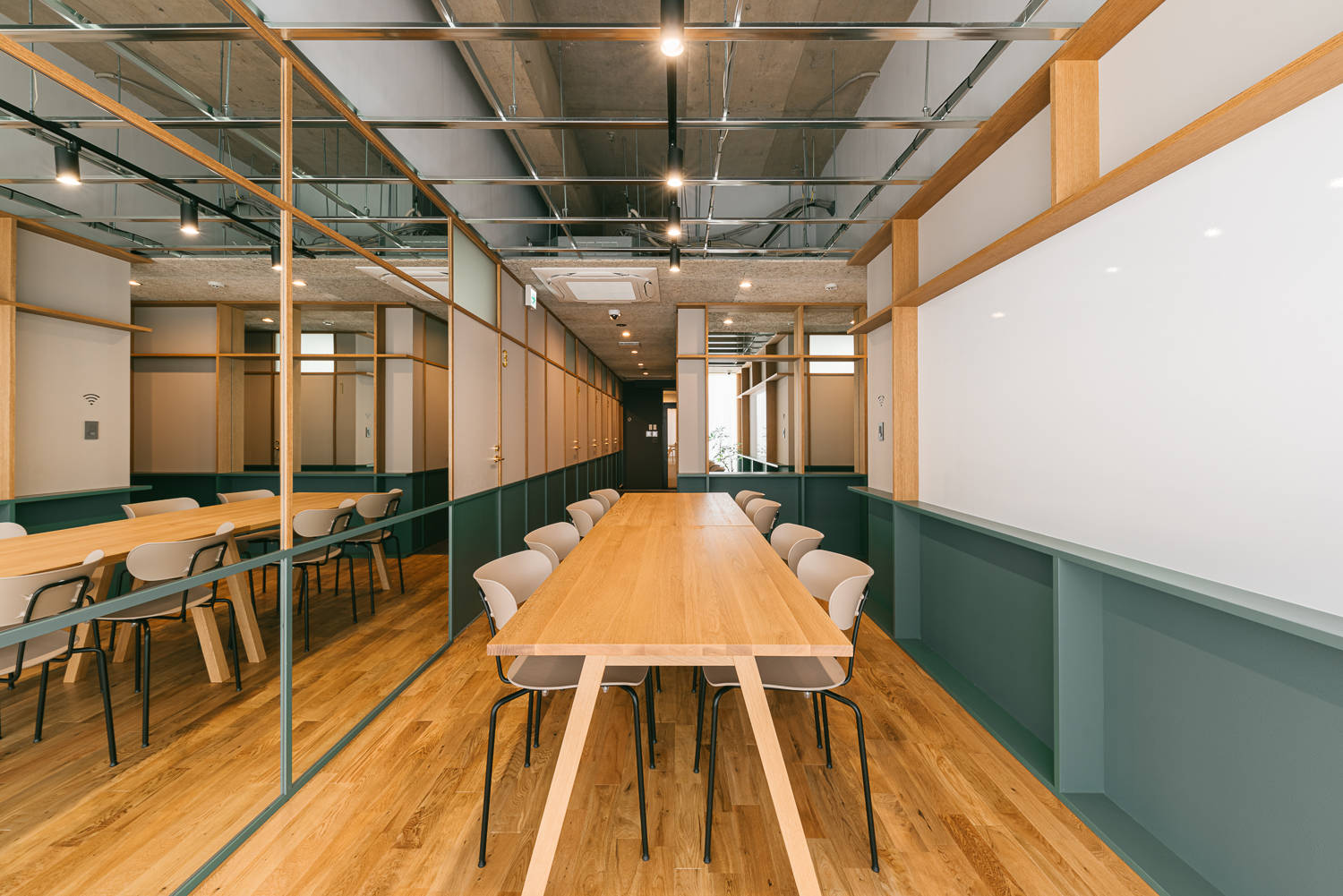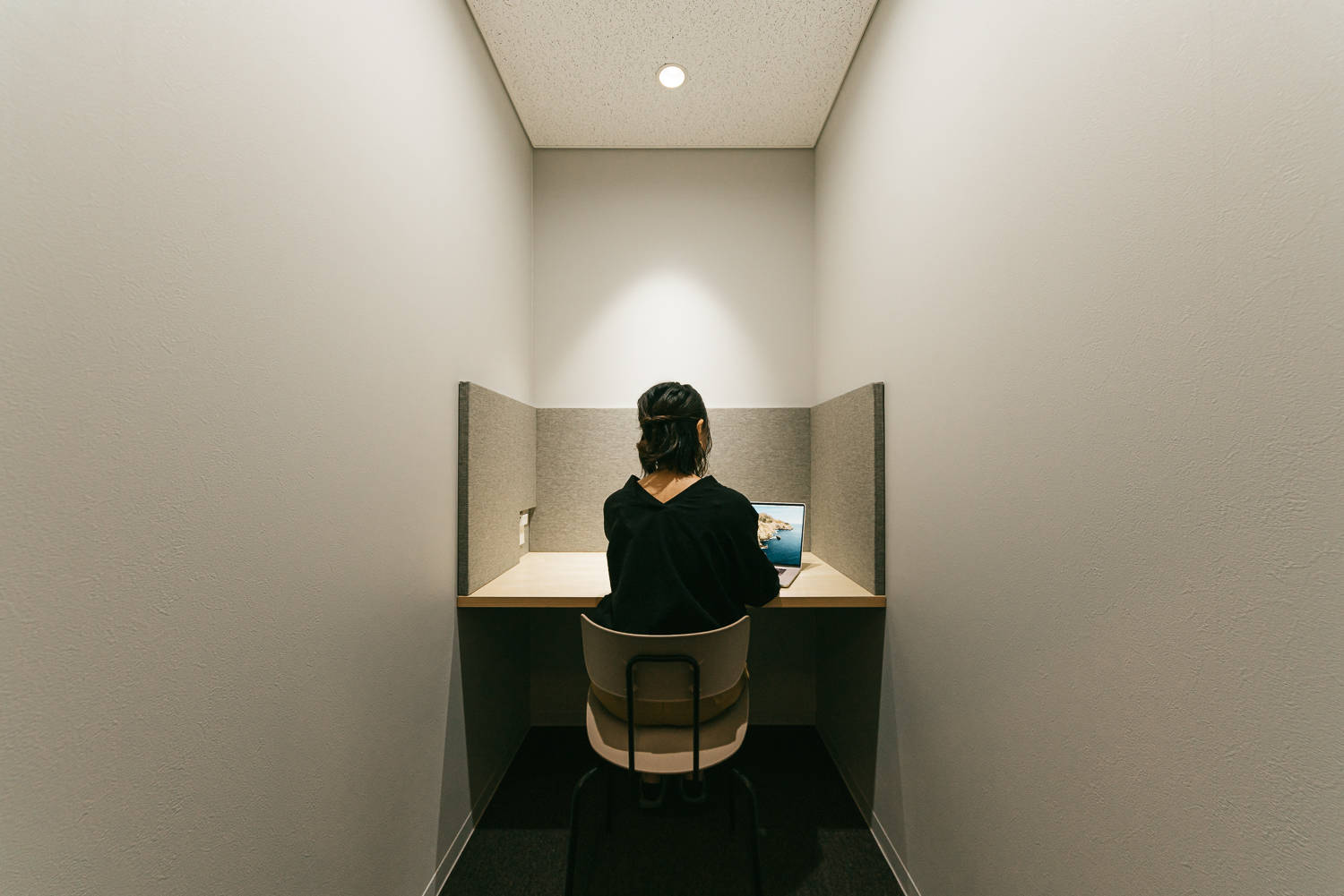 個室が並ぶクローズ型シェアオフィスの特質を逆手に利用し、静寂さと適度な開放性により都市の喧騒の中で集中できる場を設えました。
