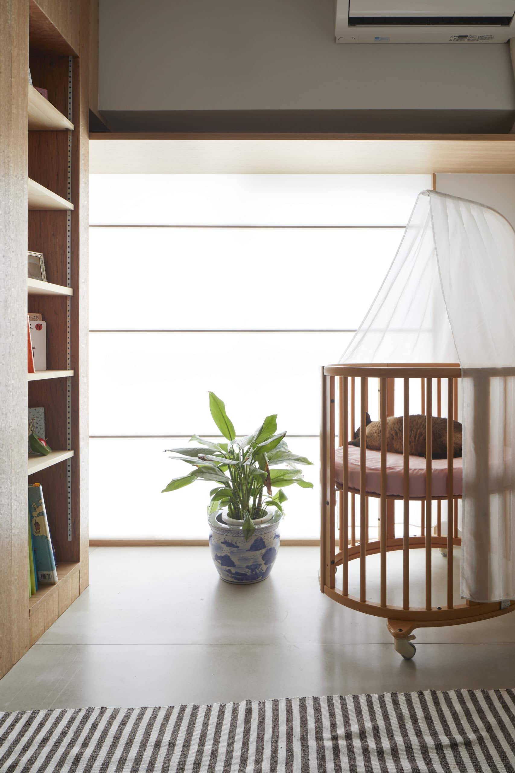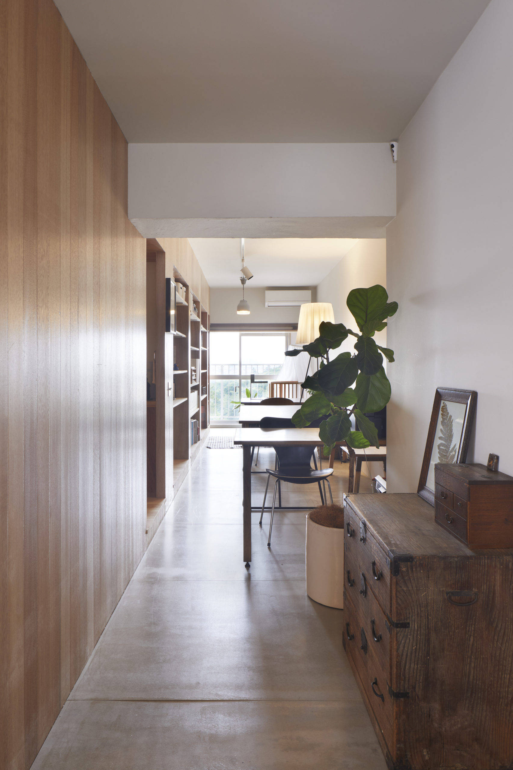 階高が低く、梁せいの高い躯体が内部空間に負荷をかけていた為、梁を飲み込むように一枚の大きな壁面で空間を切り分け、その壁に収納やトイレ、手洗いなど住まいにおける重要な機能を持たせている。