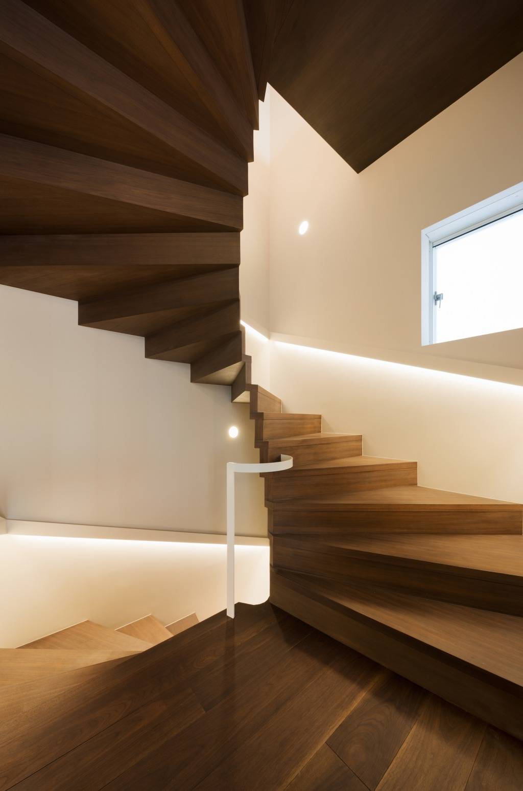 別荘と居宅で大きく異なるのは、非日常の設えです。柱のない螺旋階段、眩いほどの白い外壁、ガラス張りのファサード、間接照明主体のライティングなど、空間構成、素材、採光、照明など普段過ごす空間との切り替えが重要になります。
