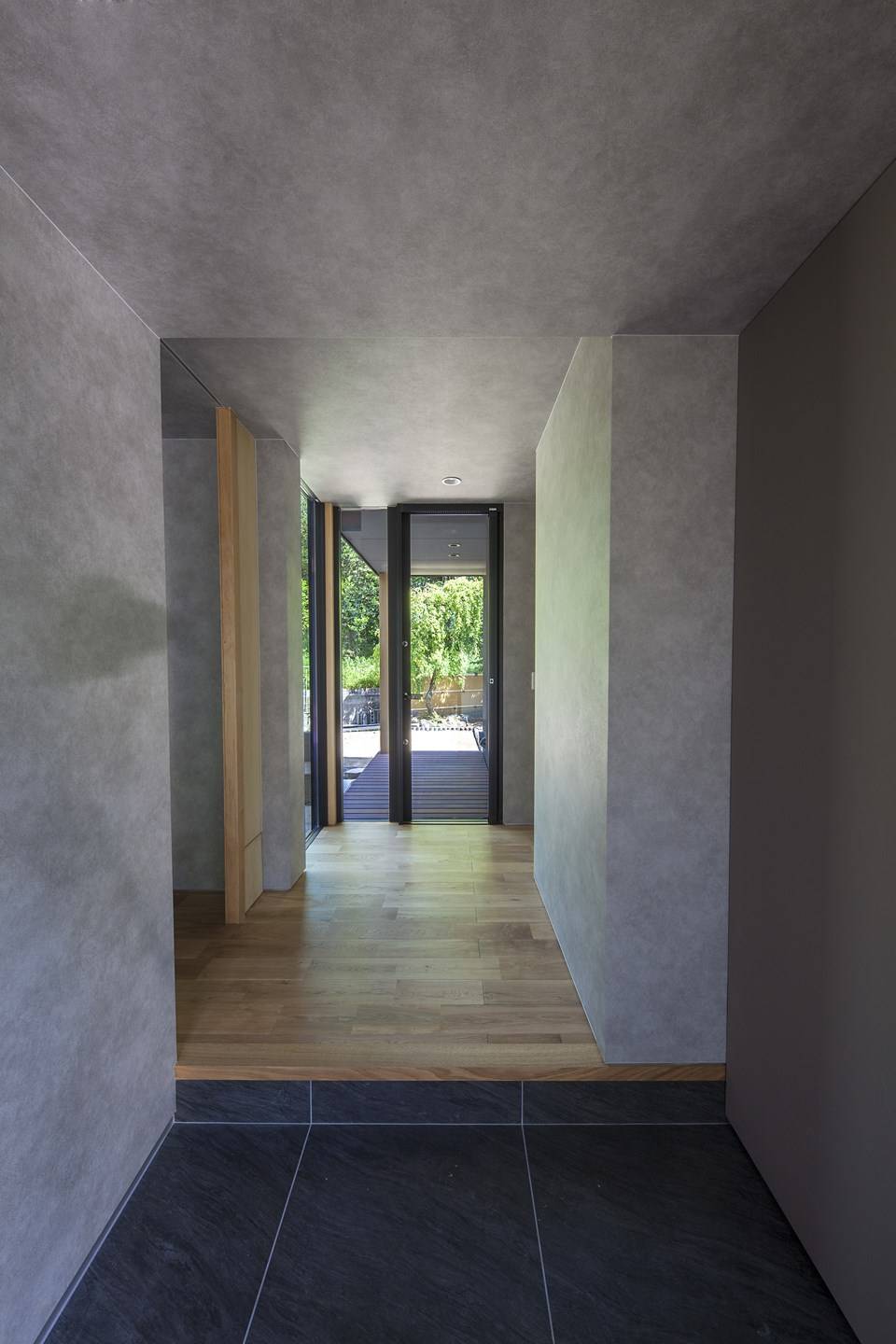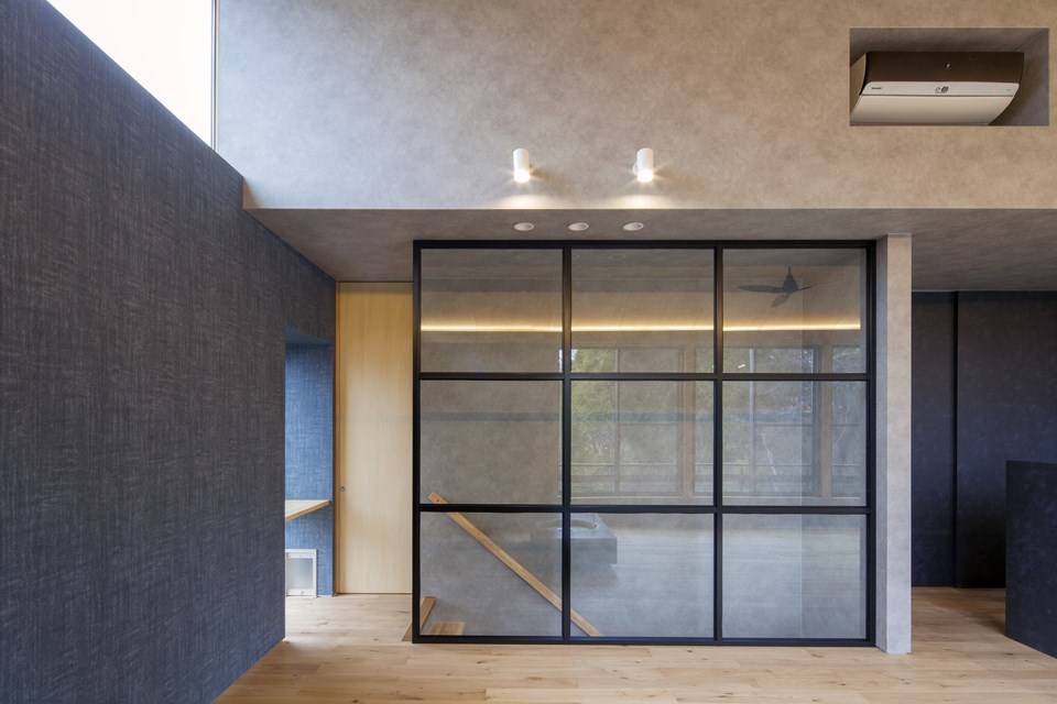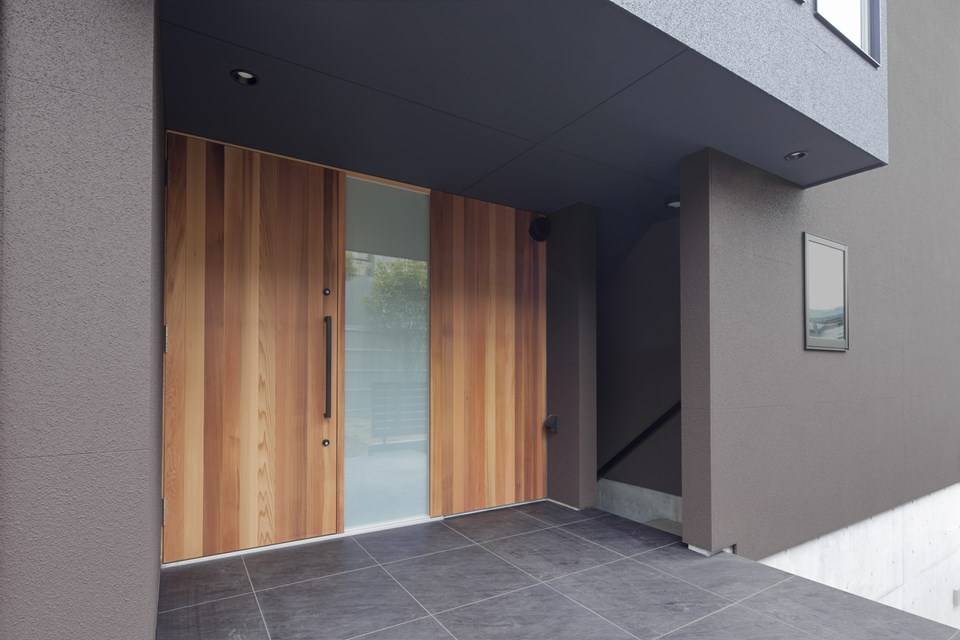 メインの道路からの高低差は約2.5mあり、その差を利用して地下車庫を設けました。 土留めを兼ねた車庫なので、その上の住居とも階段で行き来ができます。 樹木に恵まれた環境に馴染むよう、住居の外壁は茶色がかった濃灰色としました。
