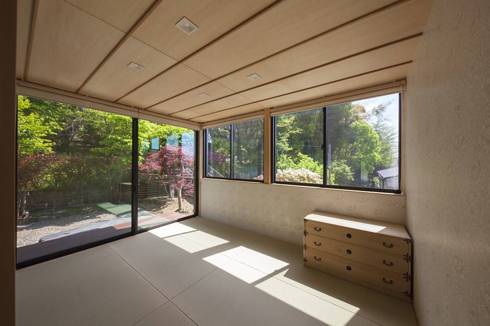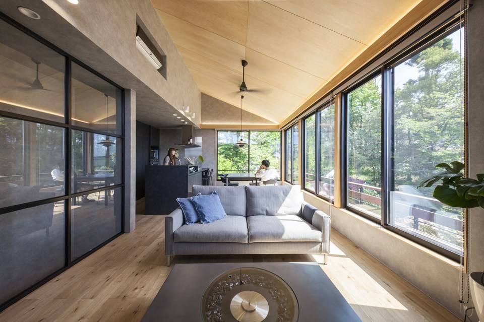 この景色を存分に取り込むため、リビングを2階に配し、東側には大きな窓を連続して設けました。 窓に設けた花台は、腰かけて景色を眺める時にも役立ちます。 最上階の利点を生かして屋根に合わせた勾配天井が、空間に変化をあたえ豊かにしています。 朝日が差し込む食卓で、鳥のさえずりや四季折々の木々を愉しむことのできる住宅です。