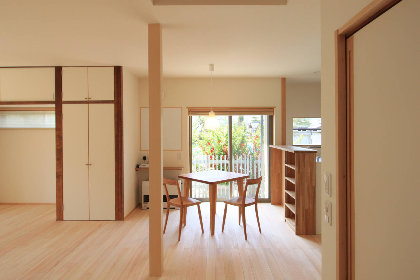 寝室は主に寝るだけ、という施主のライフスタイルに合せて寝室は必要最低限の広さとし、一方で居間からキッチンにかけては広く明るい空間とした。周囲が畑である立地を活かし、キッチンの出窓は透明Fixガラスにしていつでも山々や近所の木々を眺めることができる。