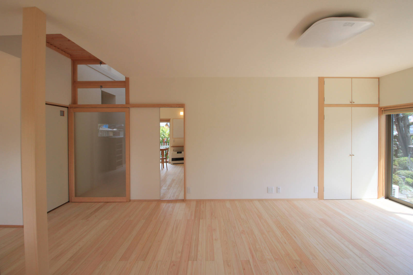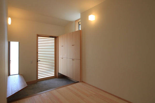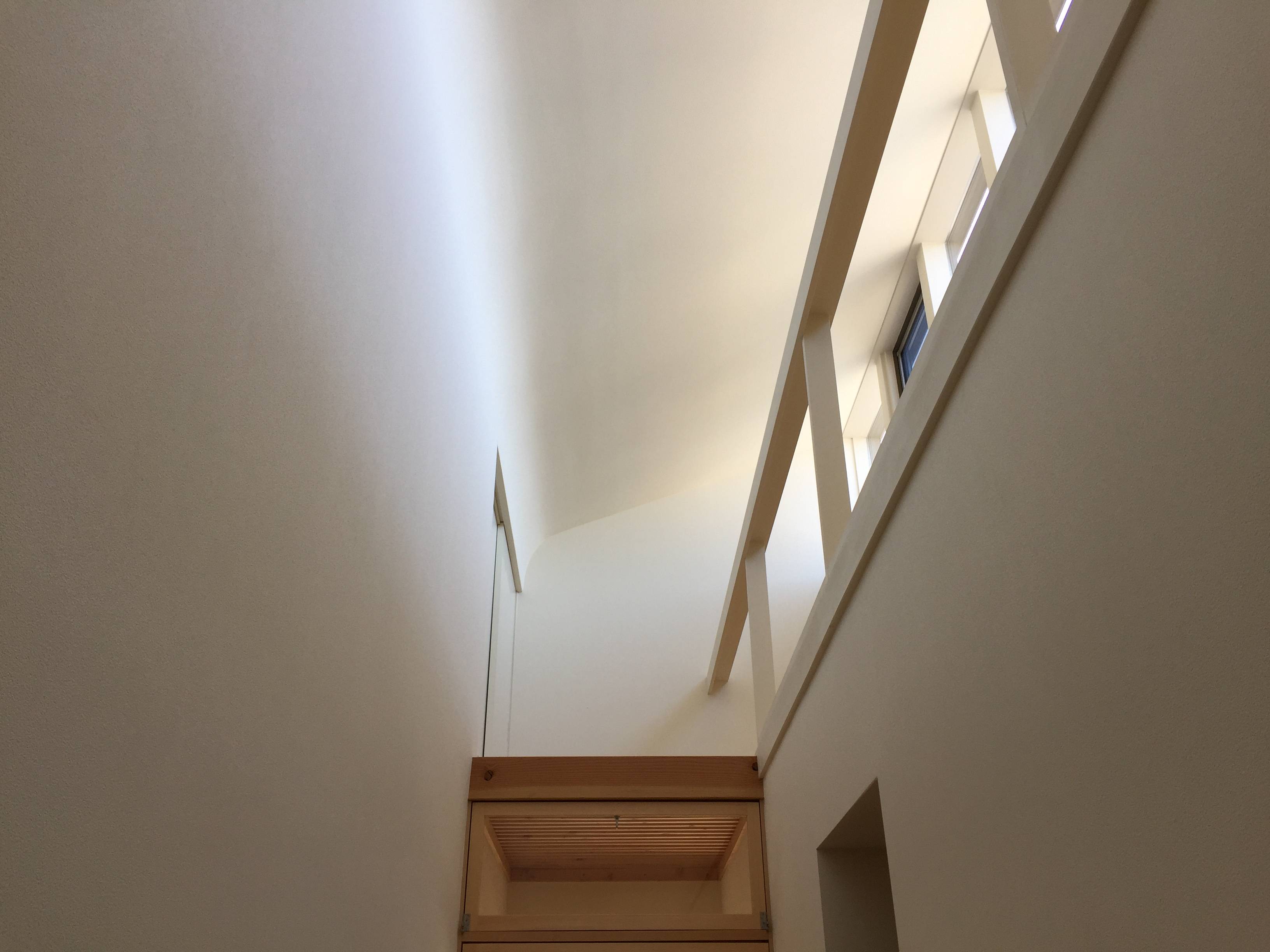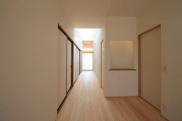 そこで、2階を取り除くことで機能的にも構造的にも合理的に解決する事を考えた。さらに、ただ2階を取り除くのではなく昼間でも真っ暗だった玄関続きの廊下を明るくできるよう、廊下真上の2階部分を北側採光のハイサイドライトとした。そうすることで、北から安定した光が降り注ぎ続ける、明るく開放的な廊下になった。