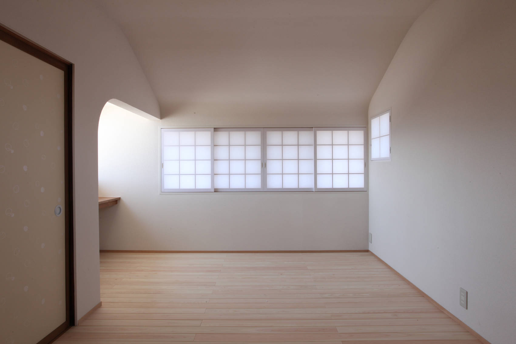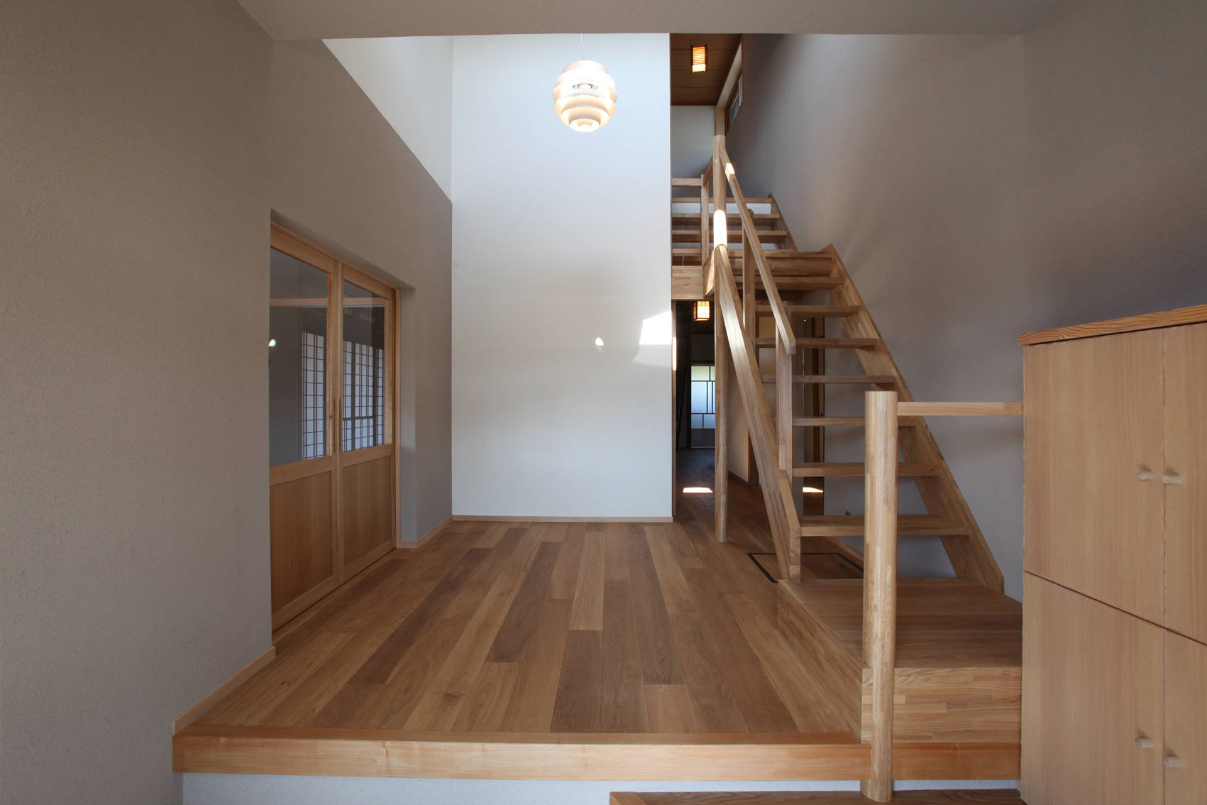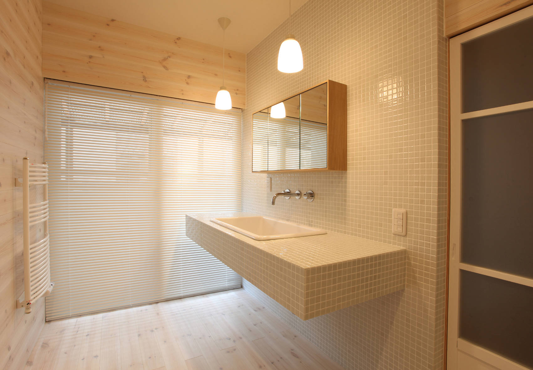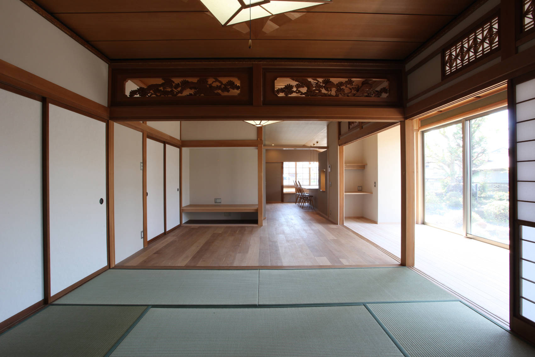 この家では、南東角の最も明るく開放的な位置にあった祖母の部屋をキッチンに改装した。もともと出窓があったことを利用し、出窓にキッチンを組み込んだ。キッチンは単なる設備ではなく窓の一部となり、レンジフードの存在感なども出来る限り消しことに配慮している。また、長さ2.5mのダイニングテーブルとシンク、コンロの高さを全てそろえ、部屋に入った時の視線が自然に窓の外に向き、庭と一体的な広がりを感じることができる。
