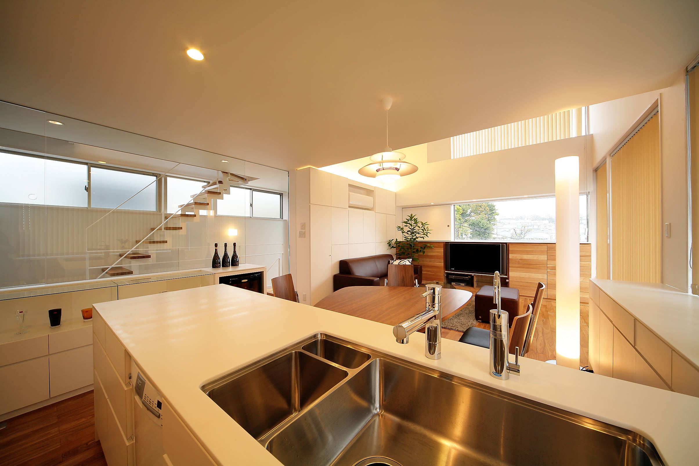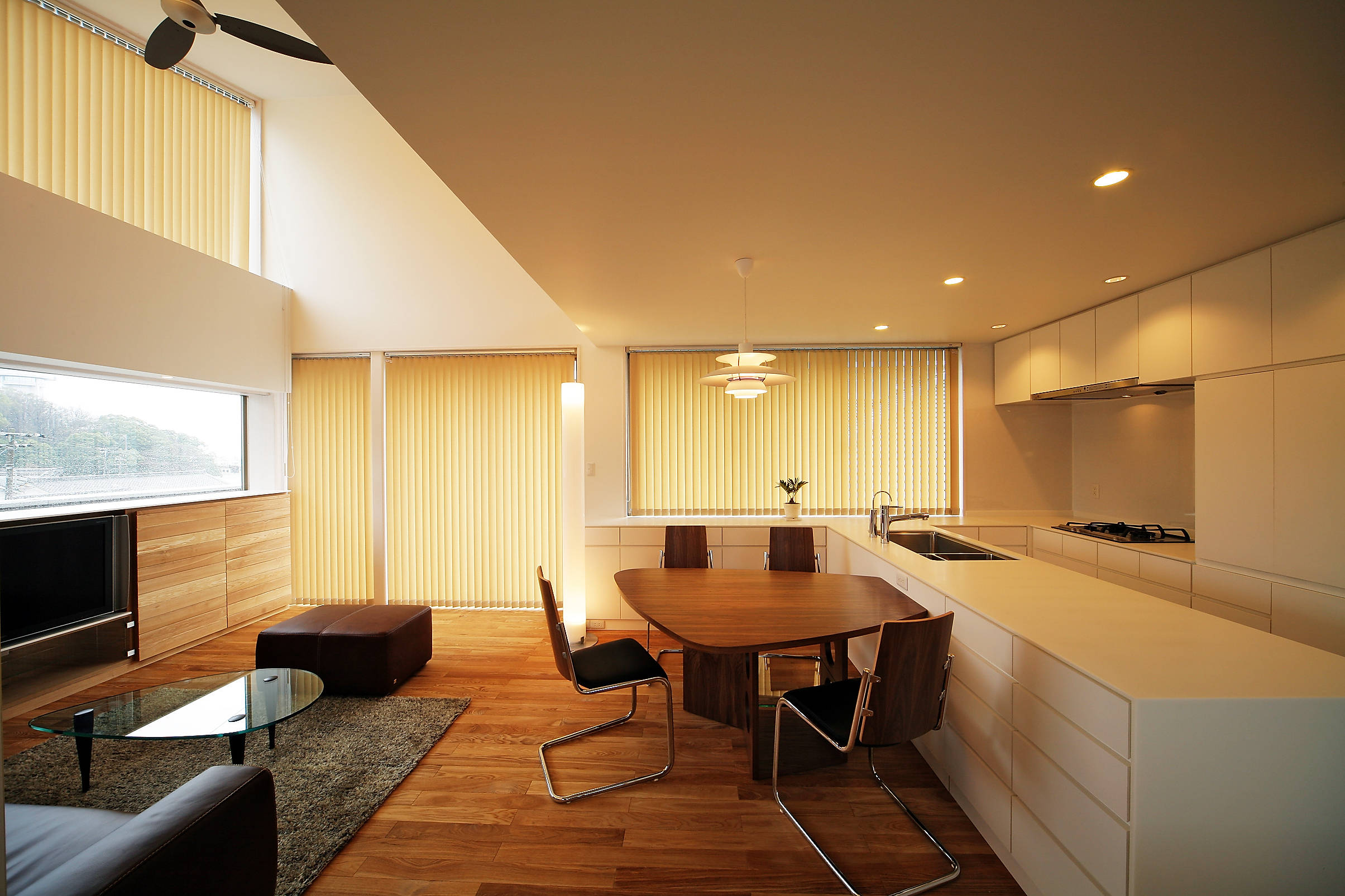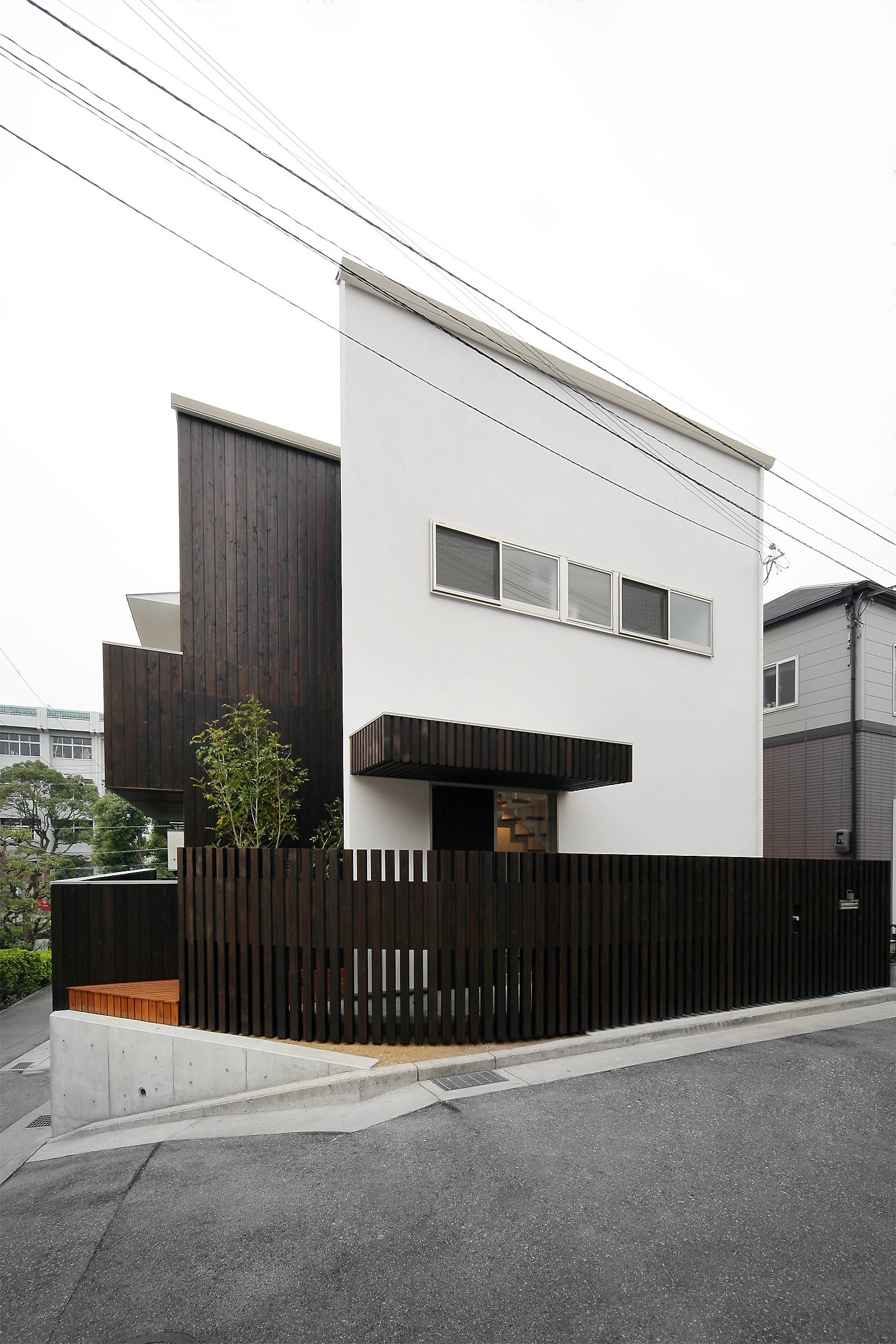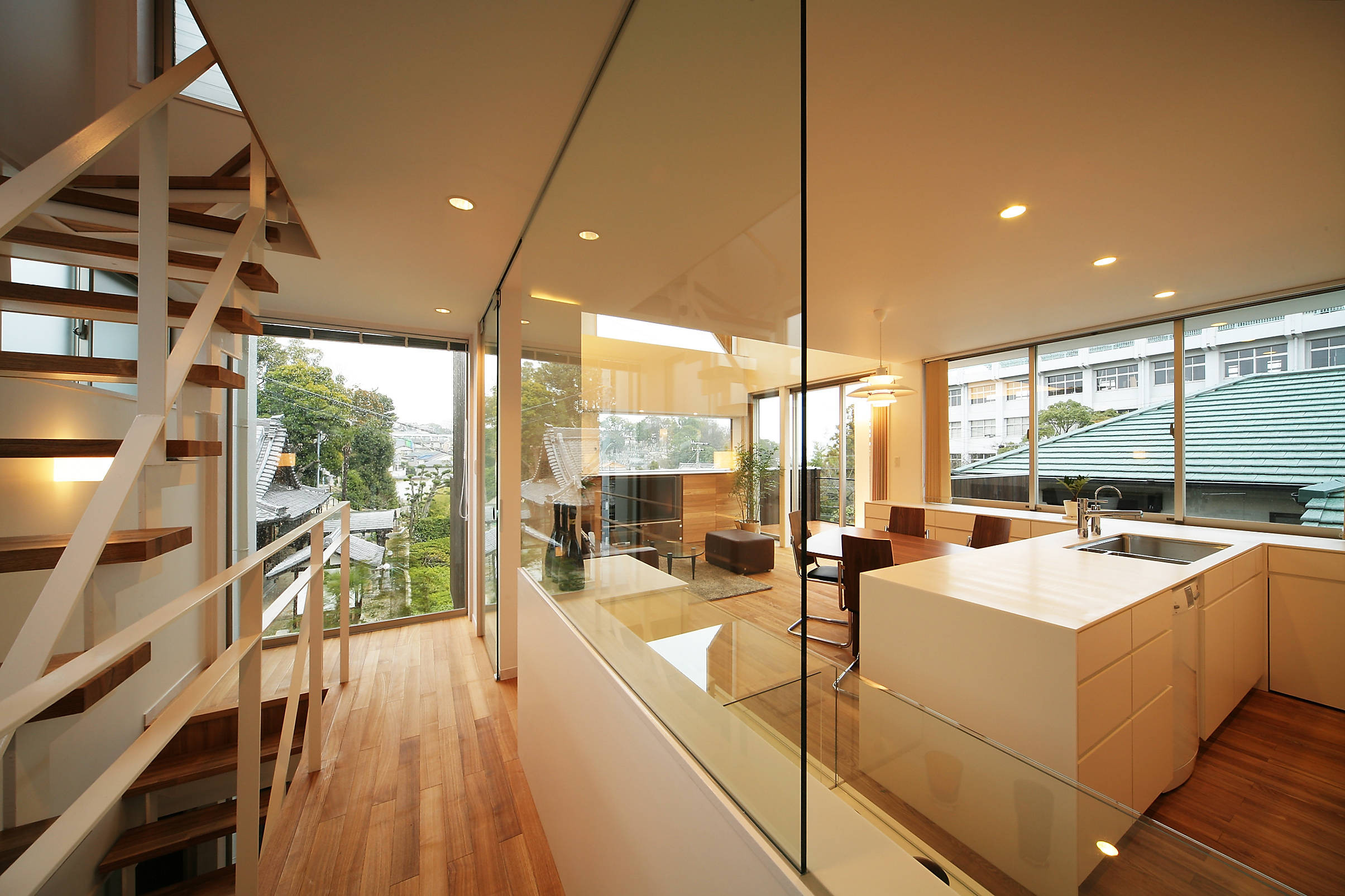 法的規制が厳しいため、眺めの良い南東に張出しのバルコニーを面積規制ぎりぎりの広さで設置し、室内からの広がりを与えるだけでなく有効に多目的に使用するスペースとしています。 結果的に突き出た2層分のバルコニーが浮遊感のあるファサードを形成しており、この界隈ではシンボリックな建物となっています。