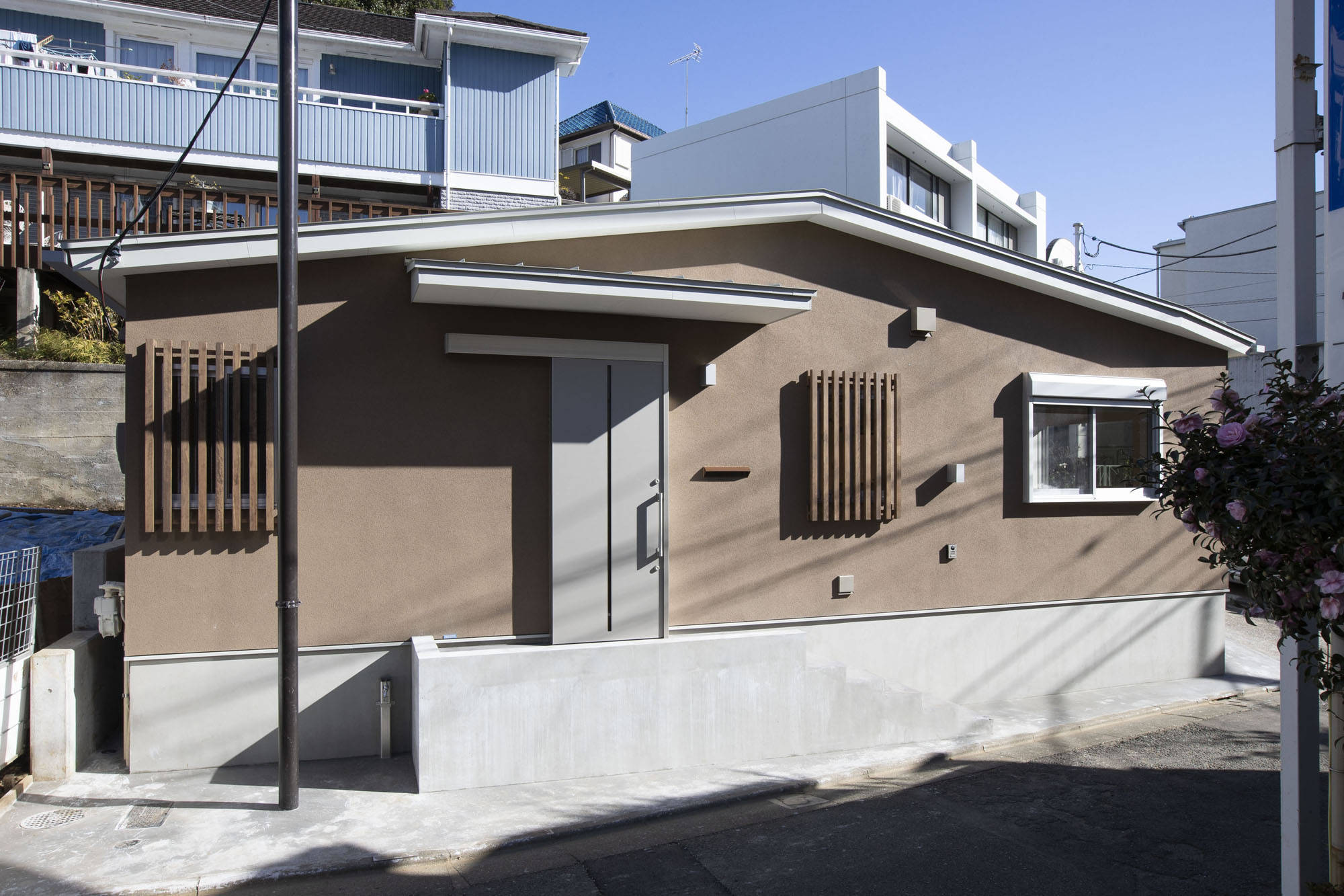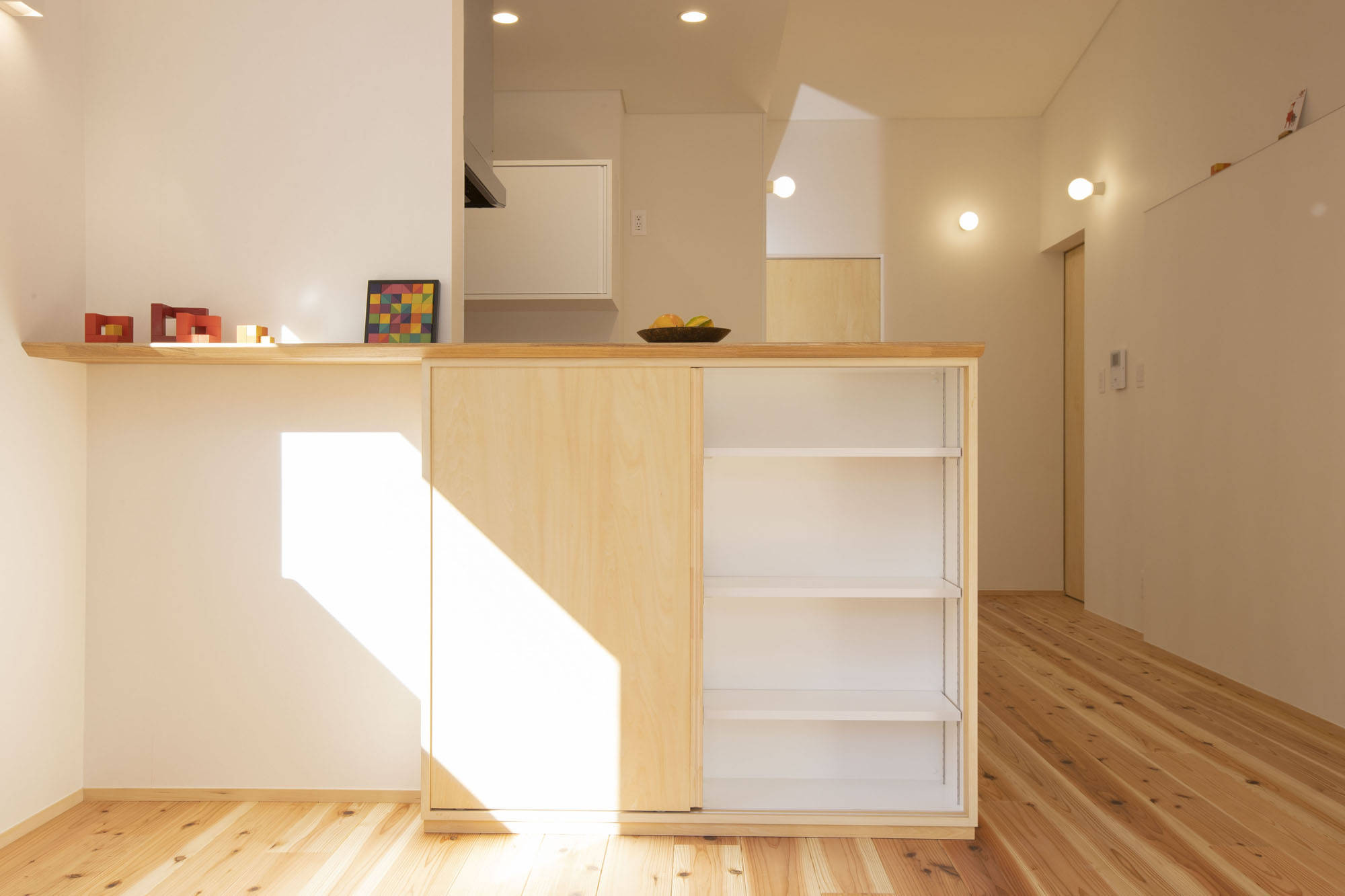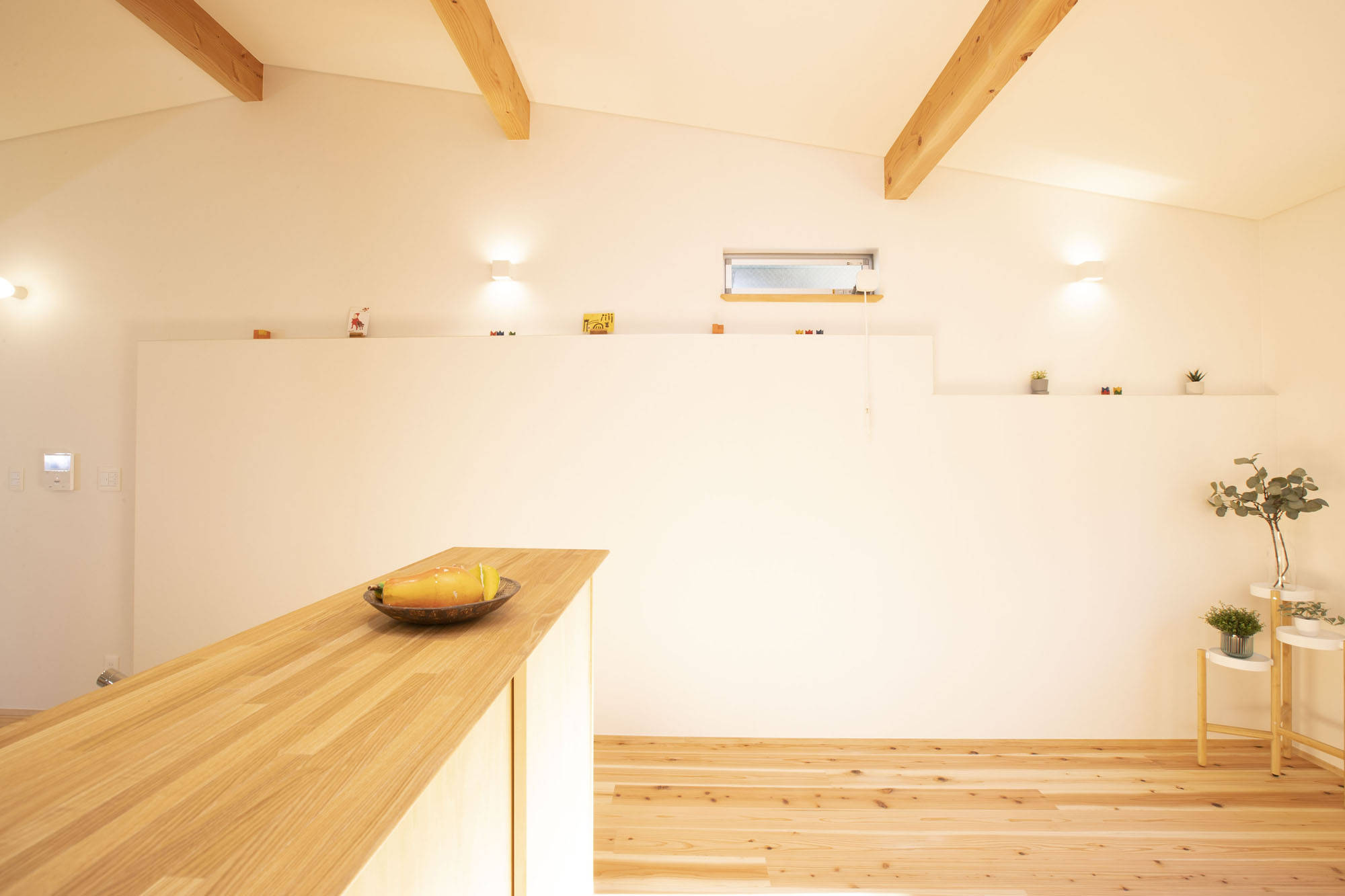 敷地は丘の斜面の下にあり、斜面側外壁は、擁壁も兼ねた厚みのあるコンクリート造です。そのため室内では木造壁部分との段差ができましたが、そこは飾り棚のようにデザインしています。天井高が高いため、面積が小さくても広がりが感じられます。