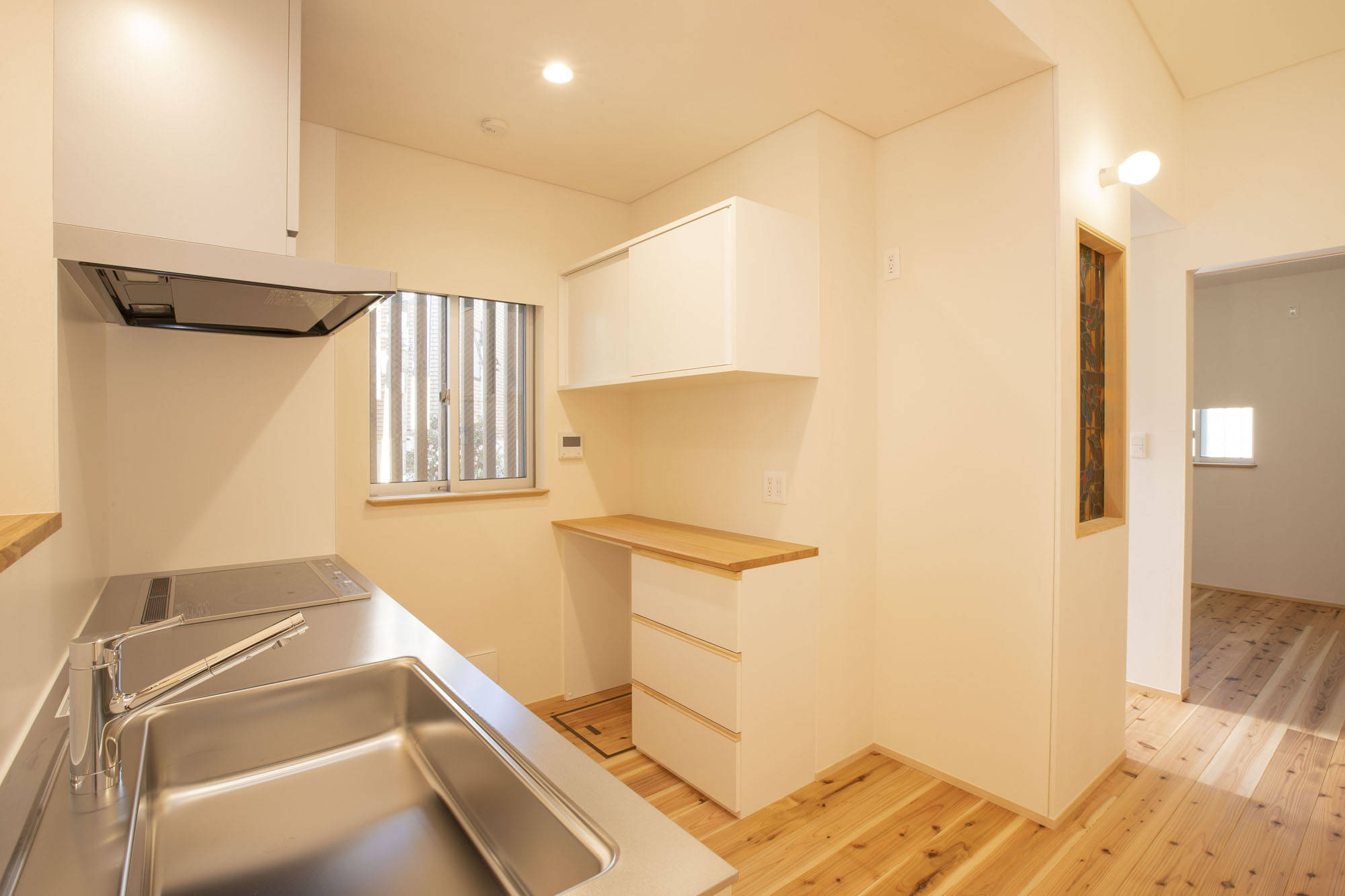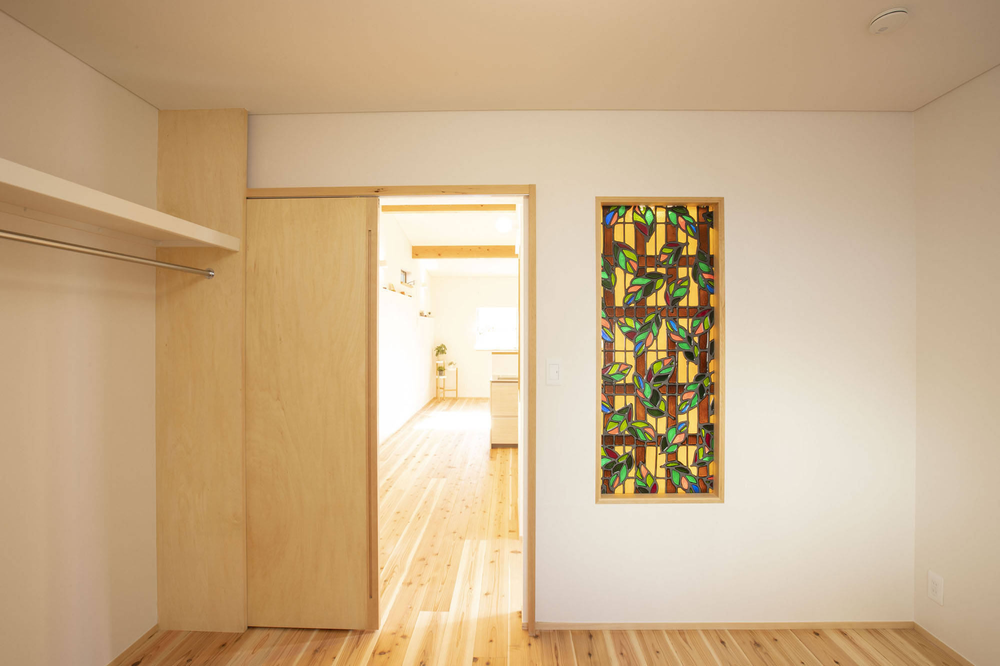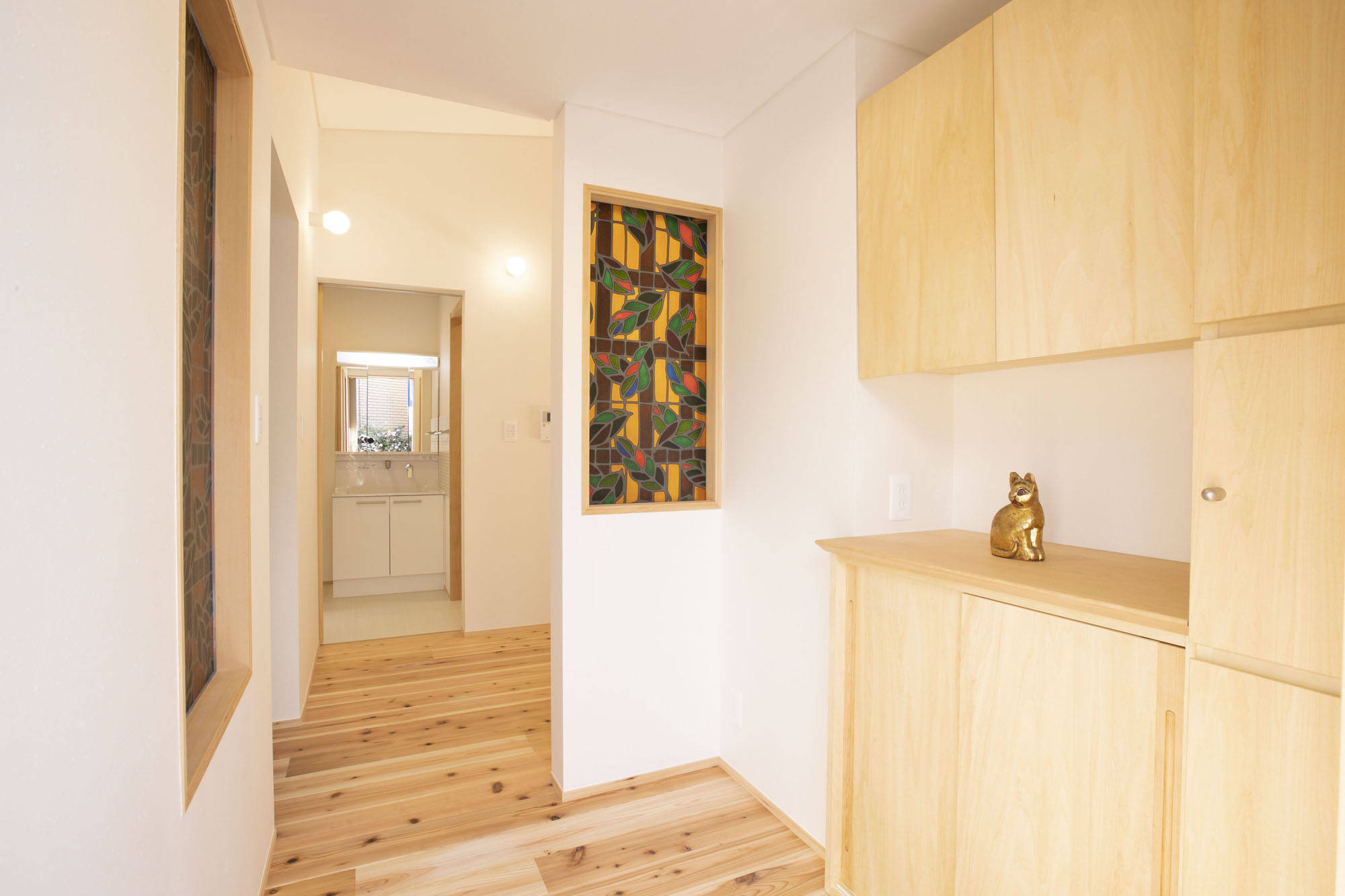 室内は段差なく建具は引戸とし、外部との段差はできるだけ小さく、住まう人が使いやすい高さになるよう収納等を設計しています。以前の家にあったステンドグラスを再利用し、家の記憶を引き継ぎました。