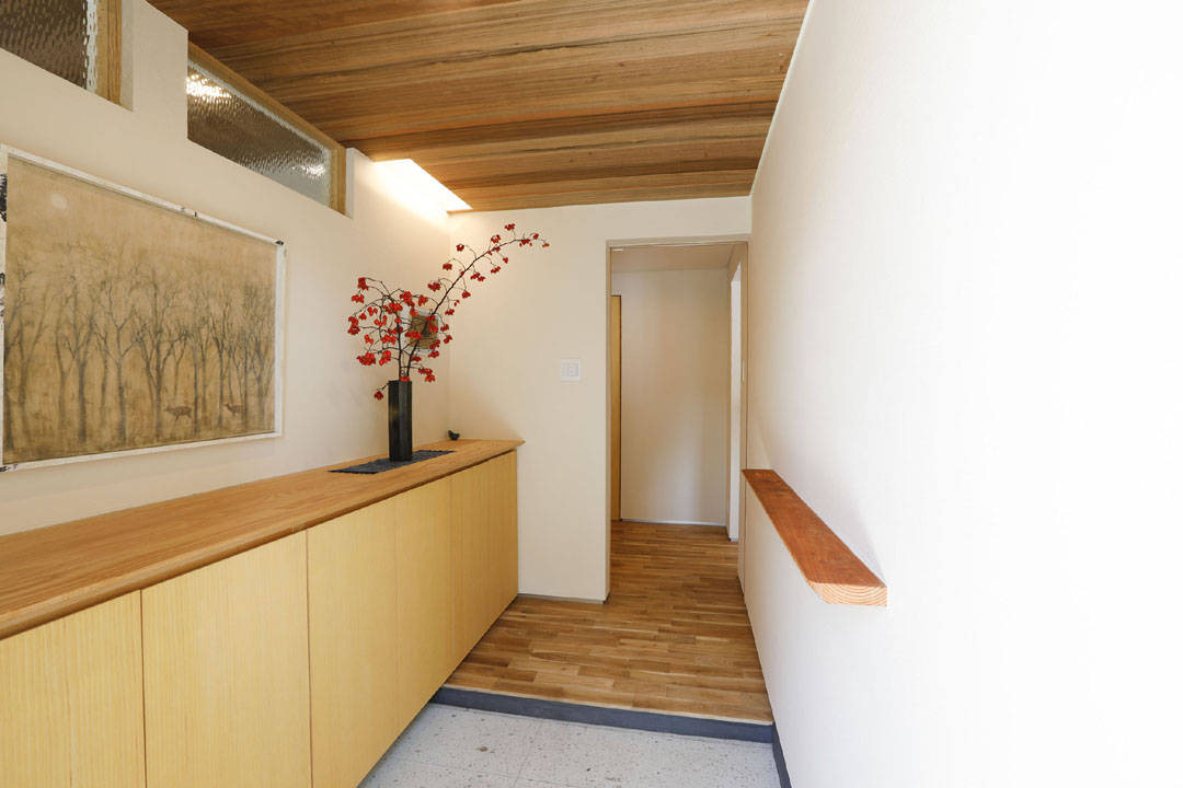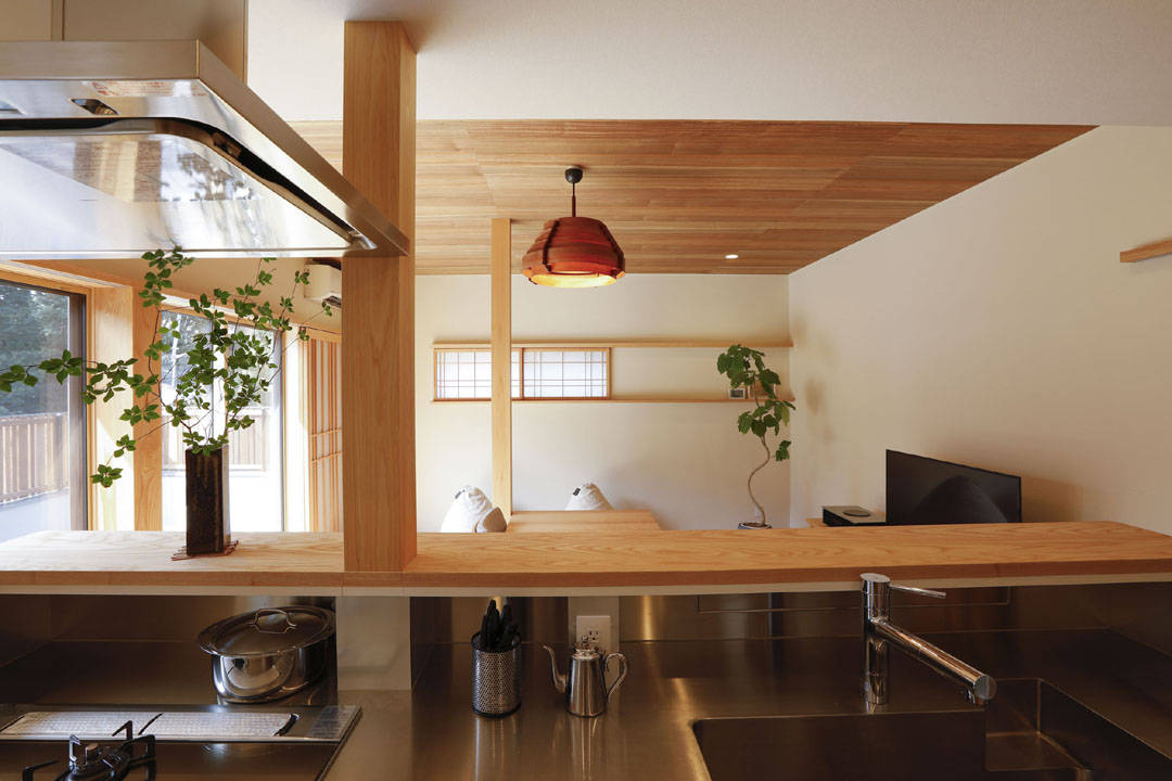 鎌倉の落ち着いた町なみを意識し、以前よりボリュームを抑え方形屋根や木塀の外観としました。内部はリビングダイニング~キッチン~パントリー~水回りと回遊動線とし、使い勝手良いプランにつくりかえています。深岩石、敷き瓦、珪藻土、和紙、無垢の木など自然素材でつくられた、光と風の心地よい住まいです。