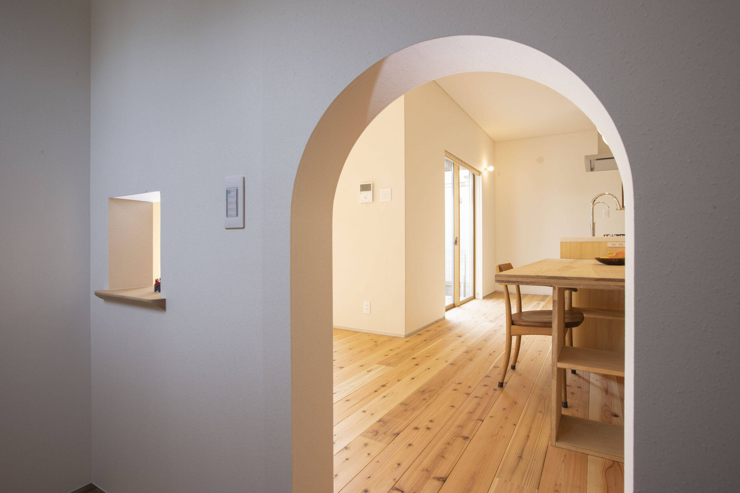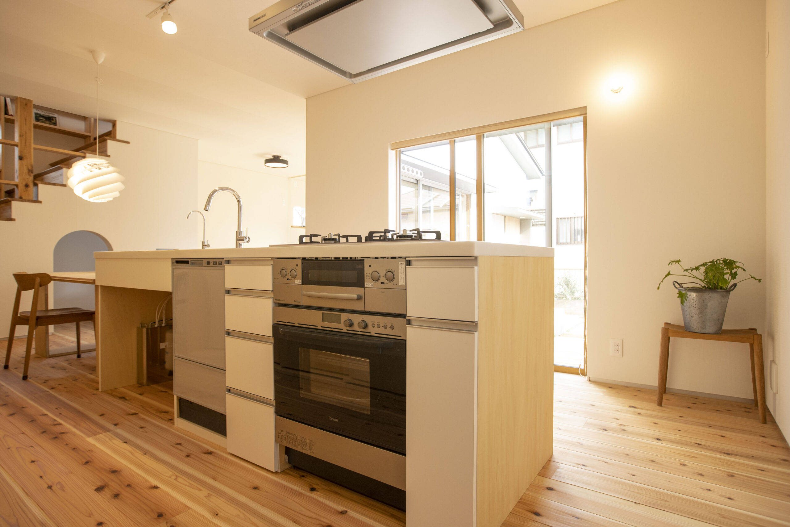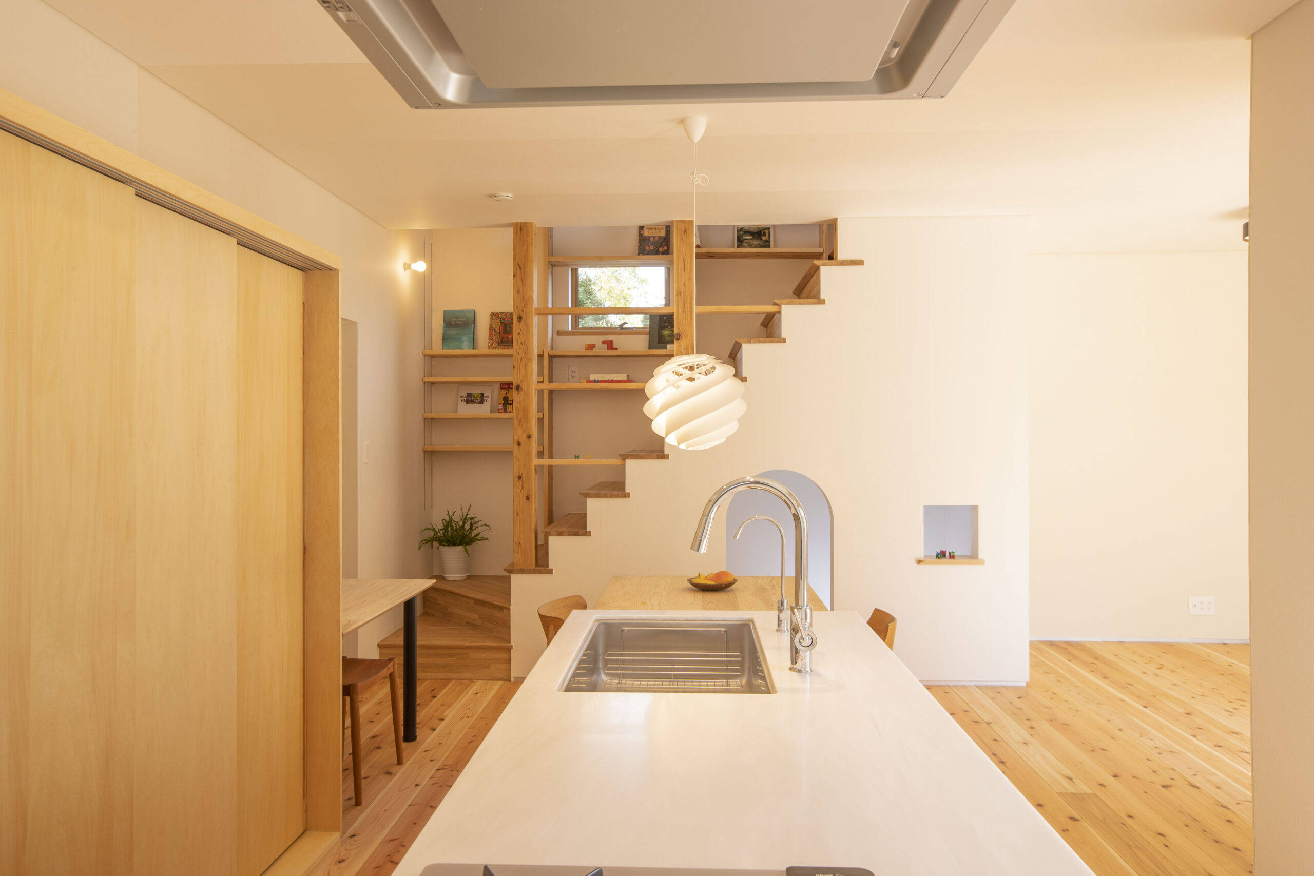 郊外の旗竿敷地に建つ2階建ての住宅です。子どもたちが自由に庭遊びができるようにリビングダイニングと庭がつながり、大きなアイランドキッチンからは、すべてを見渡せるようになっています。階段の下には、子どもの隠れ家スペースがあり、その上には階段書棚があります。子育てしながらも丁寧な暮らしを楽しむことができる住まいです。
