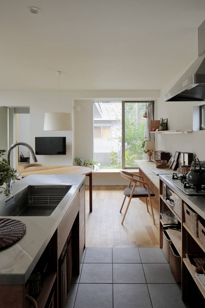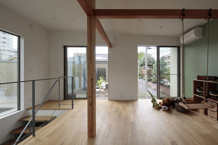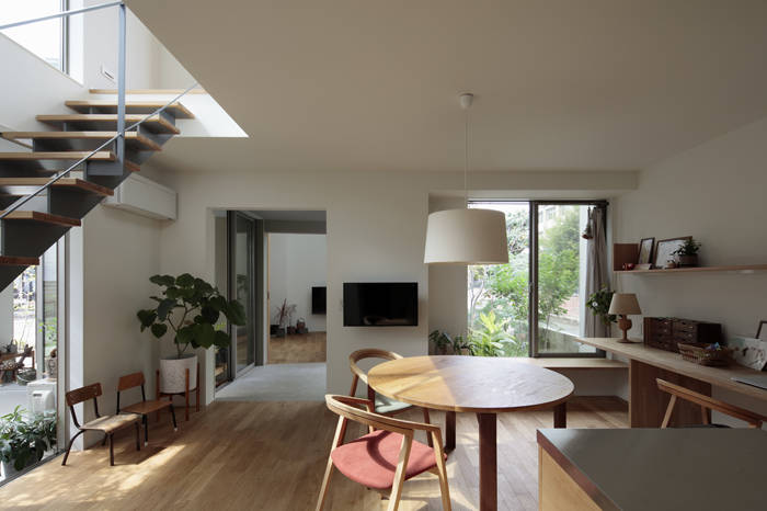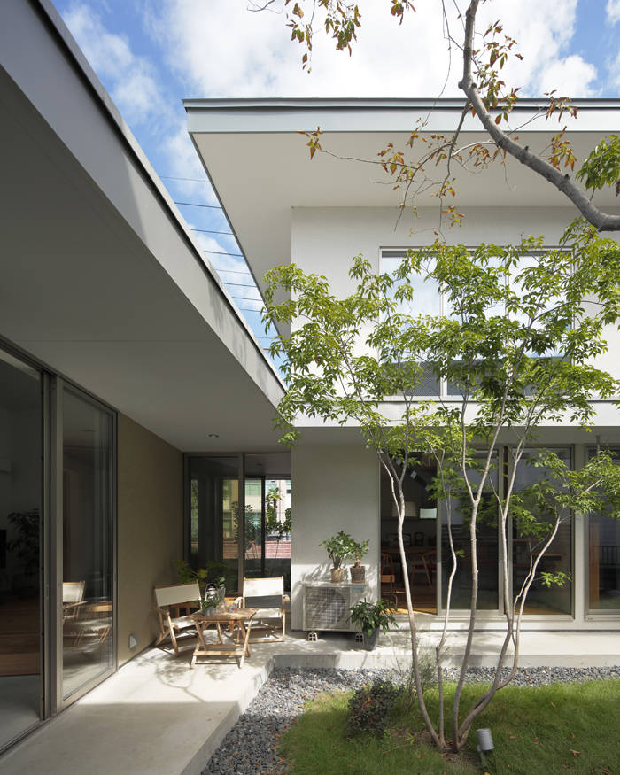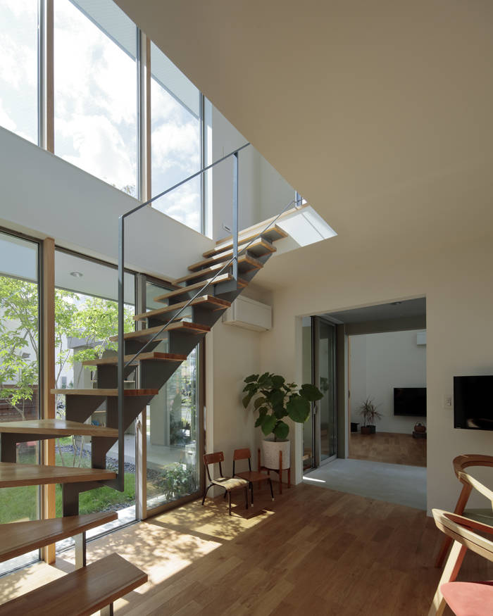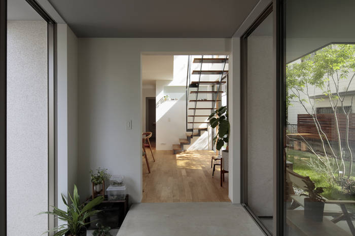 子供達や友人達が集まり過ごせる場所として街に開く、開ける場として広めの土間、リビングを独立した空間として街側に配置し大きな本棚と薪ストーブを設えた。裏庭に出られるサブエントランスを挟み奥まった棟にダイニング・キッチンなどプライバシーが高めの空間とし、リビングゾーンと少し距離をとった。子供達が遊べる南側の芝庭と北側道路を通る人たちに見てもらえるような北庭。二つの庭に挟まれるようにL型に配した建物は近所の人たちが寄りやすく、そこに住む家族の生活が街に滲み出るような家として街の景色になってほしい。