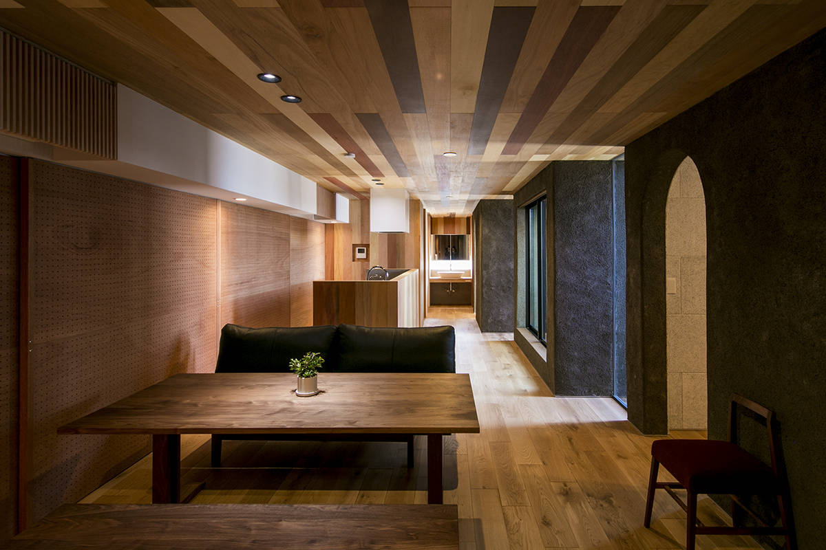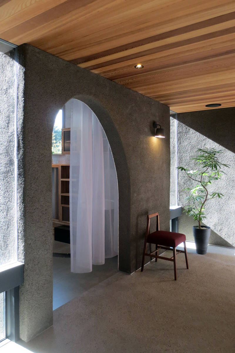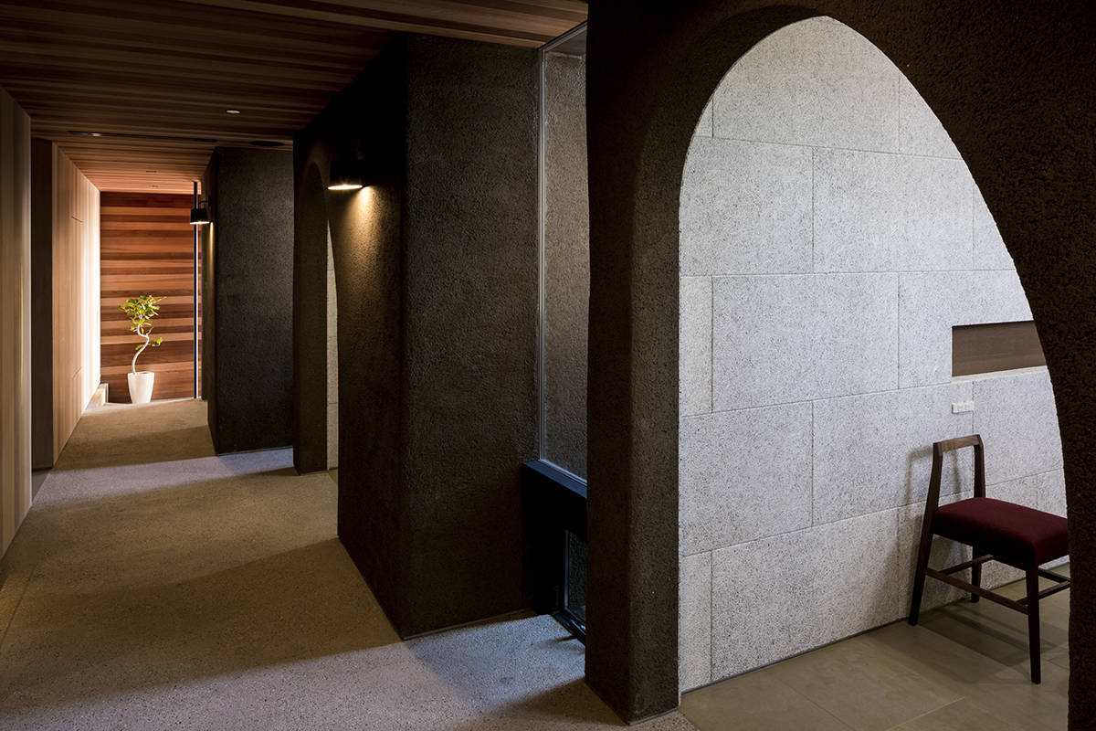 地産の砂利を大量混入したオリジナルモルタルを大胆に掻き落とした壁は、荒々しくも素朴な表情をもち、光のあたり方次第で目まぐるしく色味が変貌します。職人の手仕事の跡を敢えて残した左官壁は、新建材ばかりで構成された無機質な街並の中で、よい意味で新築らしくない独特な風合いと温もりを醸し出しています。