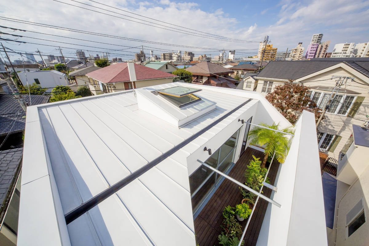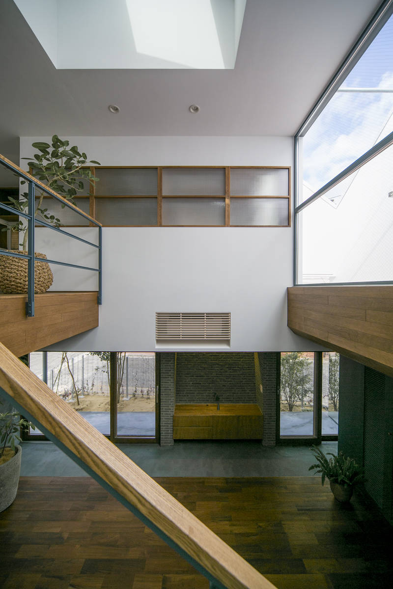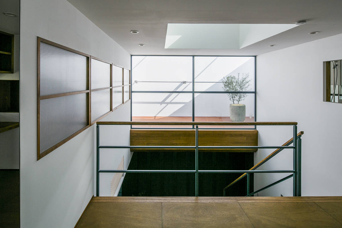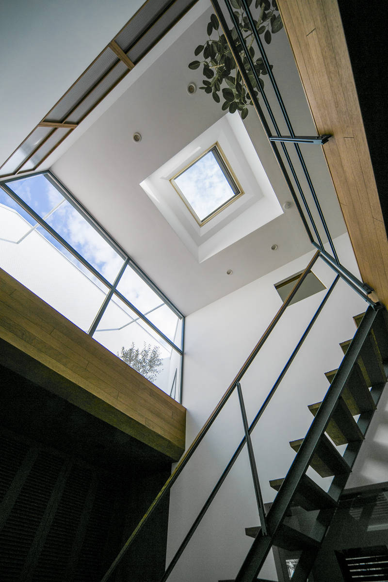 直射日光が苦手という住人の意向を考慮し、この吹抜はできるだけ天空光や反射光で明るくするよう工夫を施しています。1辺7.2mの正方形プランの中心に、採光と排熱、通風に有効な大きな天窓1台を備えた吹抜空間を据え、この明るい「まんなか」を起点に周囲の諸空間の設計を進めて行きました。