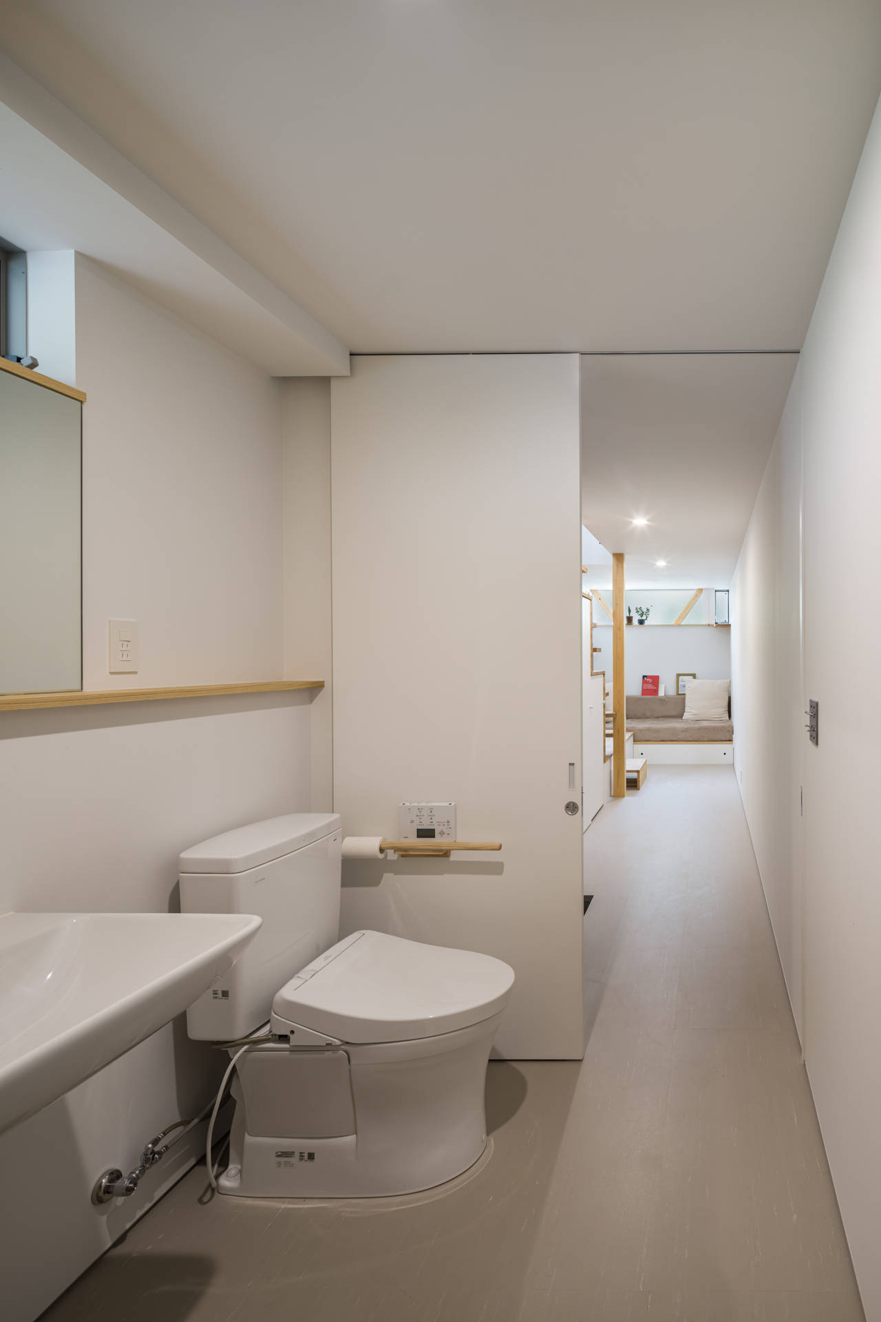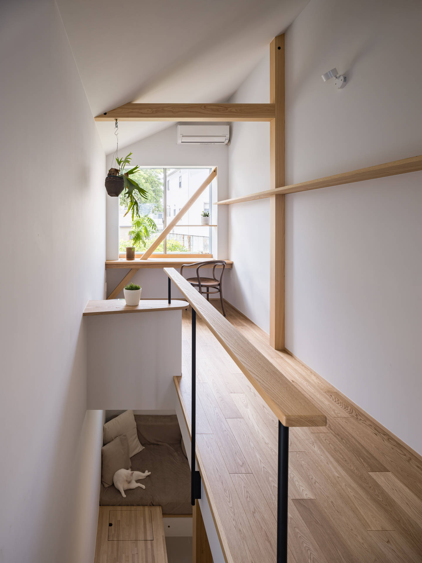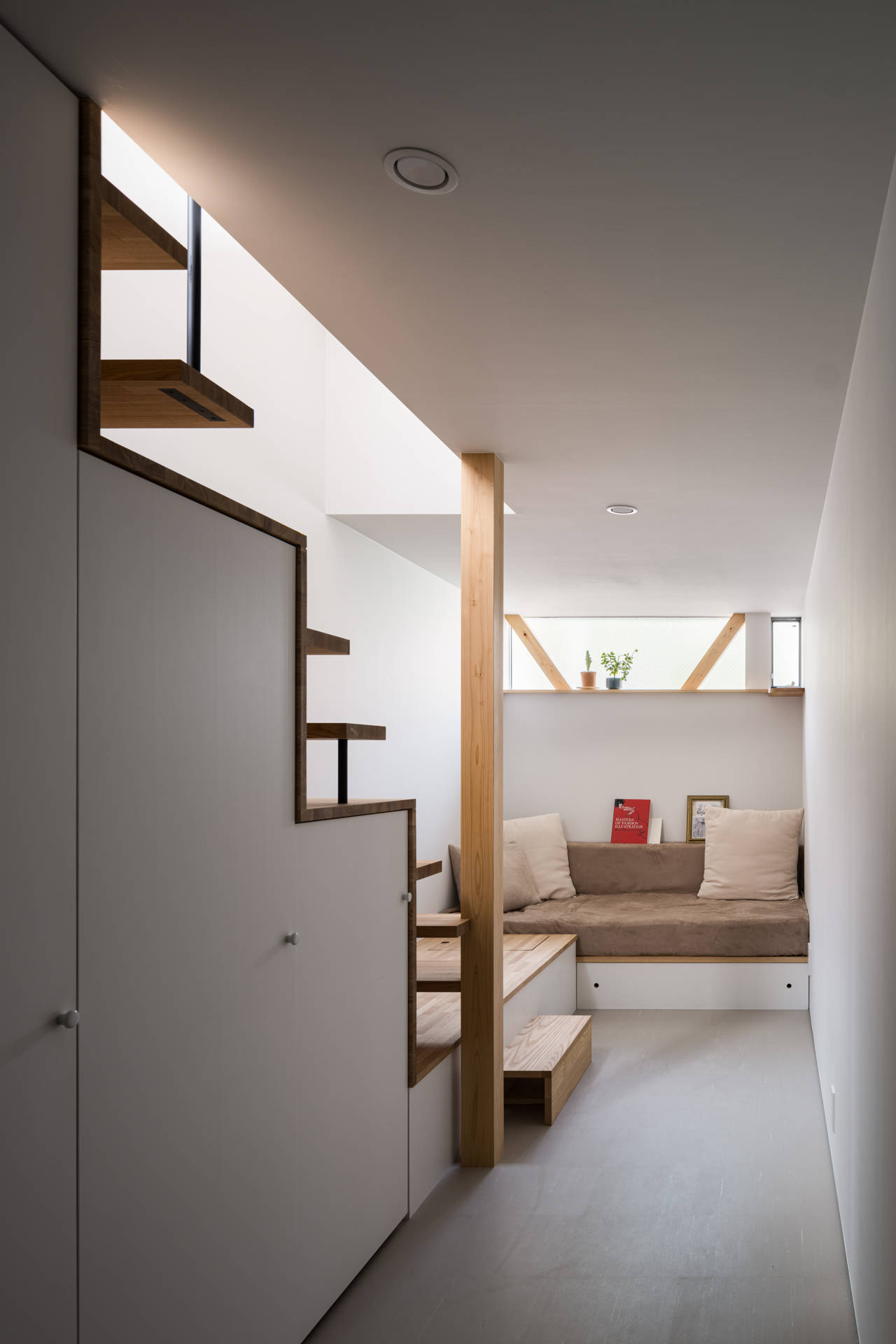 敷地間口の狭さゆえ、敷地の購入前からどのようなすまいならば建築可能かを相談しながら進めました。いっぽう、南側は幅の広い道路、北側は公園に面し、奥へ抜ける開放感や緑の借景が期待できました。その魅力を活かせば小さいながら気持ちのよいすまいがつくれそうだと考えました。隣家との関係や、持続的に外壁や設備のメンテナンスができるスペース、来客時の駐車、と最低限必要な「空き」を引き算していくように位置を決め、結果、細長い矩形のすまいとなりました。そして、その「空き」を利用してアプローチを奥へとひきこみ、建物の中央部に玄関や階段といった動線を配置することで、細長い空間の両端に「溜まり」となる居場所をつくりました。