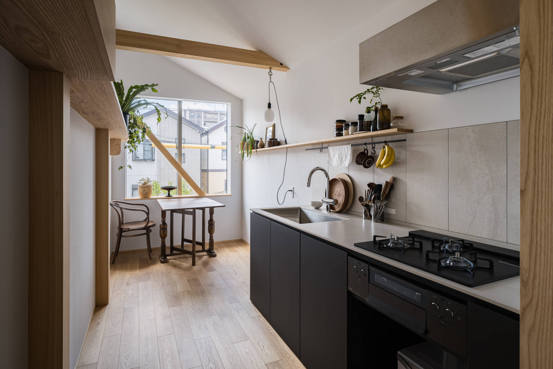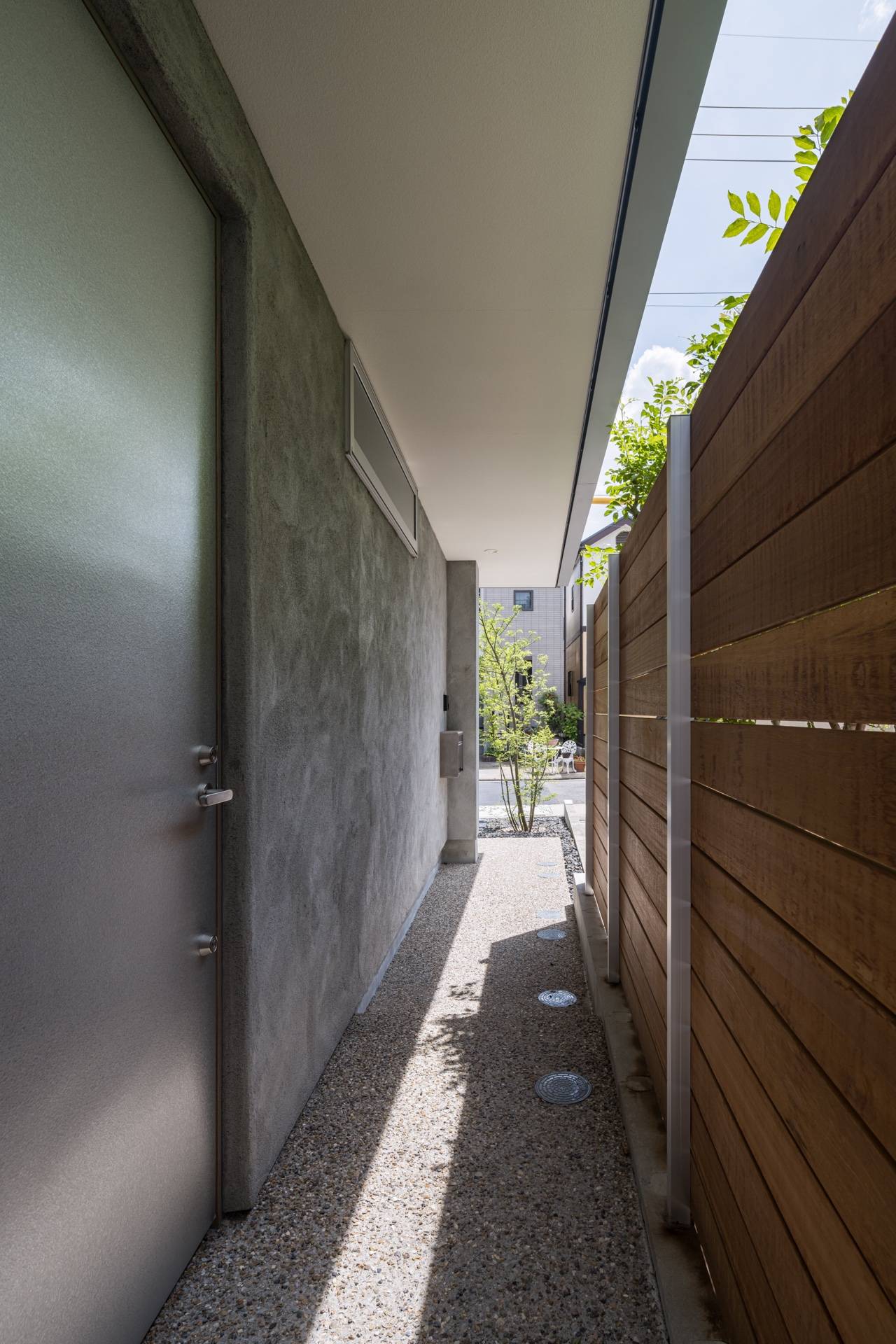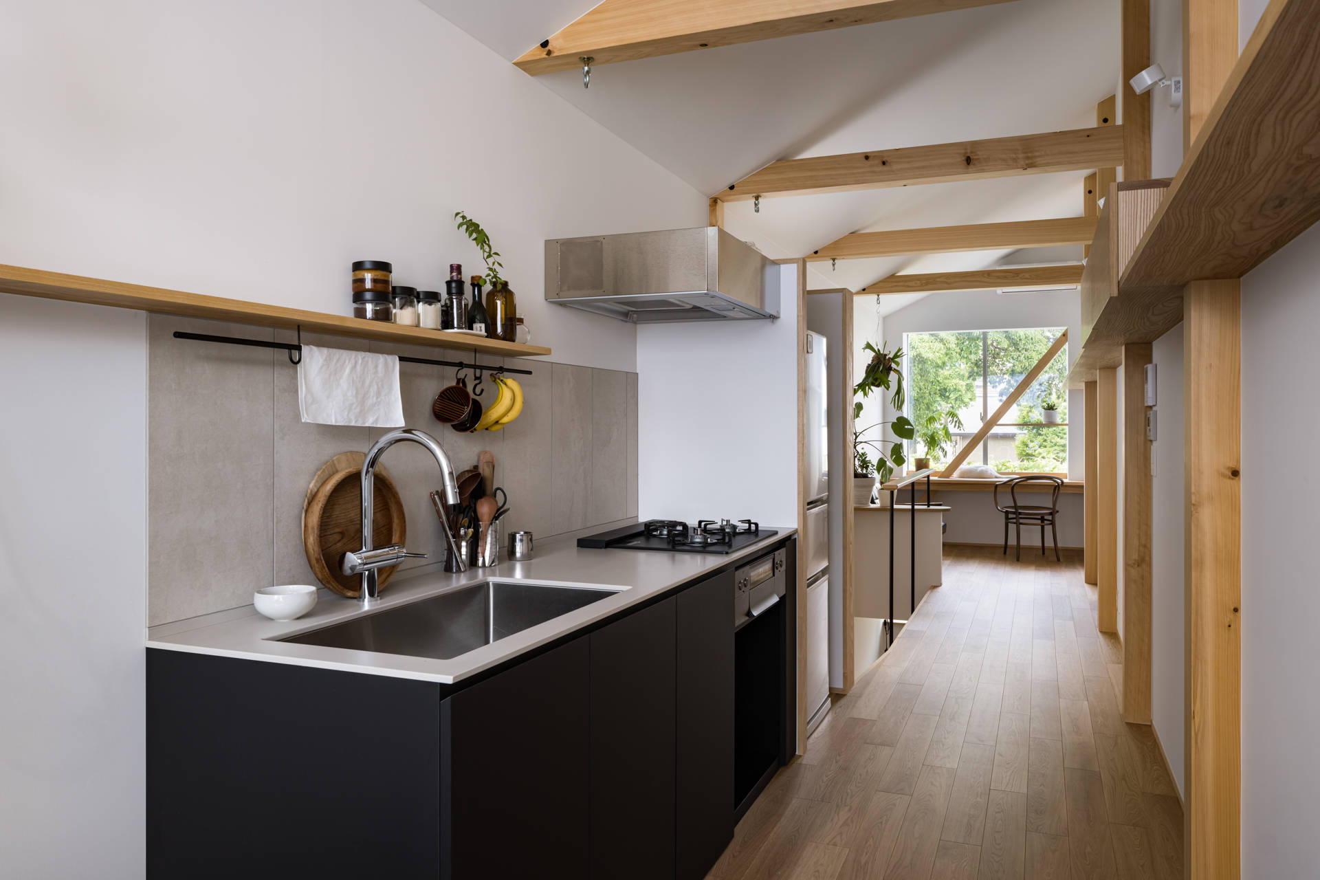 敷地間口の狭さゆえ、敷地の購入前からどのようなすまいならば建築可能かを相談しながら進めました。いっぽう、南側は幅の広い道路、北側は公園に面し、奥へ抜ける開放感や緑の借景が期待できました。その魅力を活かせば小さいながら気持ちのよいすまいがつくれそうだと考えました。隣家との関係や、持続的に外壁や設備のメンテナンスができるスペース、来客時の駐車、と最低限必要な「空き」を引き算していくように位置を決め、結果、細長い矩形のすまいとなりました。そして、その「空き」を利用してアプローチを奥へとひきこみ、建物の中央部に玄関や階段といった動線を配置することで、細長い空間の両端に「溜まり」となる居場所をつくりました。