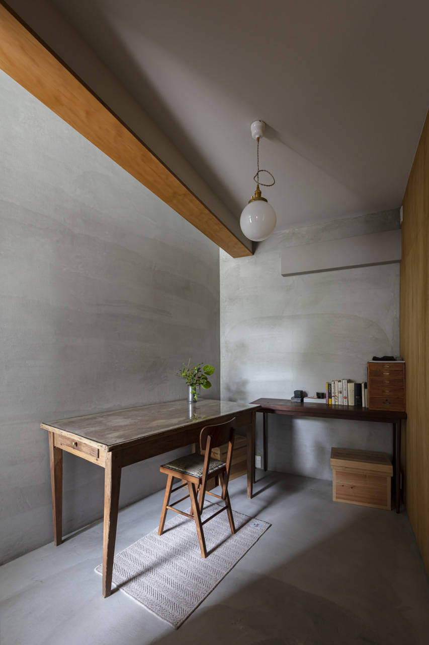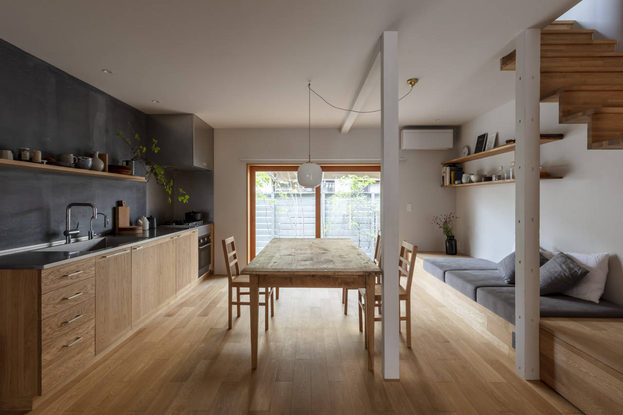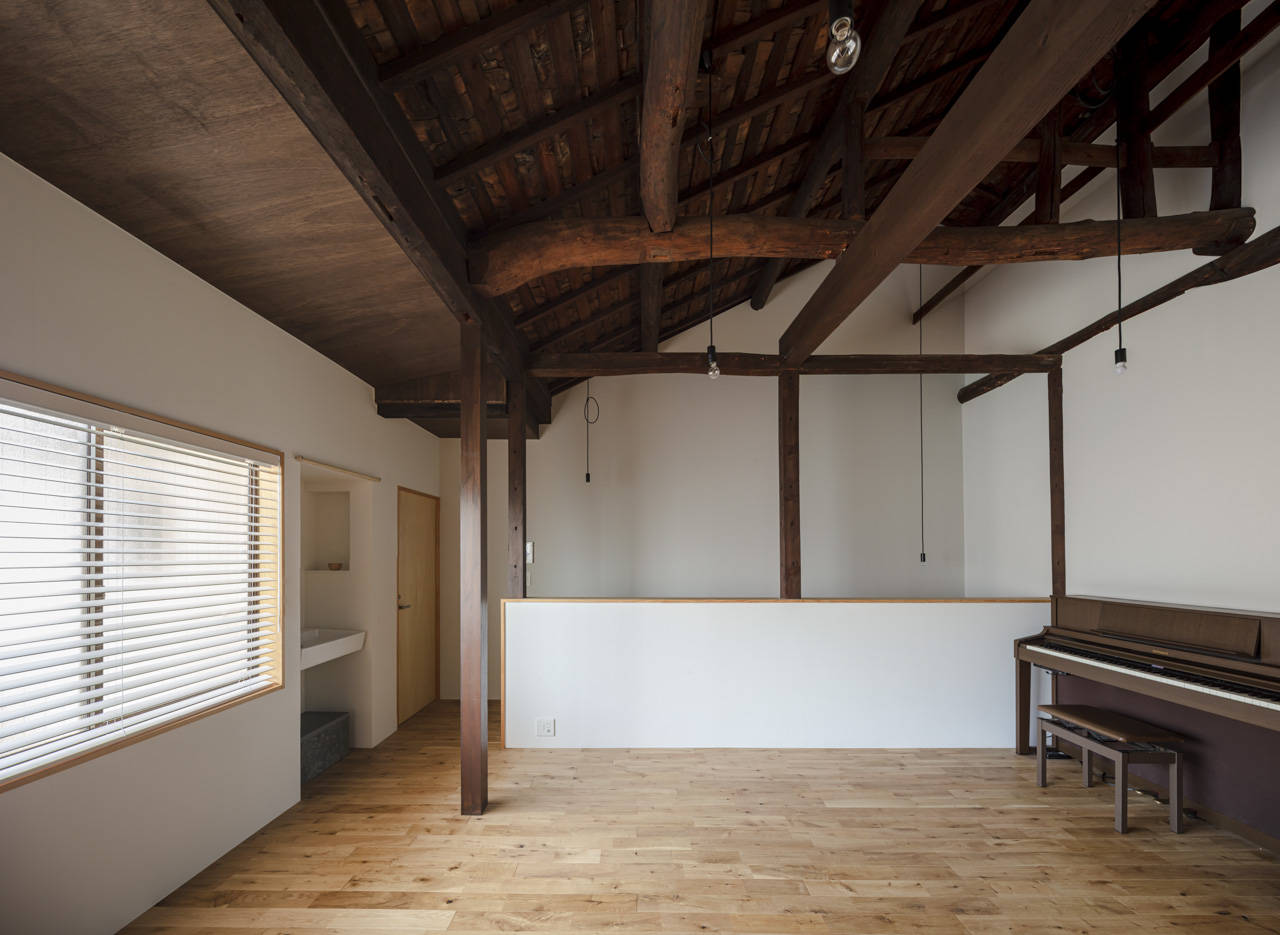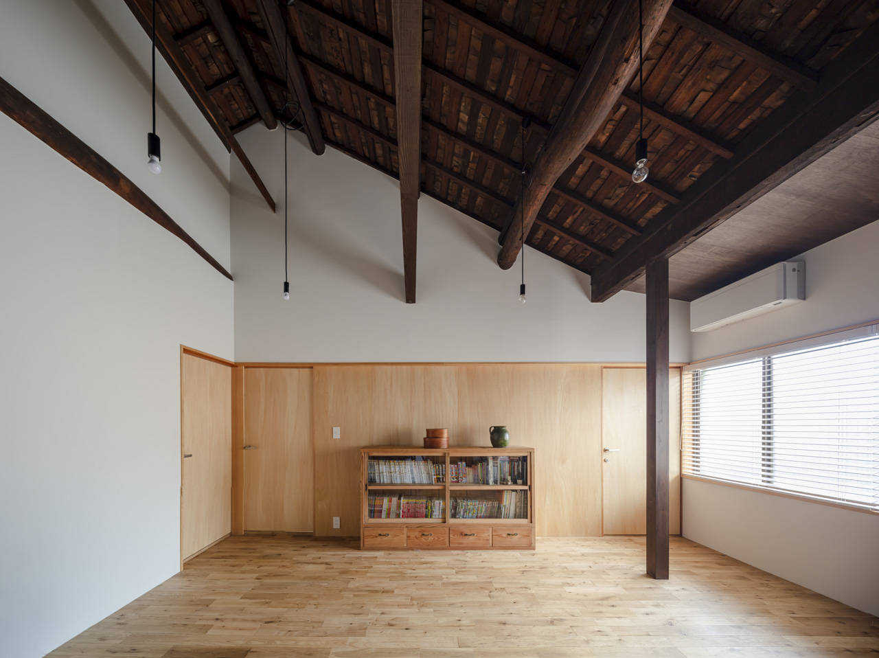 内部は今までに何度か改修、増築がなされており、補強が必要なところには壁を設けながら、既存の柱や壁、階段の位置は大きく変えないように空間を再構成しました。1階はいくつかの素材感がある材料を採用し、穏やかながらも短調にならないよう丁寧に整え、一方で、2階は天井を抜いて、既存の野地板や屋根架構をそのままあらわし、この長屋の歴史が垣間見える空間となっています。
