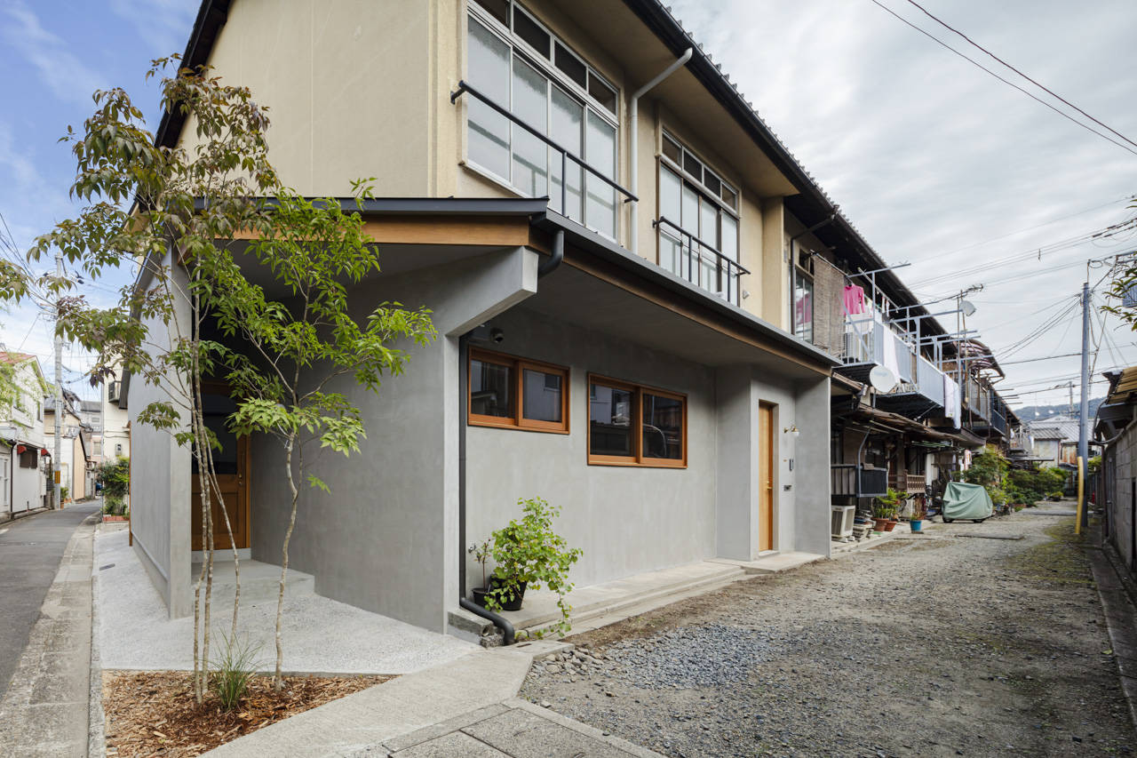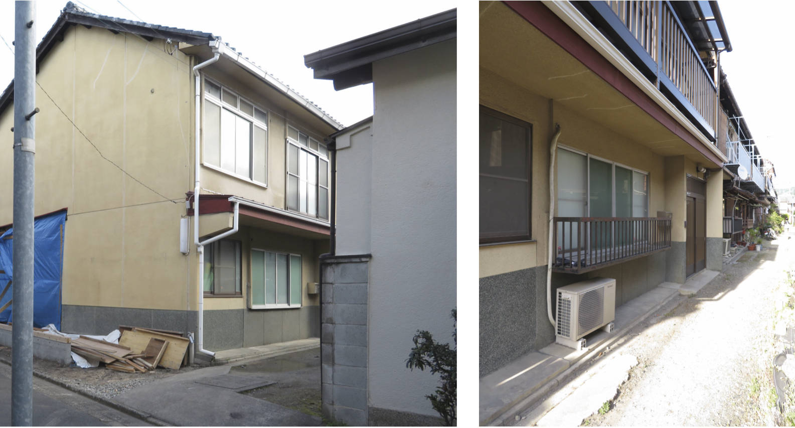 敷地は大通りから入った静かな住宅地の中にあり、横4戸、上下2戸の重層長屋が数棟並んでいます。某企業の社宅としても使われていたという築100年近くの歴史があり、今回はそのうちの一棟、端の一戸(1+2階)を改修しました。