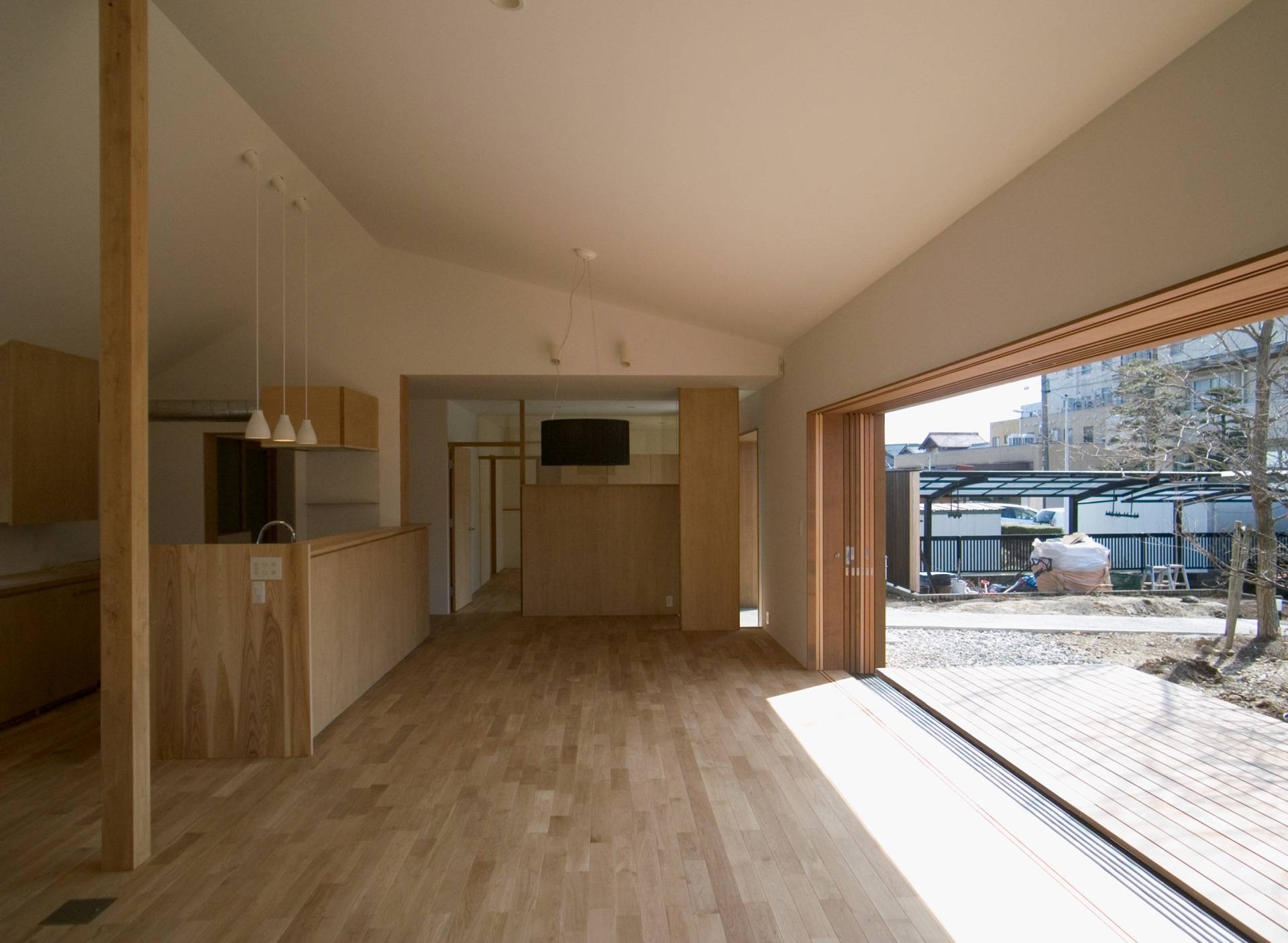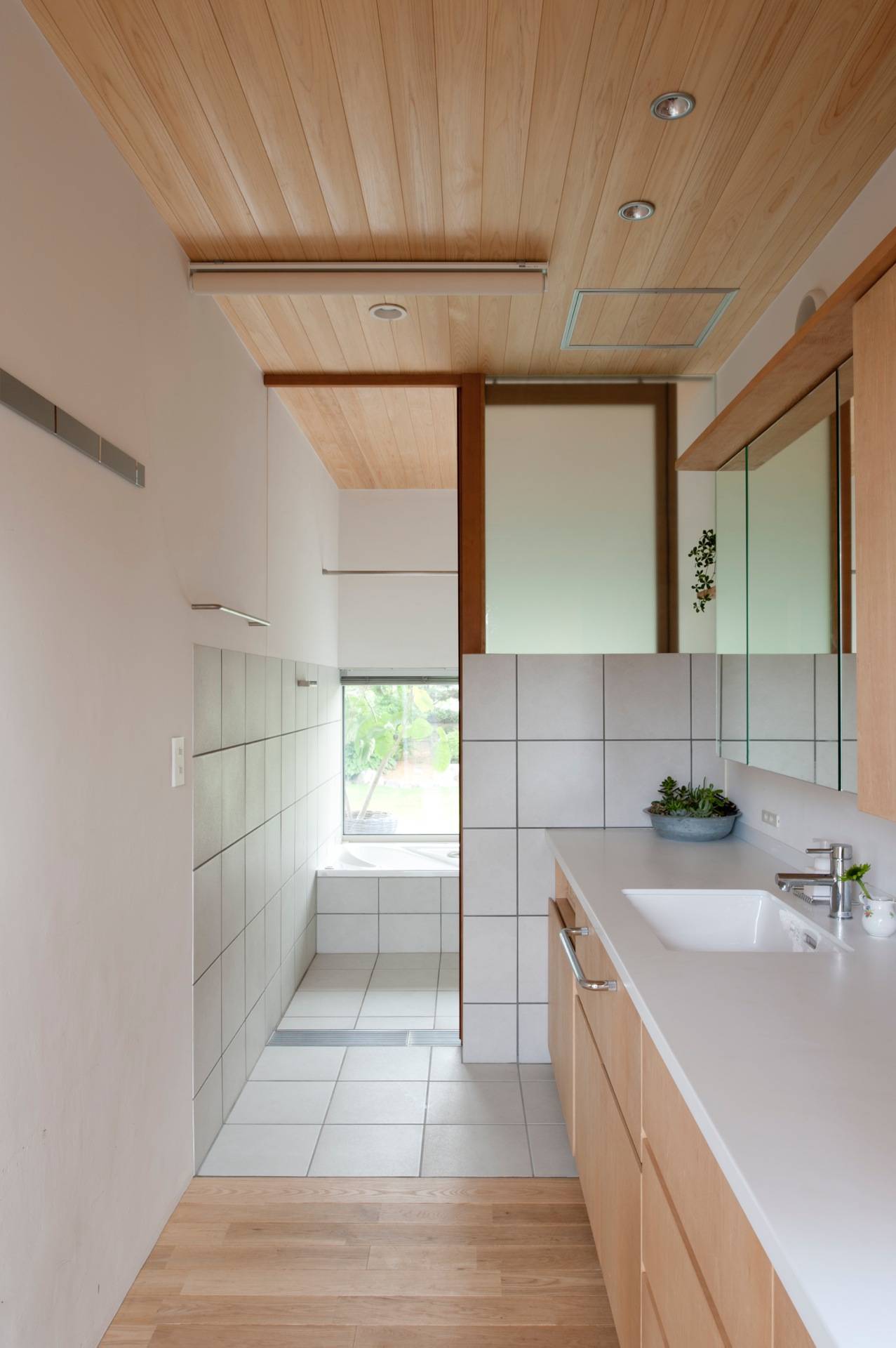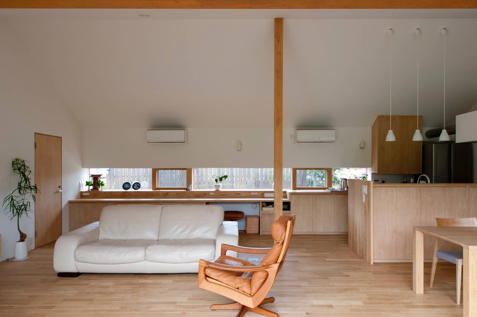 養老山系が眺める南側には大開口と庭と連続したテラスを、北側には高さを押さえた横長窓と作業カウンターを。