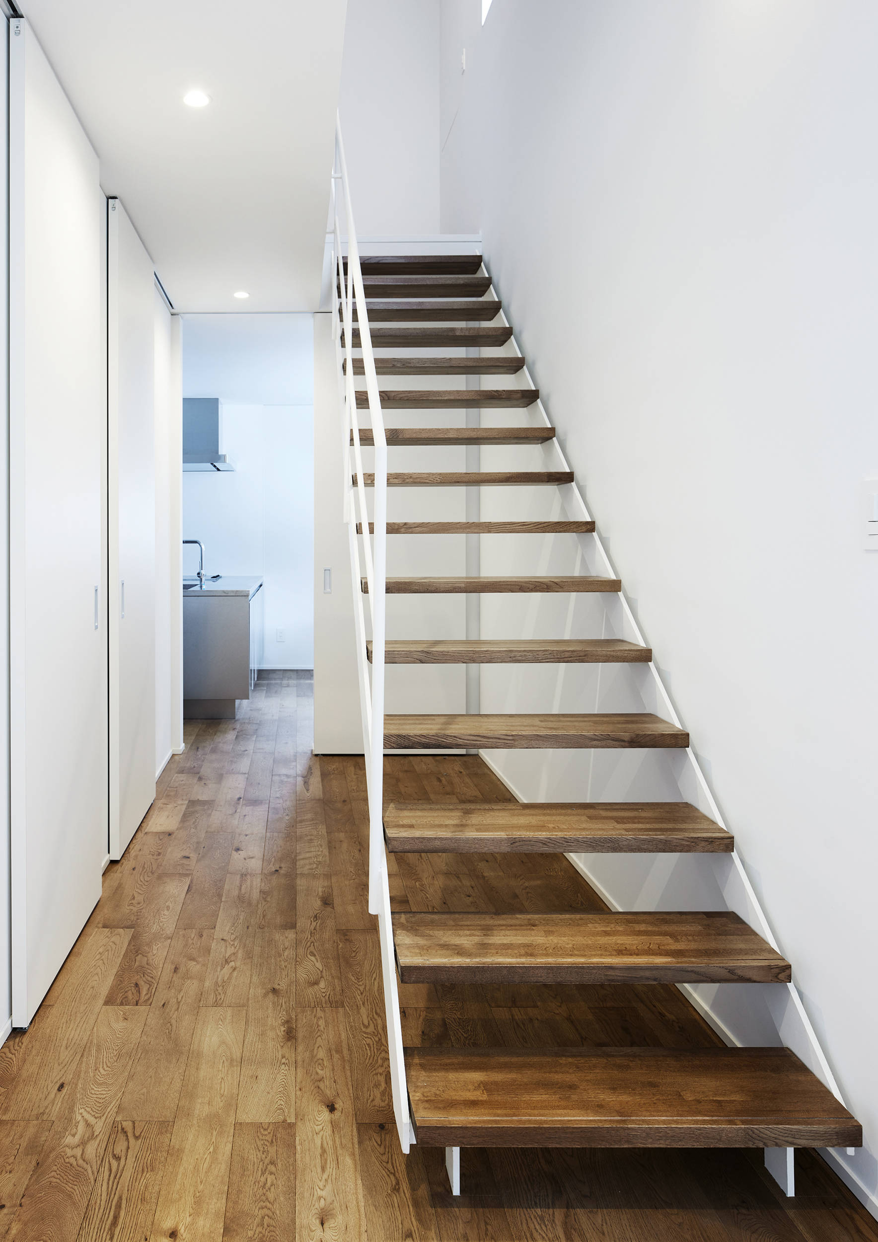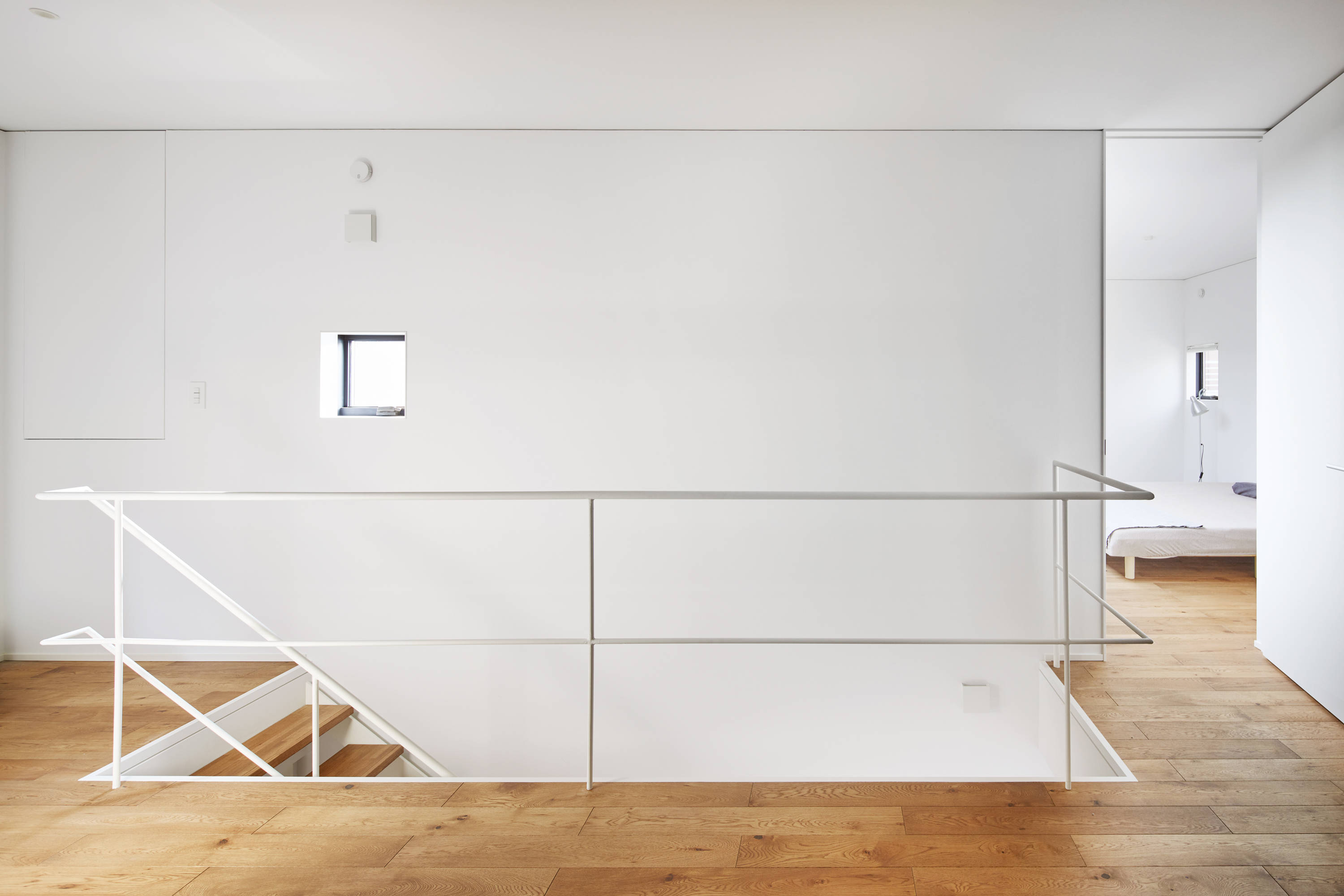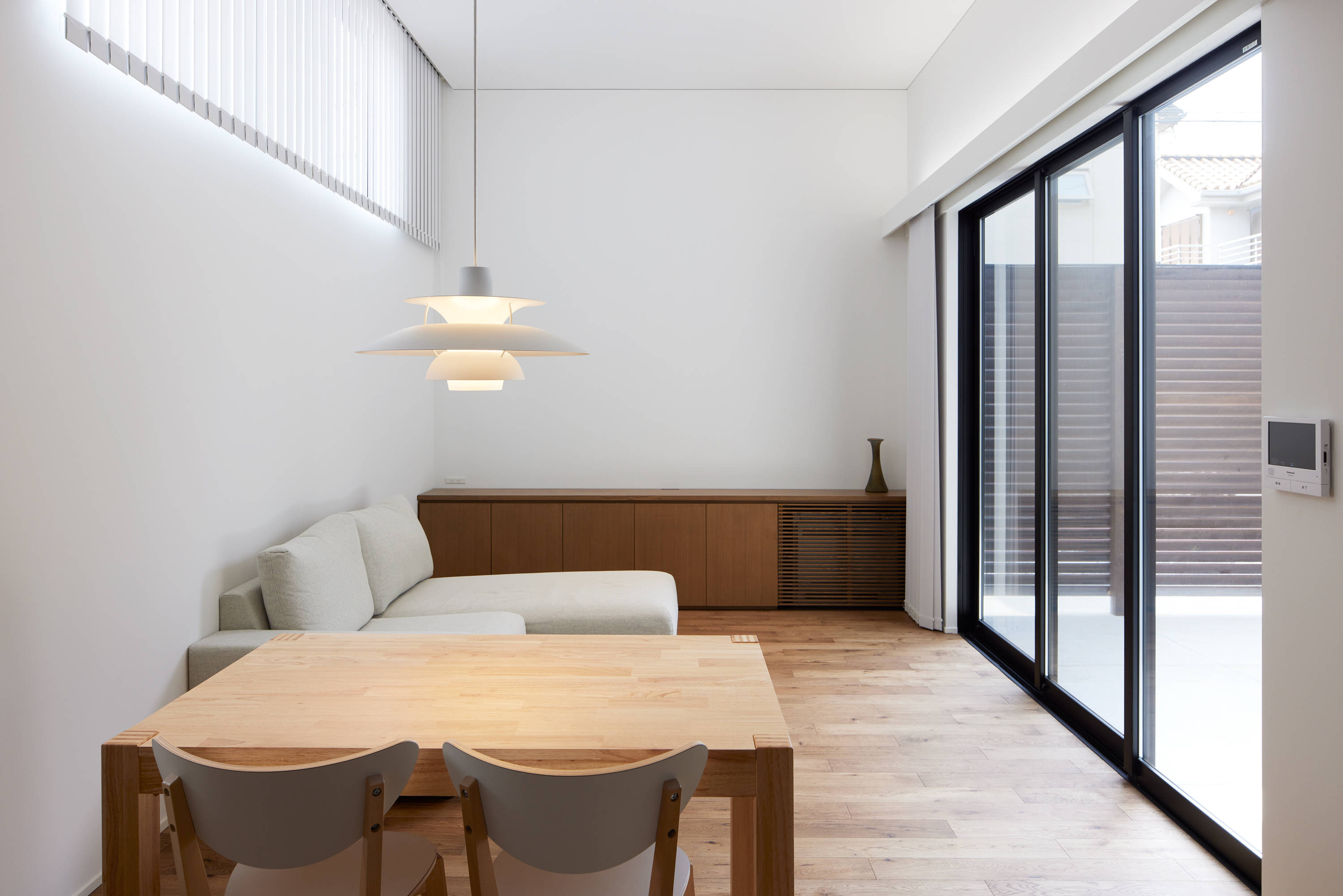 南北に分かれたボリュームは南側にリビング、北側に寝室•作業スペースなどと機能は明確に分けられるが、中庭を介す事でそれぞれが完全に孤立することなく、光が入り、風が抜けていく気持ちの良い繋がりのある空間が生まれた。