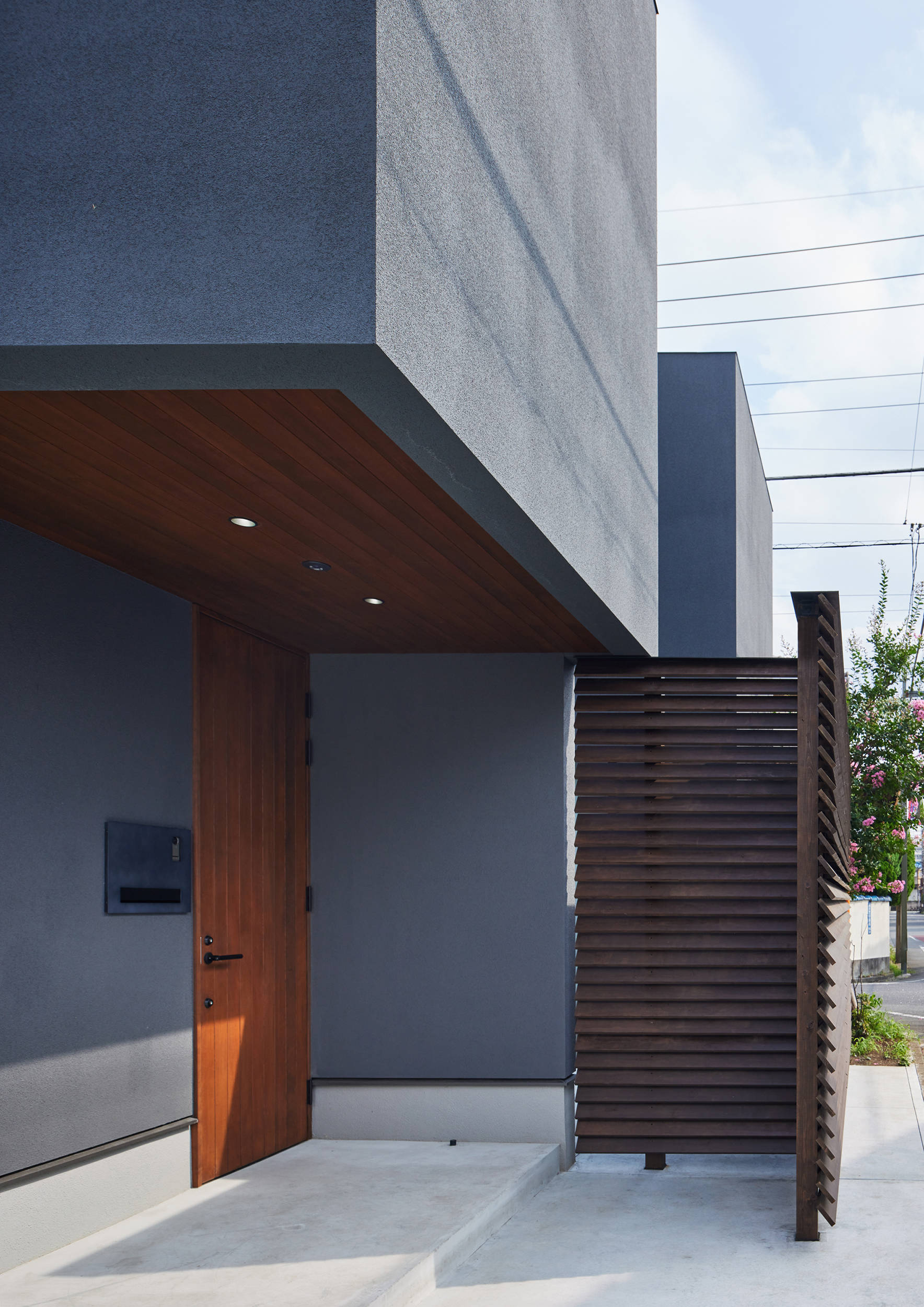 角地に位置し、近所の小学校の通学路となっているため交通量が多く、単純に南に向けた建物配置だと日々の生活が落ち着かない。