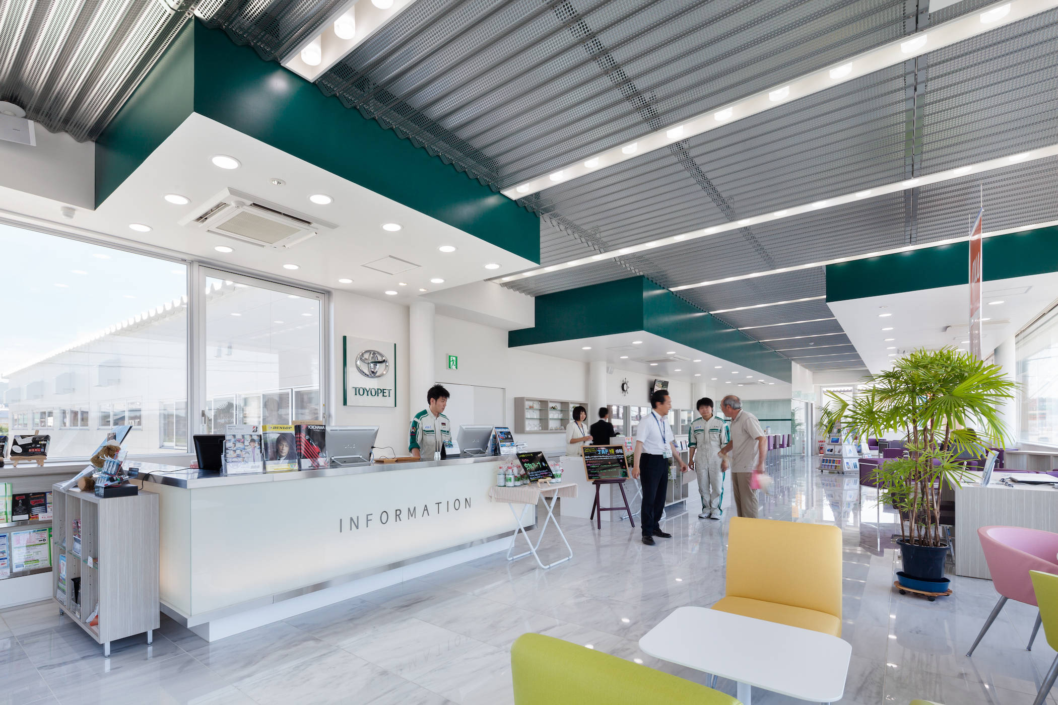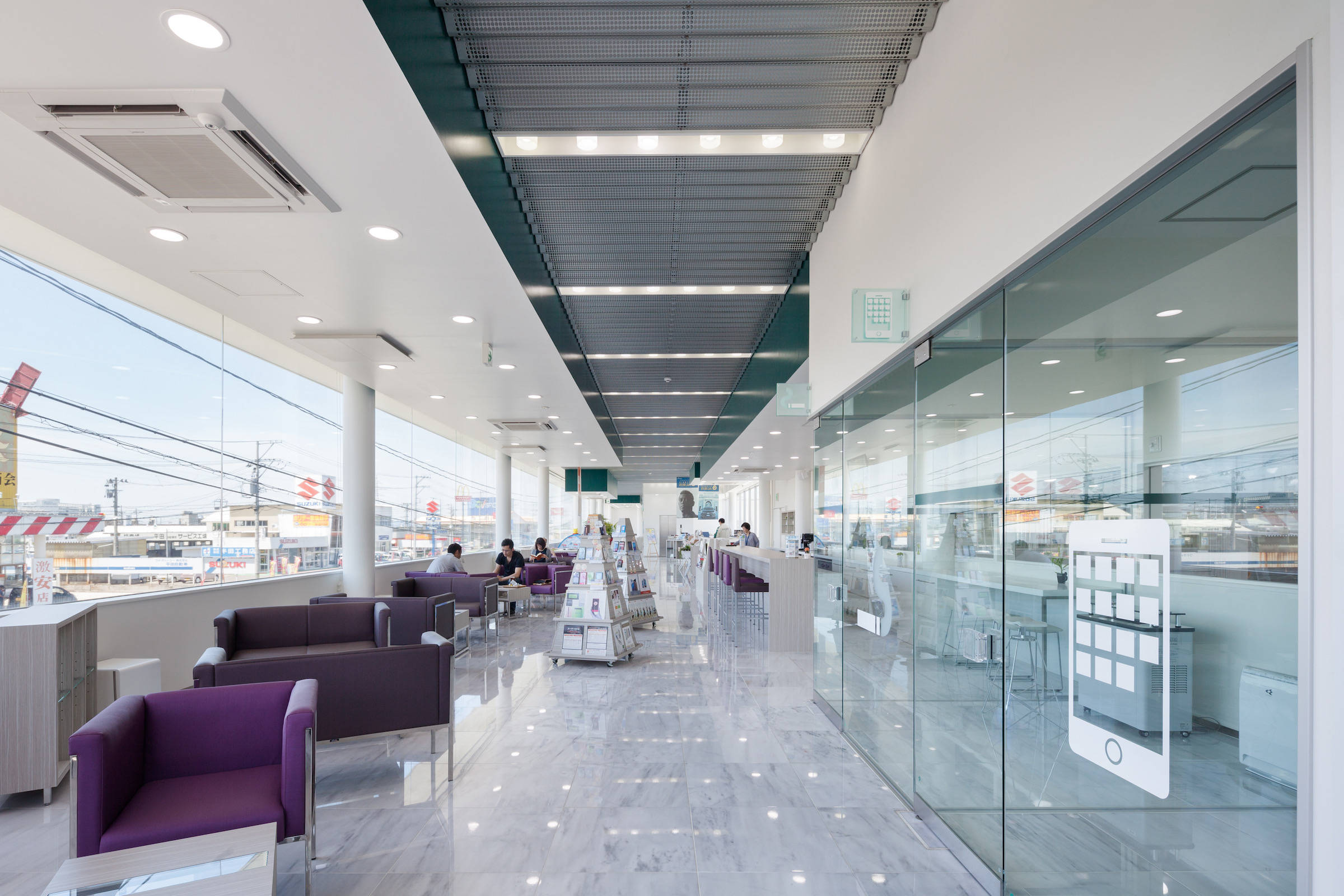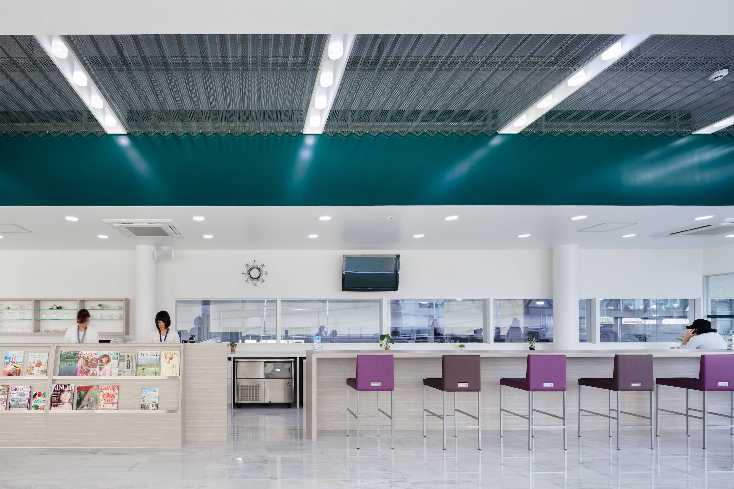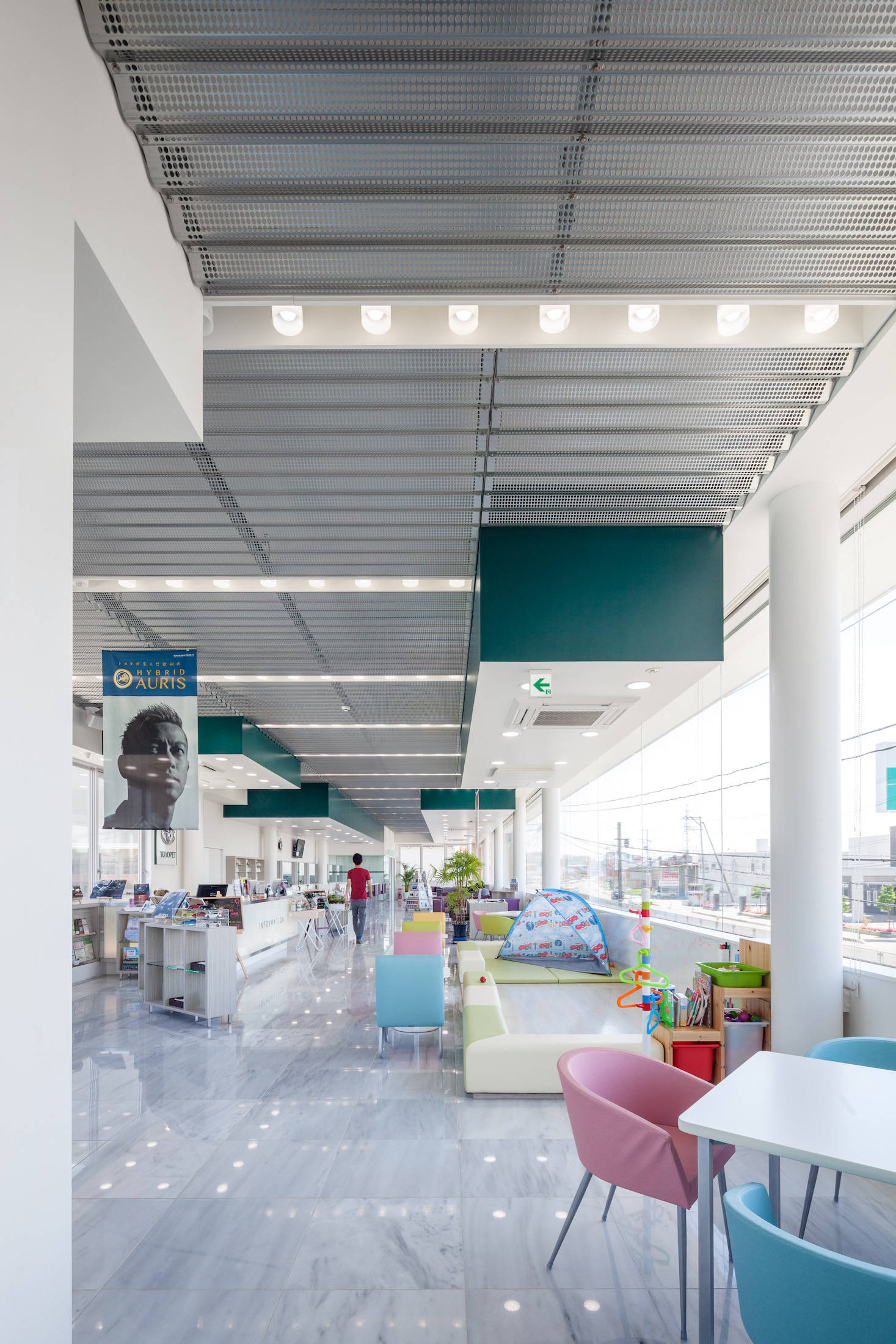 天井は、パンチングを施した亜鉛メッキのスチール折半を全体に張り詰め、要所要所に天井を低くぶら下げることで、車のスケールの大きな空間の中にヒューマンスケールの居場所を提供しました。