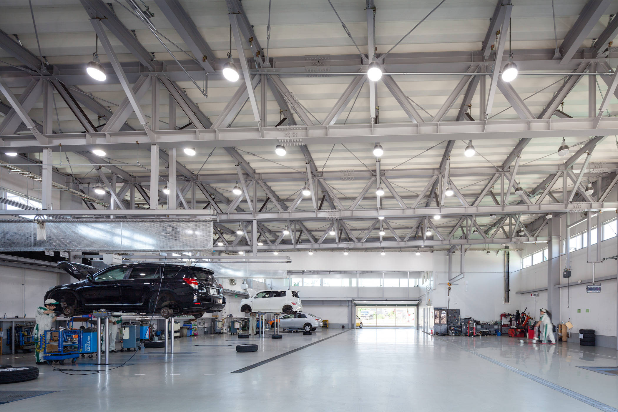 お客さんのスペースは冬の利用を考慮して2階に持ち上げ、整備工場を見下ろす関係を作っています。