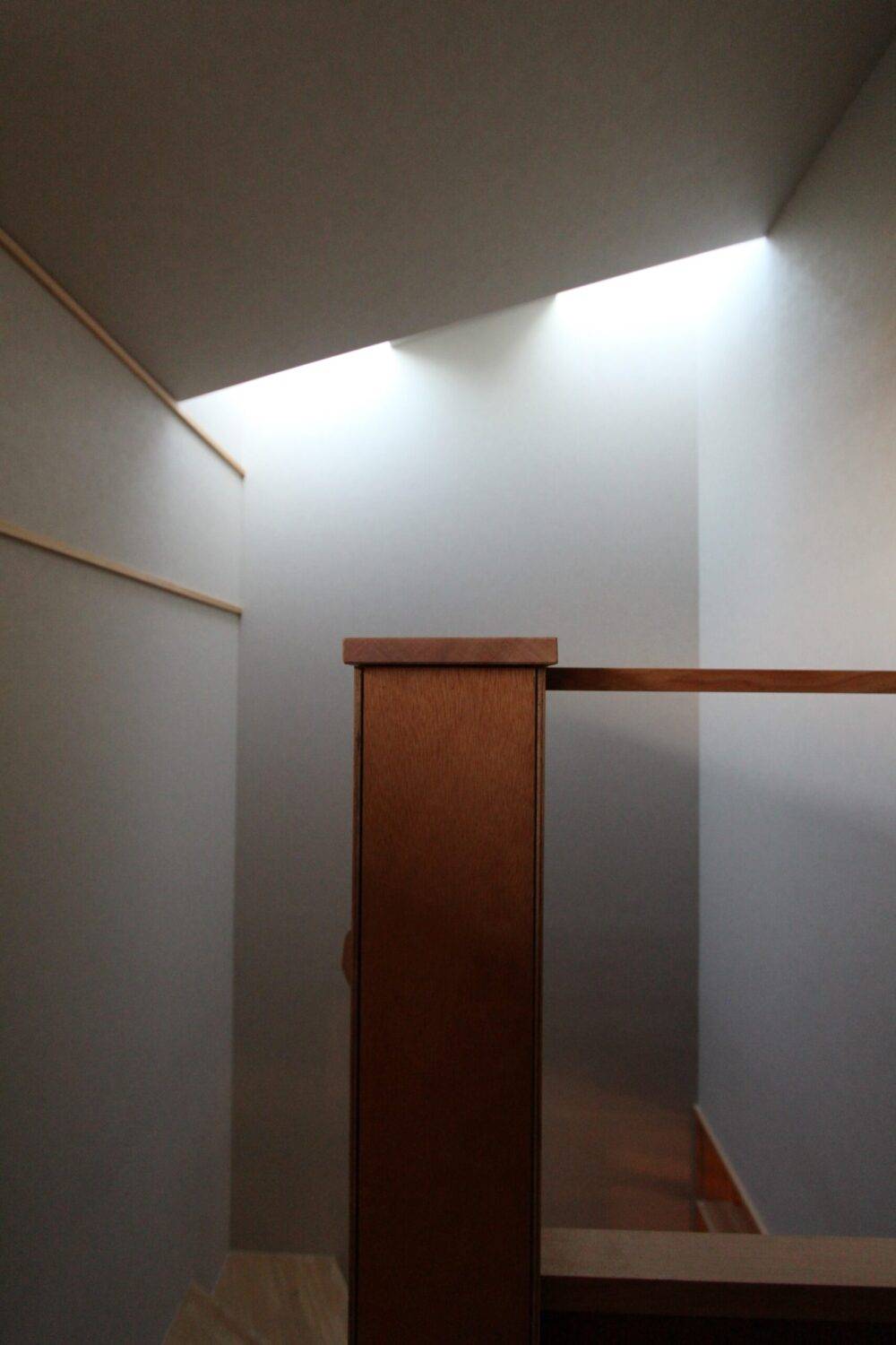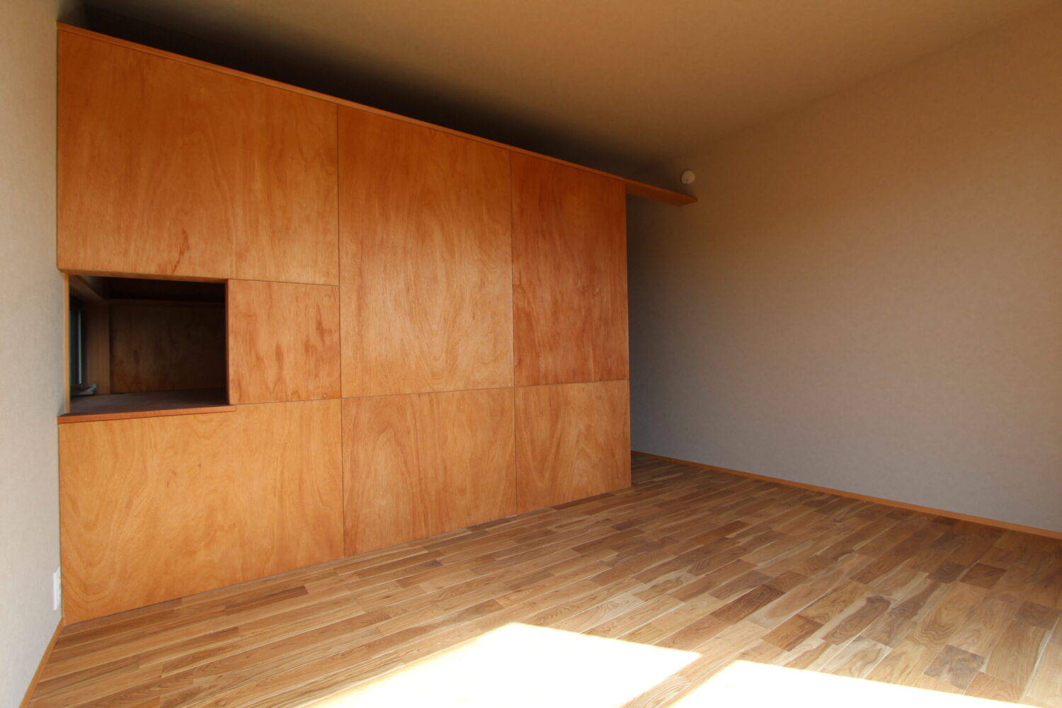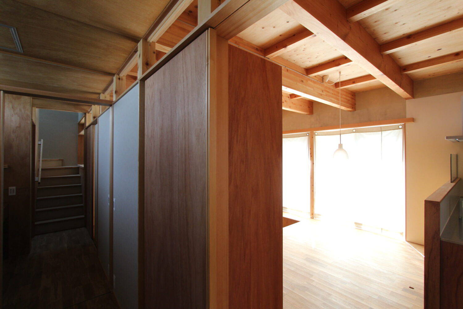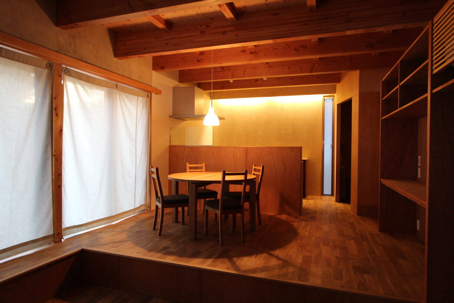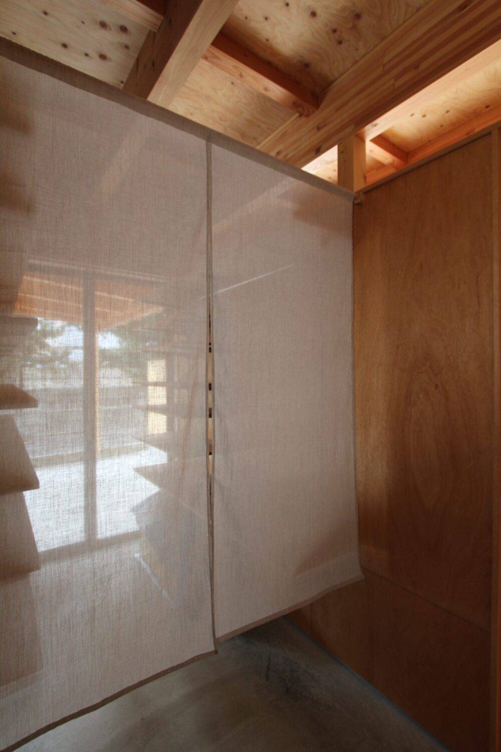 要望にあった木を感じられる計画とするため、コストバランスにも考慮し、内部の仕上げは一階天井に梁床を現しとしている。壁はラワン材が主材。開口を室内に添わせ光を強く感じる計画とはせず、ラワン材に間接的に光があたり柔らかく回る光と生まれる陰影によりやさしい室内空間を提案した。