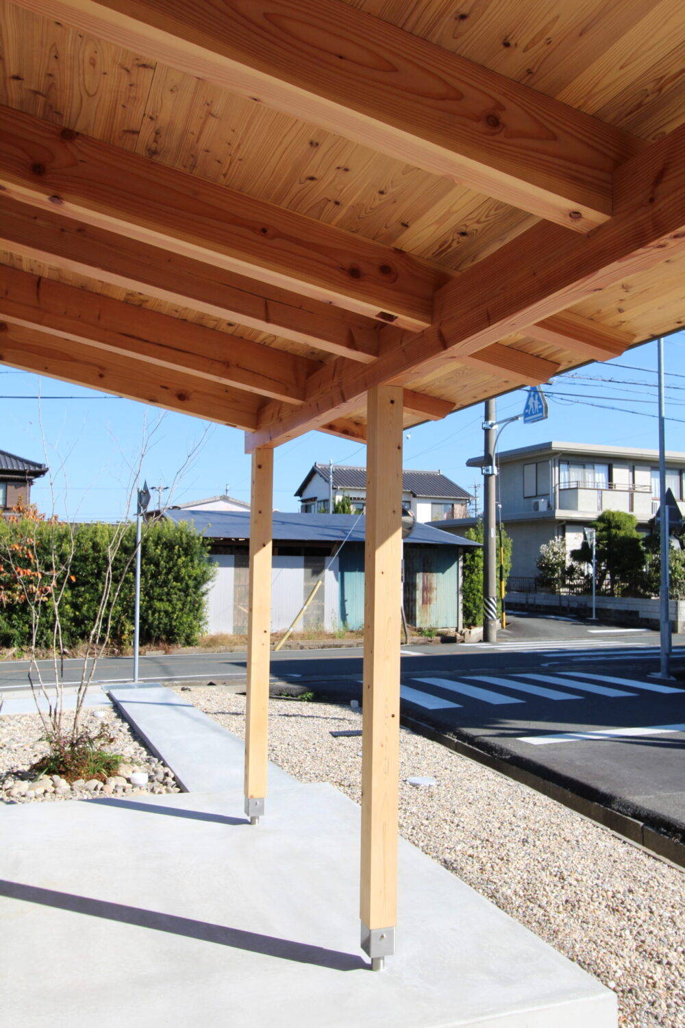 敷地は矩形、ほぼ平坦な敷地に北東の二方向接道となる角地に位置する。農業を営む近隣には昔ながらの簡素なつくりの農業用倉庫も多くみられ、その街並みに馴染むよう切妻屋根を架けた矩形の二階建てに土庇を構えた住居の計画とし、重心が低く安定感のある外観を添えた。