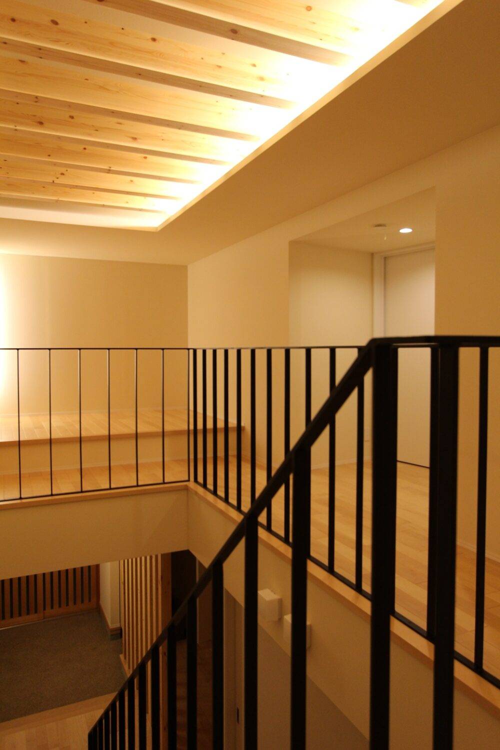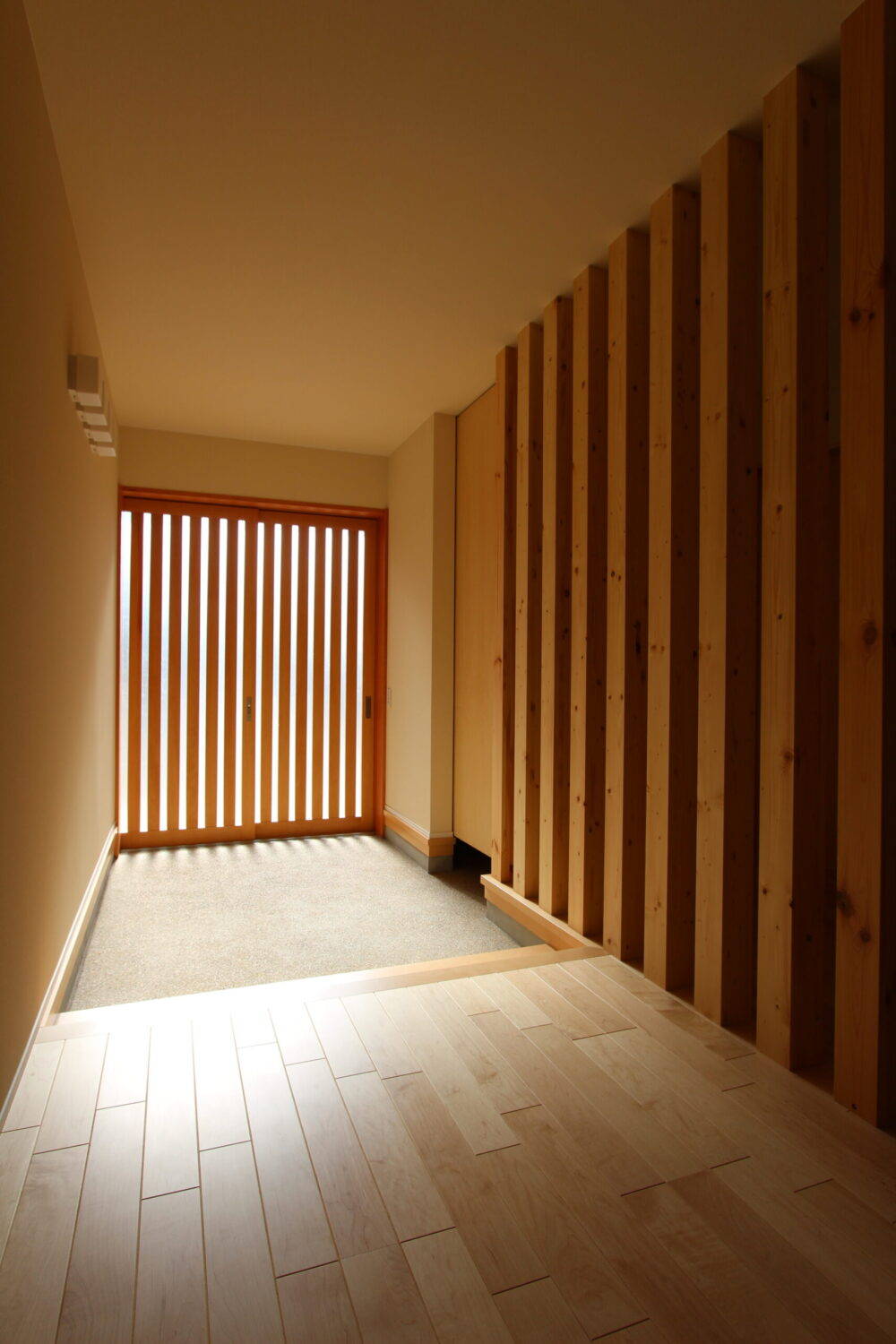 要望からは総二階の印象を受けたが南側の接道面には二階をセットバックさせ、建て替え前の落ち着きのある下屋のある外観を設え継承した。年に一度、町内では盛大なお祭りが催される。道路を挟んだ南側隣地には山車が納められている蔵があり、町内の人々は賑わいの中こちらのお宅は皆の立ち寄り処ともなり盛り上がる。そのため玄関ホールを広く取り、袖には二間続きの和室を計画している。間取り全体としてこの玄関と二階ともつながるホールを軸に各居室を放射状に設け外形をまとめた。