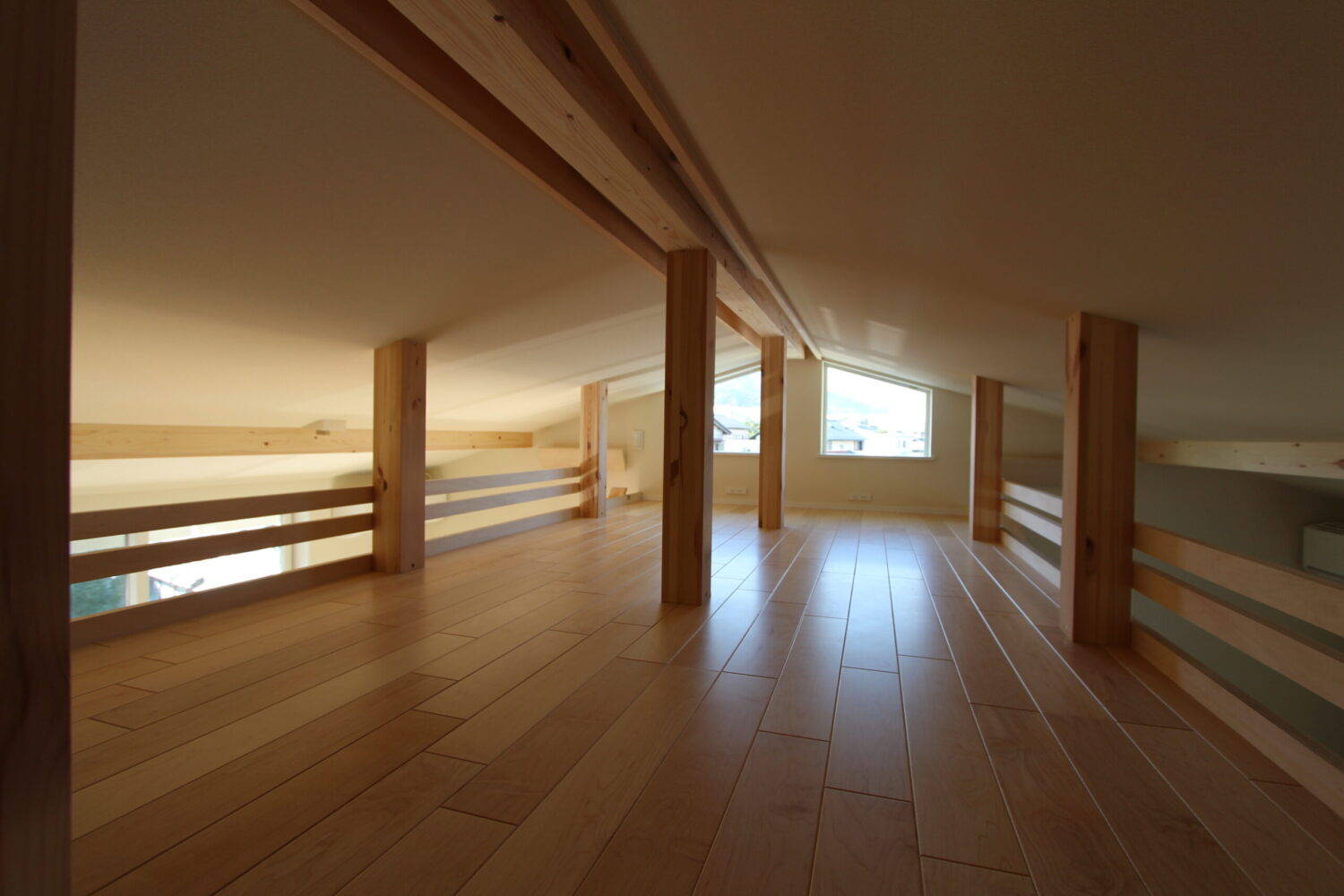 敷地は南側接道、南北に長く各敷地境界が角度を振った変則的な五角形で、敷地境界に沿いながら軸線を持たせ建物外形となる間取りを計画した。宿場町として残る街並みの印象を崩さぬよう、屋根廻り、玄関引戸やバルコニー腰壁に天然木米松をあしらわせ、外壁は吹付仕上にするなど自然素材を用いながらの外観とした。
