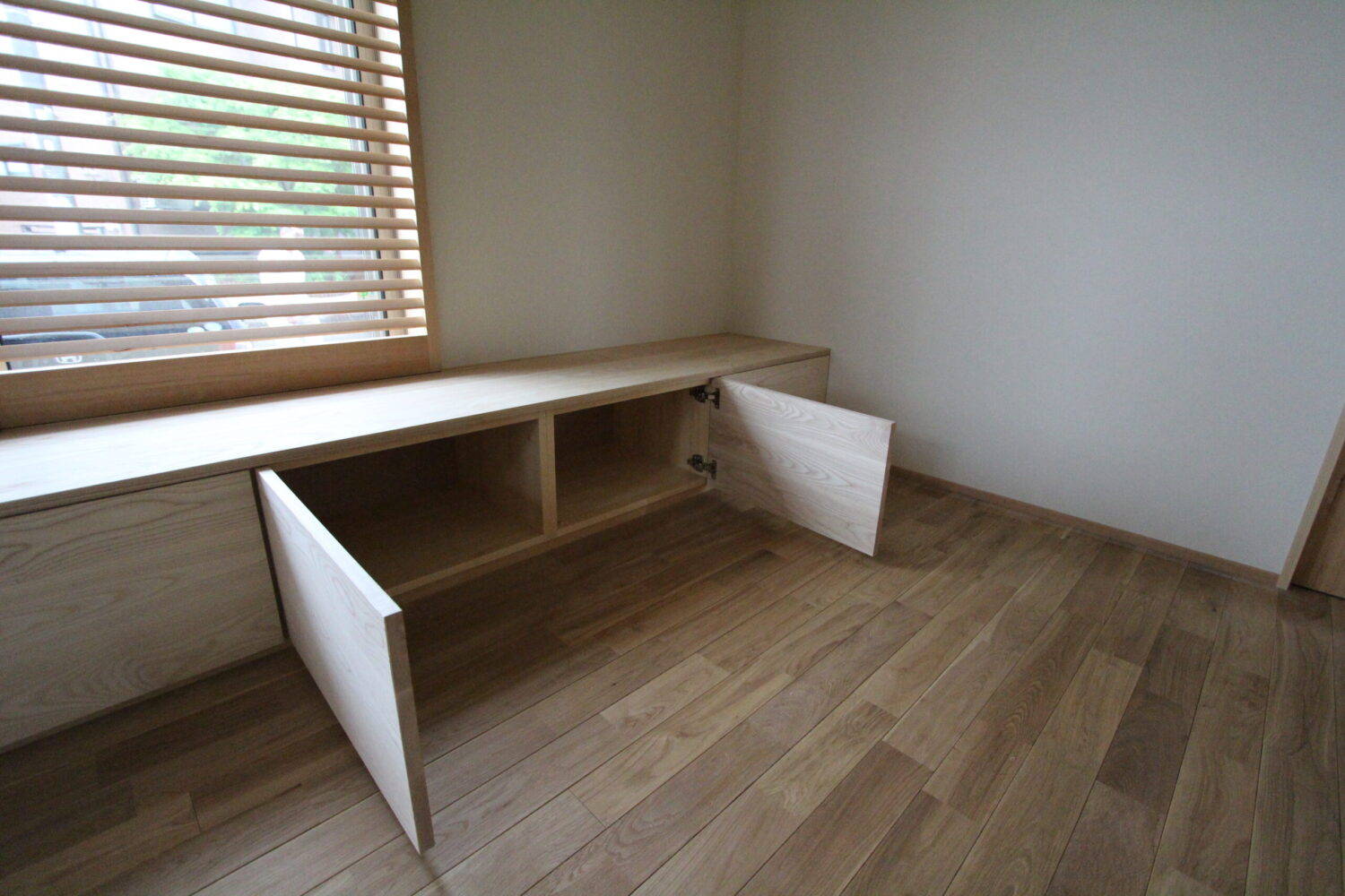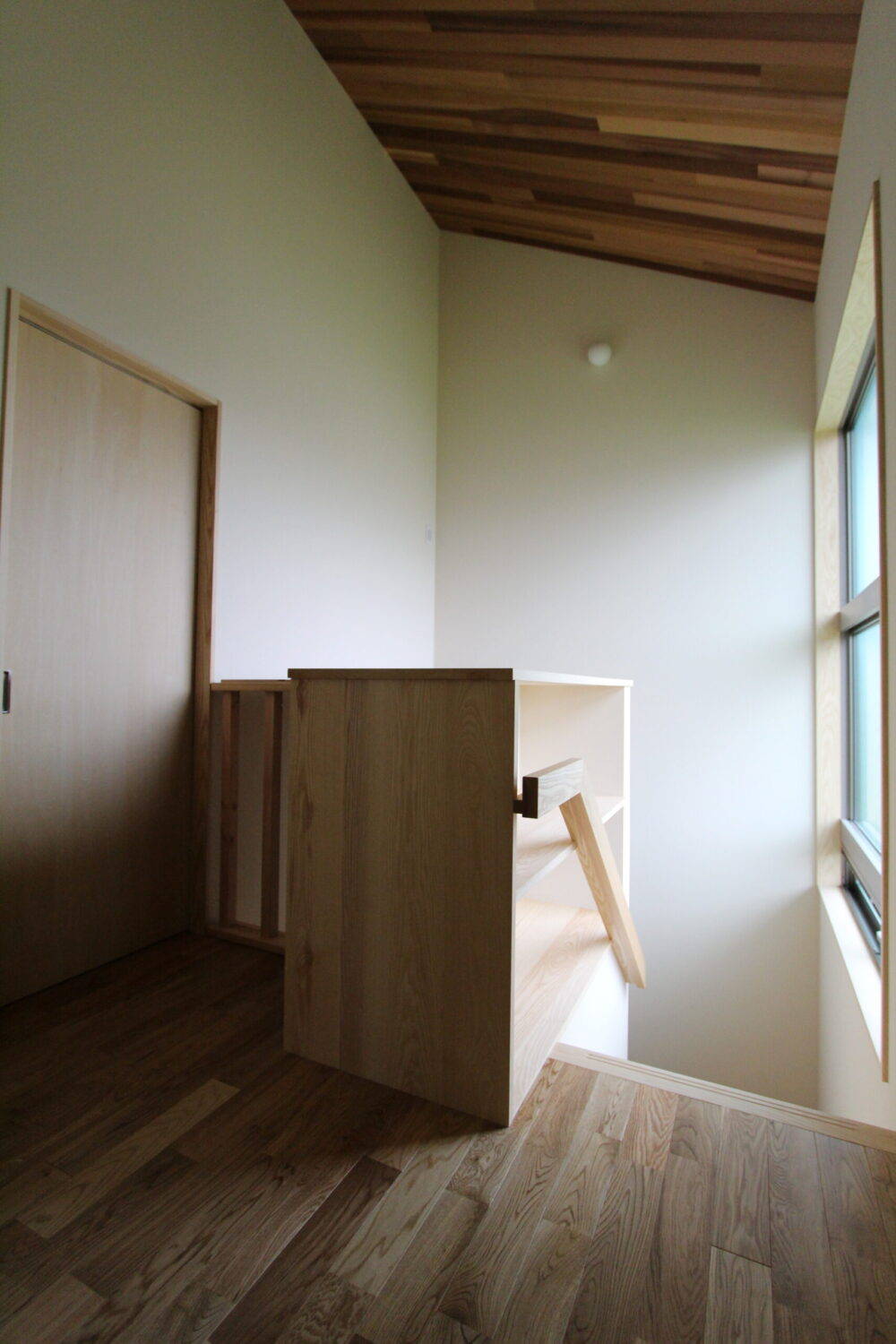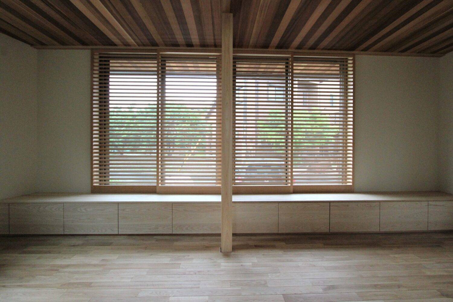 仕上げに床はナラ材を用い、外部内部とも共通材として一部に米杉を設えている。各開口部の配置は天井及び壁を意識し、それに寄せることで自然光を内部へ迎え入れる計画提案とした。