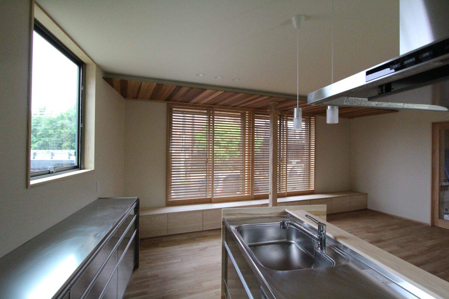 一階にはビルトインガレージと合わせて来客をゆったりと出迎える広い土間、玄関ホール及びLDKを計画。南側には駅を利用する人通りからの視線がある。LDKの南は先のガレージのほかに駐車場3台分の空地を計画に盛り込んでいる。道路境界から6m程の距離を保ってはいるが、行き来する歩行者からの視線を遮りながら光を取り入れられるよう角度をつけた横桟を組み上げた格子引き戸を室内側に計画し生活できるように配慮した住宅である。