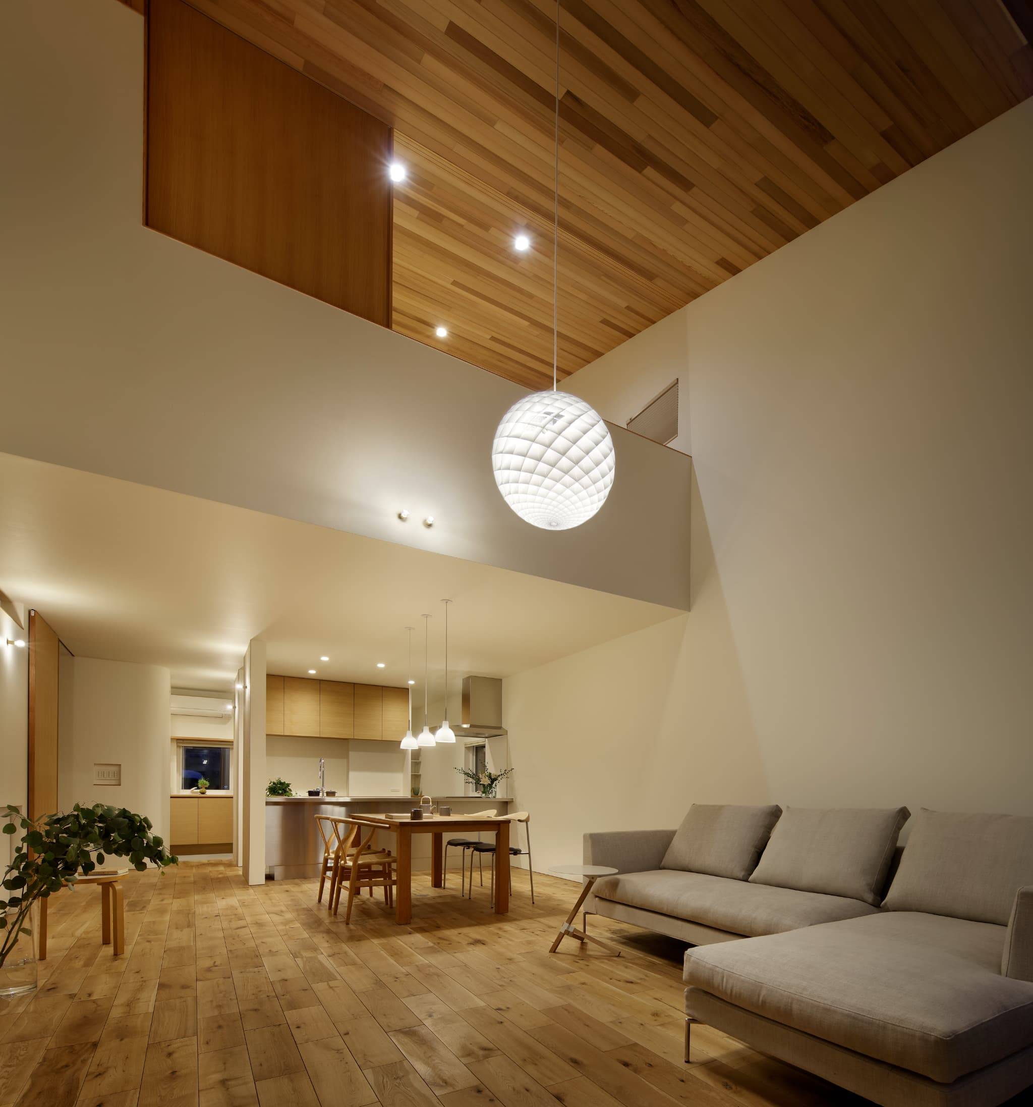 天井に張った木パネリングがその意図を強調する様に視線を導きます。