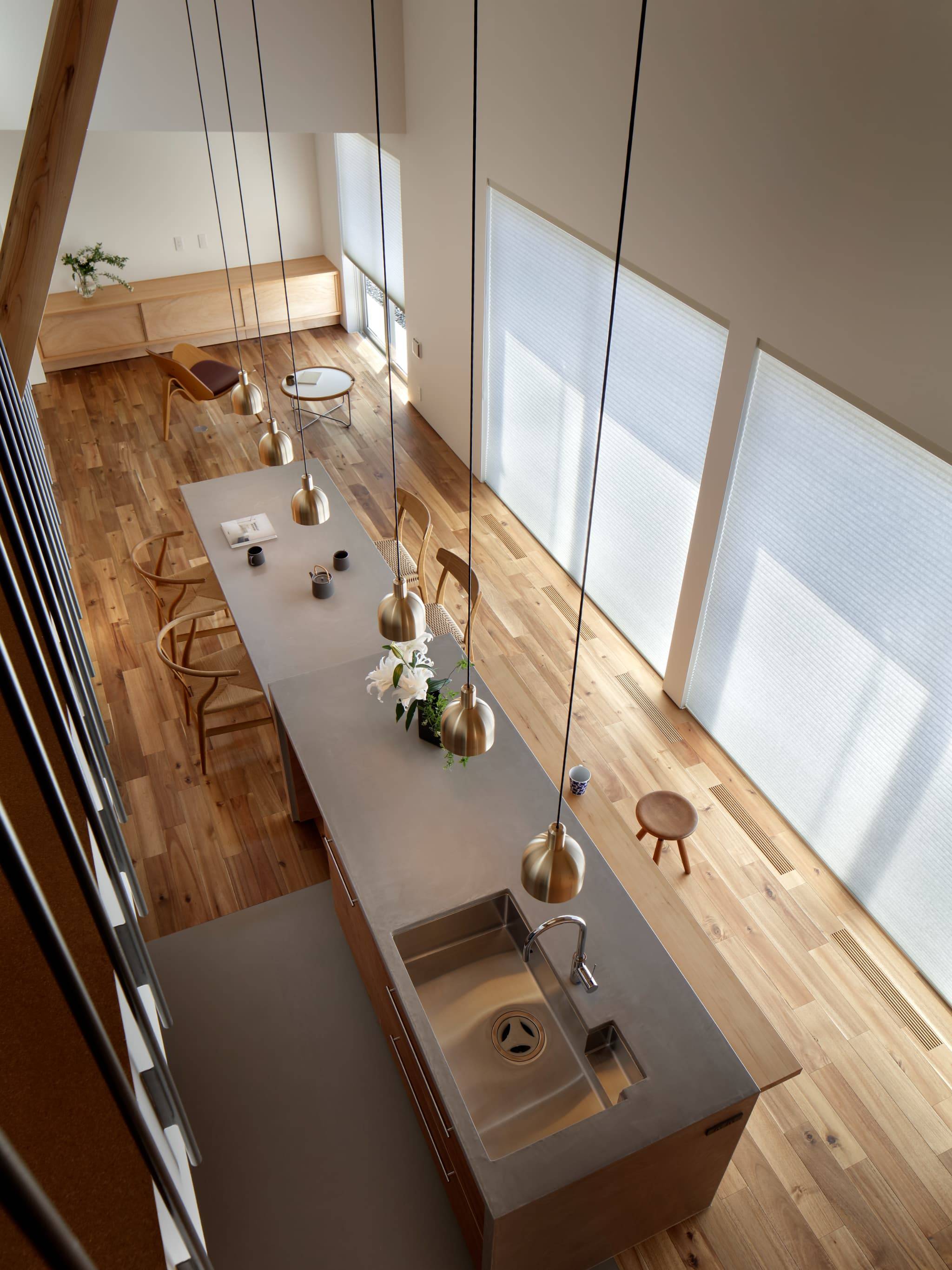 冬は基礎コンクリートの蓄熱性を利用した床下エアコンを稼働し、夏は2階から吹き抜けにエアコンの冷気を下ろす事で、空調の風を直接感じない心地よさを得る事ができました。