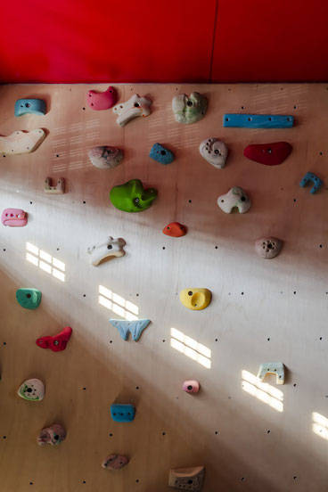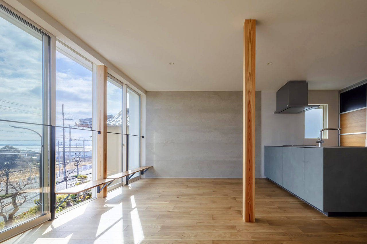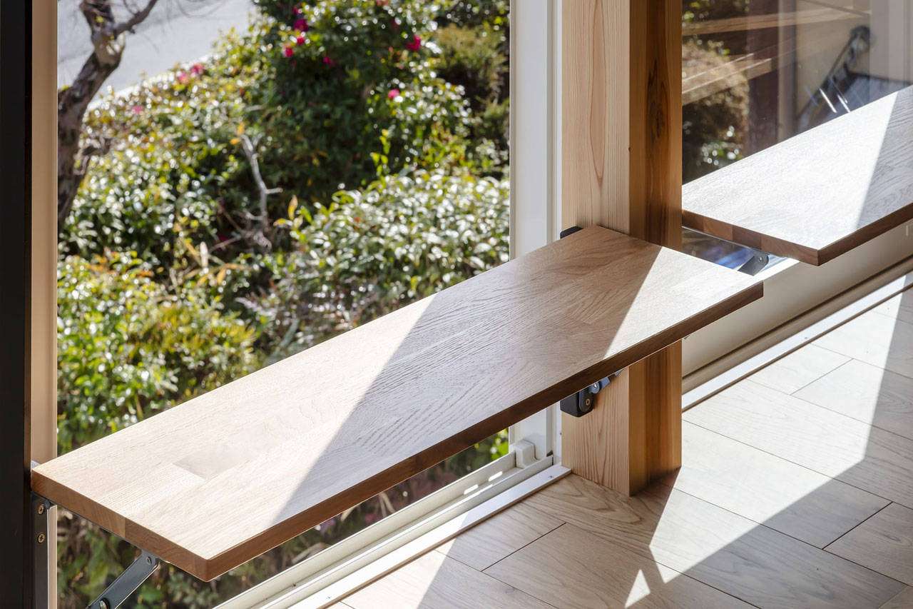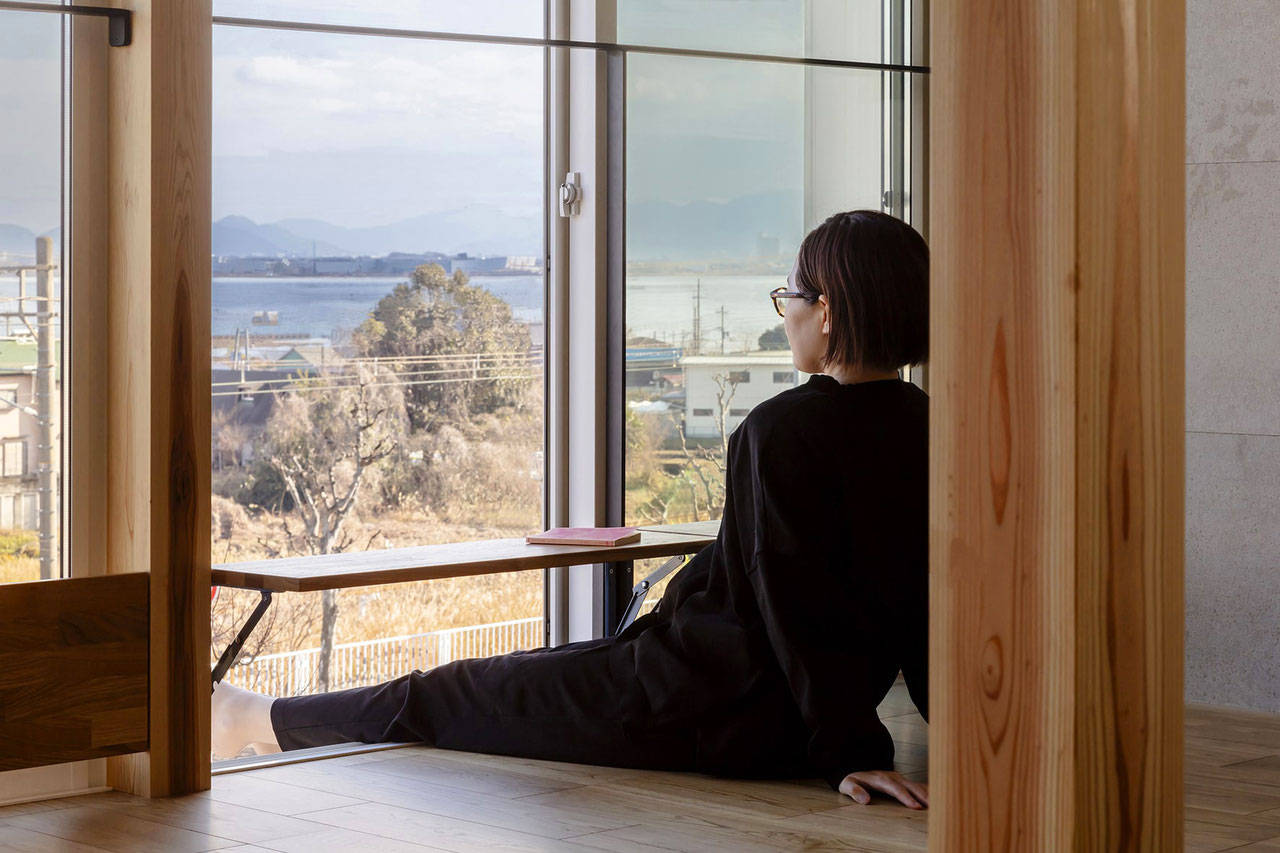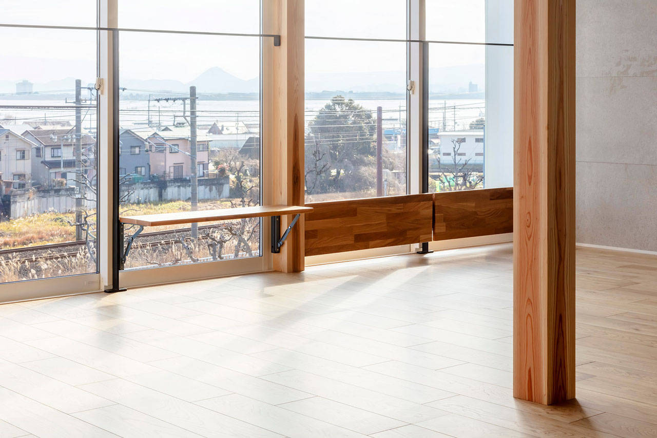 2階の窓辺に琵琶湖を望むちょっとした仕掛けをした。窓は風景と直接つながれるように大きめの引き戸として、ペットの落下防止を兼ねた折りたたみ式のローテーブルを設えた。ちゃぶ台のような高さで、琵琶湖に向かってぼーっとくつろぎながら書き物をしたり、ちょっとコーヒーを置いたりと自然と家族が定着するきっかけをささやかに添えた。構造は木造として、1階と2階の間を少しだけ束で持ち上げている。この束立てがバッファーとなって上下階の角度差を吸収し、造形的にも上下階がかみ込まない。