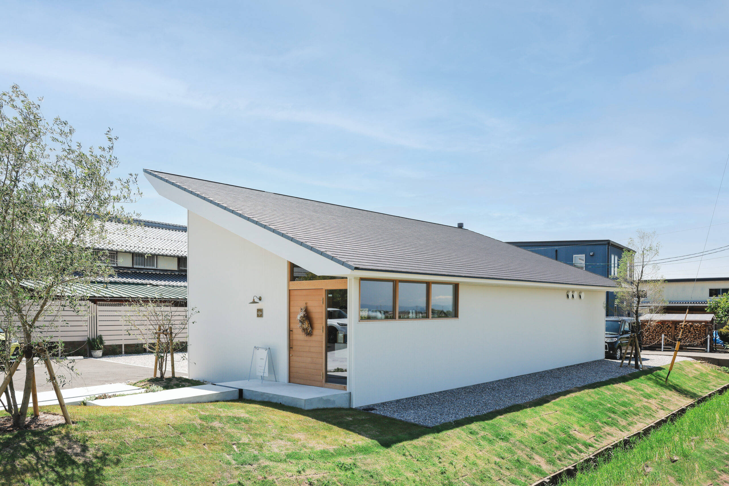白い外壁と、グレーの屋根は、周期に浸し見やすい形状でありながらインパクトを