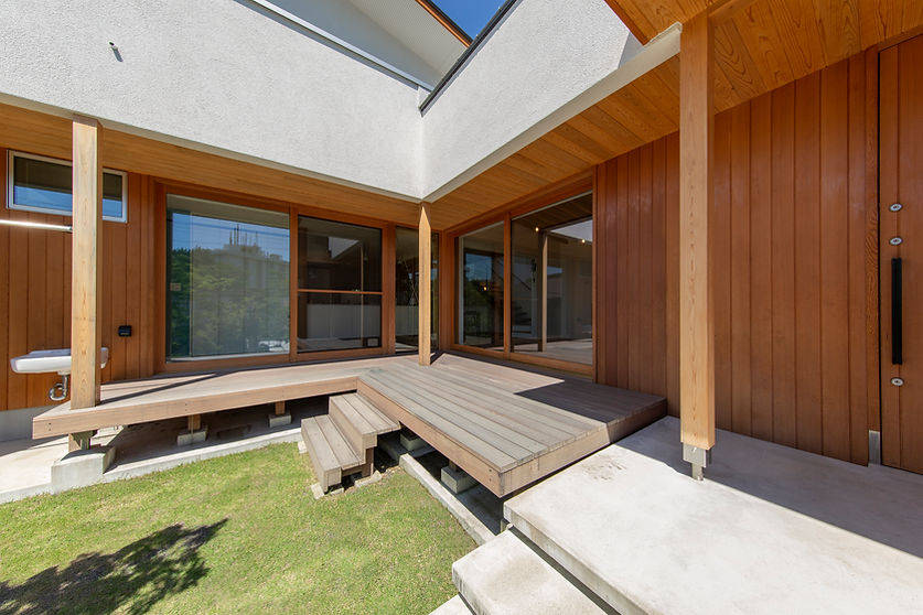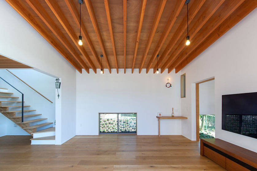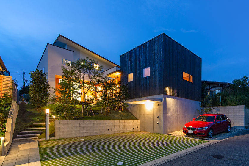 L字型プランを採用することにより、建物の一部を道路側に寄せ建物本体の基礎と擁壁を兼用することにしました。また、高低差もL字型プランによって生まれた、道路から玄関までの距離を長くする事により解消しました。